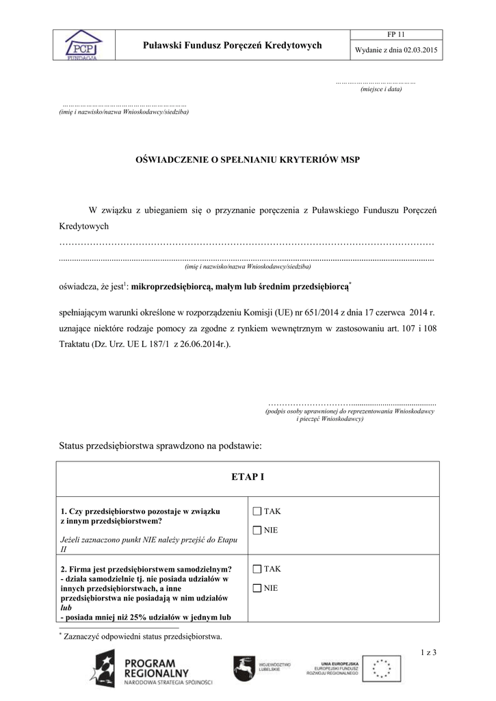 FP 11 Puławski Fundusz Poręczeń Kredytowych Wydanie z dnia 02.03.2015 ………..………………………… (miejsce i data) ……………………………………………………… (imię i nazwisko/nazwa Wnioskodawcy/siedziba) OŚWIADCZENIE O SPEŁNIANIU KRYTERIÓW MSP W związku z ubieganiem się o przyznanie poręczenia z Puławskiego Funduszu Poręczeń Kredytowych …………………………………………………………………………………………………………… .......................................................................................................................................................................... (imię i nazwisko/nazwa Wnioskodawcy/siedziba) oświadcza, że jest1: mikroprzedsiębiorcą, małym lub średnim przedsiębiorcą* spełniającym warunki określone w rozporządzeniu Komisji (UE) nr 651/2014 z dnia 17 czerwca 2014 r. uznające niektóre rodzaje pomocy za zgodne z rynkiem wewnętrznym w zastosowaniu art. 107 i 108 Traktatu (Dz. Urz. UE L 187/1 z 26.06.2014r.). …………………………......................................... (podpis osoby uprawnionej do reprezentowania Wnioskodawcy i pieczęć Wnioskodawcy) Status przedsiębiorstwa sprawdzono na podstawie: ETAP I 1. Czy przedsiębiorstwo pozostaje w związku z innym przedsiębiorstwem? TAK NIE Jeżeli zaznaczono punkt NIE należy przejść do Etapu II 2. Firma jest przedsiębiorstwem samodzielnym? - działa samodzielnie tj. nie posiada udziałów w innych przedsiębiorstwach, a inne przedsiębiorstwa nie posiadają w nim udziałów lub - posiada mniej niż 25% udziałów w jednym lub * TAK NIE Zaznaczyć odpowiedni status przedsiębiorstwa. 1z3 FP 11 Puławski Fundusz Poręczeń Kredytowych Wydanie z dnia 02.03.2015 kilku innych przedsiębiorstwach, a/lub inne przedsiębiorstwa posiadają, poniżej 25% udziałów w tym przedsiębiorstwie? Jeżeli zaznaczono punkt TAK należy przejść do Etapu II 3. Firma pozostaje w relacji przedsiębiorstw/ podmiotów partnerskich – posiada od 25% do 50% udziałów w jednym lub kilku innych przedsiębiorstwach, a/ lub inne przedsiębiorstwo posiada od 25% do 50% udziałów w tym przedsiębiorstwie? TAK NIE Jeżeli zaznaczono punkt TAK należy przejść do Etapu II 4. Firma pozostaje w relacji przedsiębiorstw/ podmiotów powiązanych – posiada powyżej 50% praw głosów w innym przedsiębiorstwie lub odwrotnie, a/lub inne przedsiębiorstwa posiadają powyżej 50% udziałów w tym przedsiębiorstwie? TAK NIE Jeżeli zaznaczono punkt TAK należy przejść do Etapu II ETAP II Dane stosowane do określenia kategorii MSP2 w ostatnim okresie obrachunkowym w poprzednim okresie obrachunkowym ………………… ………………. w okresie obrachunkowym za drugi rok wstecz od ostatniego okresu obrachunkowego ……………… 5. Wielkość zatrudnienia3 6. Przychody netto ze sprzedaży towarów, wyrobów, usług i operacji finansowych (w tys. EUR na koniec roku obrachunkowego według średniego kursu NBP na dzień sporządzania sprawozdania) 7. Suma aktywów bilansu (w tys. EUR na koniec roku obrachunkowego według średniego kursu NBP na dzień sporządzania sprawozdania) Świadoma/świadomy odpowiedzialności karnej za złożone oświadczenie, zgodnie z art. 297 § 1 Kodeksu Karnego, potwierdzam własnoręcznym podpisem prawdziwość danych zamieszczonych powyżej. …..………..…………………………................................. (podpis osoby uprawnionej do reprezentowania Wnioskodawcy i pieczęć Wnioskodawcy) Niepotrzebne skreślić Na kategorię mikroprzedsiębiorstw oraz małych i średnich przedsiębiorstw (MŚP) składają się przedsiębiorstwa, które zatrudniają mniej niż 250 pracowników i których roczny obrót nie przekracza 50 milionów EUR a/lub całkowity bilans roczny nie przekracza 43 milionów EUR. 1 2z3 FP 11 Puławski Fundusz Poręczeń Kredytowych Wydanie z dnia 02.03.2015 Za mikroprzedsiębiorstwo uznaje się przedsiębiorstwo zatrudniające mniej niż 10 pracowników i którego roczny obrót lub całkowity bilans roczny nie przekracza 2 milionów EUR. Przy obliczaniu progów finansowych określających status przedsiębiorstwa należy stosować pełny kurs EUR, tzn. 4 miejsca po przecinku. Za przedsiębiorstwo małe uznaje się przedsiębiorstwo zatrudniające mniej niż 50 pracowników i którego roczny obrót lub całkowity bilans roczny nie przekracza 10 milionów EUR. Przy obliczaniu progów finansowych określających status przedsiębiorstwa należy stosować pełny kurs EUR, tzn. 4 miejsca po przecinku. Za przedsiębiorstwo średnie uznaje się przedsiębiorstwo zatrudniające mniej niż 250 pracowników i którego roczny obrót nie przekracza 50 milionów EUR lub całkowity bilans roczny nie przekracza 43 milionów EUR. Przy obliczaniu progów finansowych określających status przedsiębiorstwa należy stosować pełny kurs EUR, tzn. 4 miejsca po przecinku. Uwaga: Dane niezbędne do ustalenia kategorii przedsiębiorstwa, ustala się zgodnie z pkt. 1-7 niniejszego oświadczenia. W przypadku, gdy Wnioskodawca pozostaje z innym przedsiębiorstwem w związku przedsiębiorstw partnerskich bądź powiązanych, dokonuje obliczenia odpowiednio skumulowanych danych tych przedsiębiorstw ze swoimi danymi w następujący sposób: W przypadku przedsiębiorstwa samodzielnego dane dotyczące liczby pracowników oraz dane dotyczące wielkości przychodów i całkowitego bilansu tego przedsiębiorstwa ustalane są wyłącznie na podstawie jego ksiąg rachunkowych, W przypadku przedsiębiorstw partnerskich, do danych przedsiębiorstwa Wnioskodawcy, dotyczących liczby pracowników oraz danych dotyczących wielkości przychodów i całkowitego bilansu, należy dodać dane każdego przedsiębiorstwa partnerskiego, znajdującego się bezpośrednio na wyższym lub niższym szczeblu rynku w stosunku do danego przedsiębiorstwa, proporcjonalnie do procentowego udziału w kapitale lub 