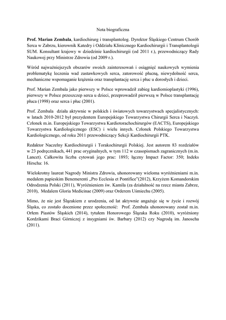 Nota biograficzna Prof. Marian Zembala, kardiochirurg i transplantolog. Dyrektor Śląskiego Centrum Chorób Serca w Zabrzu, kierownik Katedry i Oddziału Klinicznego Kardiochirurgii i Transplantologii SUM. Konsultant krajowy w dziedzinie kardiochirurgii (od 2011 r.), przewodniczący Rady Naukowej przy Ministrze Zdrowia (od 2009 r.). Wśród najważniejszych obszarów swoich zainteresowań i osiągnięć naukowych wymienia problematykę leczenia wad zastawkowych serca, zatorowość płucną, niewydolność serca, mechaniczne wspomaganie krążenia oraz transplantację serca i płuc u dorosłych i dzieci. Prof. Marian Zembala jako pierwszy w Polsce wprowadził zabieg kardiomioplastyki (1996), pierwszy w Polsce przeszczep serca u dzieci, przeprowadził pierwszą w Polsce transplantację płuca (1998) oraz serca i płuc (2001). Prof. Zembala działa aktywnie w polskich i światowych towarzystwach specjalistycznych: w latach 2010-2012 był prezydentem Europejskiego Towarzystwa Chirurgii Serca i Naczyń. Członek m.in. Europejskiego Towarzystwa Kardiotorachochirurgów (EACTS), Europejskiego Towarzystwa Kardiologicznego (ESC) i wielu innych. Członek Polskiego Towarzystwa Kardiologicznego, od roku 2011 przewodniczący Sekcji Kardiochirurgii PTK. Redaktor Naczelny Kardiochirurgii i Torakochirurgii Polskiej. Jest autorem 83 rozdziałów w 23 podręcznikach, 441 prac oryginalnych, w tym 112 w czasopismach zagranicznych (m.in. Lancet). Całkowita liczba cytowań jego prac: 1893; łączny Impact Factor: 350; Indeks Hirscha: 16. Wielokrotny laureat Nagrody Ministra Zdrowia, uhonorowany wieloma wyróżnieniami m.in. medalem papieskim Benemerenti „Pro Ecclesia et Pontifice”(2012), Krzyżem Komandorskim Odrodzenia Polski (2011), Wyróżnieniem św. Kamila (za działalność na rzecz miasta Zabrze, 2010), Medalem Gloria Medicinae (2009) oraz Orderem Uśmiechu (2005). Mimo, że nie jest Ślązakiem z urodzenia, od lat aktywnie angażuje się w życie i rozwój Śląska, co zostało docenione przez społeczność: Prof. Zembala uhonorowany został m.in. Orłem Piastów Śląskich (2014), tytułem Honorowego Ślązaka Roku (2010), wyróżniony Kordzikami Braci Górniczej z insygniami św. Barbary (2012) czy Nagrodą im. Janoscha (2011).