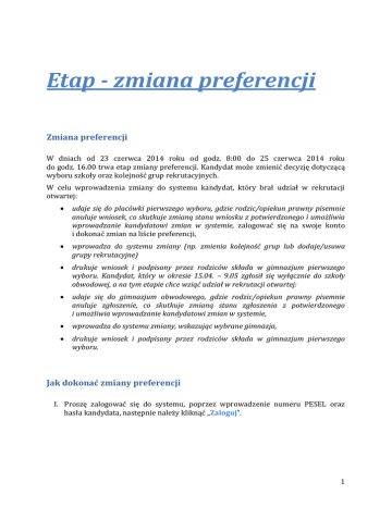 Etap - zmiana preferencji Zmiana preferencji W dniach od 23 czerwca 2014 roku od godz. 8:00 do 25 czerwca 2014 roku do godz. 16.00 trwa etap zmiany preferencji. Kandydat może zmienić decyzję dotyczącą wyboru szkoły oraz kolejność grup rekrutacyjnych. W celu wprowadzenia zmiany do systemu kandydat, który brał udział w rekrutacji otwartej: udaje się do placówki pierwszego wyboru, gdzie rodzic/opiekun prawny pisemnie anuluje wniosek, co skutkuje zmianą stanu wniosku z potwierdzonego i umożliwia wprowadzanie kandydatowi zmian w systemie, zalogować się na swoje konto i dokonać zmian na liście preferencji, wprowadza do systemu zmiany (np. zmienia kolejność grup lub dodaje/usuwa grupy rekrutacyjne) drukuje wniosek i podpisany przez rodziców składa w gimnazjum pierwszego wyboru. Kandydat, który w okresie 15.04. – 9.05 zgłosił się wyłącznie do szkoły obwodowej, a na tym etapie chce wziąć udział w rekrutacji otwartej: udaje się do gimnazjum obwodowego, gdzie rodzic/opiekun prawny pisemnie anuluje zgłoszenie, co skutkuje zmianą stanu zgłoszenia z potwierdzonego i umożliwia wprowadzanie kandydatowi zmian w systemie, wprowadza do systemu zmiany, wskazując wybrane gimnazja, drukuje wniosek i podpisany przez rodziców składa w gimnazjum pierwszego wyboru. Jak dokonać zmiany preferencji I. Proszę zalogować się do systemu, poprzez wprowadzenie numeru PESEL oraz hasła kandydata, następnie należy kliknąć „Zaloguj”. 1 Po zalogowaniu wyświetla się komunikat „Wniosek niepotwierdzony. Po wprowadzeniu zmian należy wydrukować, podpisać wniosek i udać się do szkoły pierwszego wyboru”. II. Następnie proszę wybrać zakładkę „Lista preferencji”. W trakcie etapu „zmiany preferencji” można dokonać następujących czynności: 1) 2) 3) 4) zmienić kolejność grup rekrutacyjnych w wybranych szkołach, dodać grupę rekrutacyjną do wybranej wcześniej szkoły, usunąć grupę rekrutacyjną w wybranej wcześniej szkole , dodać nową grupę rekrutacyjną, 2 1) Zmiana kolejności grup rekrutacyjnych w wybranych szkołach: Proszę skorzystać z przycisków „góra” / „dół”. Aby przejść do kolejnego kroku należy wybrać „Dalej”. 2) Dodawanie grupy rekrutacyjnej do wybranej szkoły: Proszę wybrać kolejno z listy rozwijalnej: Gimnazjum Grupę rekrutacyjną i nacisnąć „+ Dodaj” 3 Wybrane gimnazjum oraz grupa rekrutacyjna pojawi się na liście priorytetów. Przy każdej wybranej grupie rekrutacyjnej należy wskazać: Aby przejść do kolejnego etapu wprowadzania zmian we wniosku należy wybrać „Dalej” 3) Usuwanie grupy rekrutacyjnej w wybranej szkole: Zaznaczyć ikonę kosza przy odpowiedniej grupie rekrutacyjnej 4 UWAGA! Aby usunąć informację o posiadanym orzeczeniu o potrzebie kształcenia specjalnego wydanego z tytułu niepełnosprawności, należy najpierw usunąć wszystkie grupy integracyjne (część integracyjna), następnie odznaczyć informację „posiadam orzeczenie o potrzebie kształcenia specjalnego wydane z tytułu niepełnosprawności”. Następnie przejść do kolejnego kroku należy wybrać „Dalej”. 4) Dodawanie nowej grupy rekrutacyjnej: Proszę wybrać kolejno z listy rozwijalnej: Gimnazjum Grupę rekrutacyjną i nacisnąć „+ Dodaj” Wybrane gimnazjum oraz grupa rekrutacyjna pojawi się na liście priorytetów. Aby przejść do kolejnego etapu wprowadzania zmian we wniosku należy wybrać „Dalej”. III. Jeżeli kandydat dodał gimnazjum na listę preferencji w panelu „Pouczenia” będzie musiał zapoznać się i zaakceptować regulamin dodanej szkoły. 5 Jeśli nie zostanie zaznaczona którakolwiek z opcji „zapoznałam/zapoznałem i akceptuję” nie będzie możliwe przejście do ostatniego etapu wprowadzania wniosku. Wówczas zostanie wyświetlony komunikat W panelu pouczeń zostaną wyświetlone na czerwono komunikaty informujące o przyczynie błędu, np.: Po zaakceptowaniu regulaminów należy przejść do kolejnego etapu przyciskiem „Dalej”. IV. W „Panelu podsumowania” proszę sprawdzić poprawność wprowadzonych informacji. Uwaga! Jeżeli zaistnieje konieczność zmiany wprowadzonych danych, należy skorzystać z odpowiedniego przycisku „Powrót do...”, który pozwoli kandydatowi powrócić do właściwego pola. 6 Wprowadzone informacje można edytować do momentu złożenia i zatwierdzenia wniosku przez dyrektora gimnazjum. Jeżeli wszystkie dane są poprawne, proszę nacisnąć „Zapisz”. V. Plik wniosku generowany jest w formacie PDF. Należy go pobrać, zapisać na dysku, a następnie wydrukować. Po wydrukowaniu wniosku nie można wprowadzać zmian w systemie. Jeśli kandydat wprowadzi zmiany musi ponownie pobrać plik wniosku, zapisać na dysku, a następnie wydrukować. 7 Następnie należy wydrukować wniosek, podpisać i zanieść do gimnazjum znajdującego na pierwszym miejscu listy preferencji. Wniosek należy złożyć do 25 czerwca 2014 roku do godziny 16:00. Szkoła pierwszego wyboru zatwierdzi wniosek, jeżeli dane kandydata wprowadzone w systemie będą zgodne z papierowym wydrukiem wniosku. 8