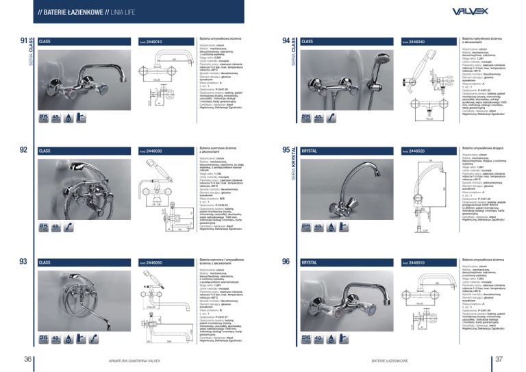 Bateria umywalkowa ścienna kod: 2446010 200 150±20 G1/2" 94 Wykończenie: chrom Bateria: mechaniczna, dwuuchwytowa, naścienna, z ruchomą wylewką Waga netto: 0,995 Użyte materiały: mosiądz Parametry pracy: zalecane ciśnienie robocze 1÷5 bar; max. temperatura robocza +90°C Sposób montażu: dwuotworowy Element sterujący: głowice suwakowe Klasa przepływu: A Il. szt.: 1 Opakowanie: P-2441.00 Opakowanie zawiera: baterię, pakiet montażowy (rozety, mimośrody, uszczelki), instrukcję obsługi i montażu, kartę gwarancyjną Certyfikaty i deklaracje: Atest Higieniczny, Deklaracja Zgodności 45 CLASS Bateria natryskowa ścienna z akcesoriami kod: 2446040 Wykończenie: chrom Bateria: mechaniczna, dwuuchwytowa, naścienna Waga netto: 1,261 Użyte materiały: mosiądz Parametry pracy: zalecane ciśnienie robocze 1÷5 bar; max. temperatura robocza +90°C Sposób montażu: dwuotworowy Element sterujący: głowice suwakowe Klasa przepływu: A Il. szt.: 1 Opakowanie: P-2441.02 Opakowanie zawiera: baterię, pakiet montażowy (rozety, mimośrody, uszczelki), słuchawkę, uchwyt punktowy, węża natryskowego 1500 mm, instrukcję obsługi i montażu, kartę gwarancyjną Certyfikaty i deklaracje: Atest Higieniczny, Deklaracja Zgodności G1/2" CLASS SERIA CLASS 91 SERIA CLASS // BATERIE ŁAZIENKOWE // LINIA LIFE 45 Bateria wannowa ścienna z akcesoriami 70 65 G1/2" 150 ±20 45 93 CLASS 100 ~145 G1/2 65 150±20 45 36 ARMATURA SANITARNA VALVEX Wykończenie: chrom Bateria: mechaniczna, dwuuchwytowa, naścienna, ze stałą wylewką, z przełącznikiem wanna/ natrysk Waga netto: 1,706 Użyte materiały: mosiądz Parametry pracy: zalecane ciśnienie robocze 1÷5 bar; max. temperatura robocza +90°C Sposób montażu: dwuotworowy Element sterujący: głowice suwakowe Klasa przepływu: B/B Il. szt.: 1 Opakowanie: P-2446.03 Opakowanie zawiera: baterię, pakiet montażowy (rozety, mimośrody, uszczelki), słuchawkę, węża natryskowego 1500 mm, instrukcję obsługi i montażu, kartę gwarancyjną Certyfikaty i deklaracje: Atest Higieniczny, Deklaracja Zgodności Bateria wannowa / umywalkowa ścienna z akcesoriami kod: 2446050 350 95 KRYSTAL Bateria umywalkowa stojąca kod: 2446520 140 200 kod: 2446030 Ø35 max 40 CLASS Wykończenie: chrom Bateria: mechaniczna, dwuuchwytowa, stojąca, z ruchomą wylewką Waga netto: 1,061 Użyte materiały: mosiądz Parametry pracy: zalecane ciśnienie robocze 1÷5 bar; max. temperatura robocza +90°C Sposób montażu: jednootworowy Element sterujący: głowice suwakowe Klasa przepływu: A Il. szt.: 1 Opakowanie: P-2441.00 Opakowanie zawiera: baterię, wężyki przyłączeniowe G3/8”-M10x1 L=350mm, pakiet montażowy, instrukcję obsługi i montażu, kartę gwarancyjną Certyfikaty i deklaracje: Atest Higieniczny, Deklaracja Zgodności G3/8" 96 KRYSTAL Bateria umywalkowa ścienna kod: 2446510 Wykończenie: chrom Bateria: mechaniczna, dwuuchwytowa, naścienna, z ruchomą wylewką, z przełącznikiem wanna/natrysk Waga netto: 1,697 Użyte materiały: mosiądz Parametry pracy: zalecane ciśnienie robocze 1÷5 bar; max. temperatura robocza +90°C Sposób montażu: dwuotworowy Element sterujący: głowice suwakowe Klasa przepływu: B Il. szt.: 1 Opakowanie: P-2441.07 Opakowanie zawiera: baterię, pakiet montażowy (rozety, mimośrody, uszczelki), słuchawkę, węża natryskowego 1500 mm, instrukcję obsługi i montażu, kartę gwarancyjną Certyfikaty i deklaracje: Atest Higieniczny, Deklaracja Zgodności 200 150±20 G1/2" 92 SERIA KRYSTAL 150 ±20 BATERIE ŁAZIENKOWE 45 Wykończenie: chrom Bateria: mechaniczna, dwuuchwytowa, naścienna, z ruchomą wylewką Waga netto: 1,053 Użyte materiały: mosiądz Parametry pracy: zalecane ciśnienie robocze 1÷5 bar; max. temperatura robocza +90°C Sposób montażu: dwuotworowy Element sterujący: głowice suwakowe Klasa przepływu: A Il. szt.: 1 Opakowanie: P-2441.00 Opakowanie zawiera: baterię, pakiet montażowy (rozety, mimośrody, uszczelki), instrukcję obsługi i montażu, kartę gwarancyjną Certyfikaty i deklaracje: Atest Higieniczny, Deklaracja Zgodności 37