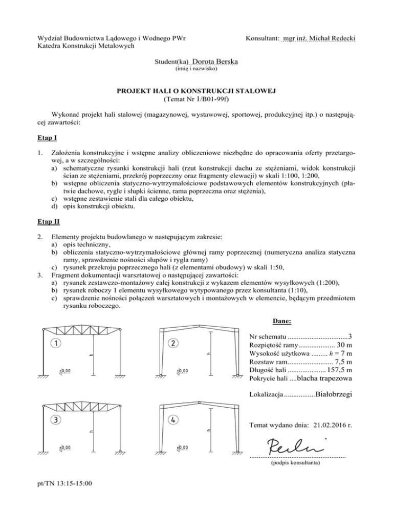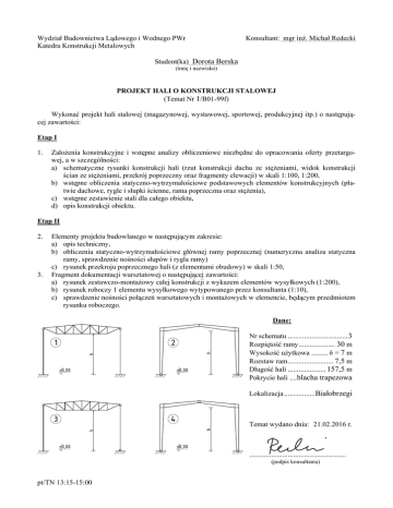 Wydział Budownictwa Lądowego i Wodnego PWr Katedra Konstrukcji Metalowych Konsultant: mgr inż. Michał Redecki Student(ka) Dorota Berska (imię i nazwisko) PROJEKT HALI O KONSTRUKCJI STALOWEJ (Temat Nr 1/B01-99f) Wykonać projekt hali stalowej (magazynowej, wystawowej, sportowej, produkcyjnej itp.) o następującej zawartości: Etap I 1. Założenia konstrukcyjne i wstępne analizy obliczeniowe niezbędne do opracowania oferty przetargowej, a w szczególności: a) schematyczne rysunki konstrukcji hali (rzut konstrukcji dachu ze stężeniami, widok konstrukcji ścian ze stężeniami, przekrój poprzeczny oraz fragmenty elewacji) w skali 1:100, 1:200, b) wstępne obliczenia statyczno-wytrzymałościowe podstawowych elementów konstrukcyjnych (płatwie dachowe, rygle i słupki ścienne, rama poprzeczna oraz stężenia), c) wstępne zestawienie stali dla całego obiektu, d) opis konstrukcji obiektu. Etap II 2. 3. Elementy projektu budowlanego w następującym zakresie: a) opis techniczny, b) obliczenia statyczno-wytrzymałościowe głównej ramy poprzecznej (numeryczna analiza statyczna ramy, sprawdzenie nośności słupów i rygla ramy) c) rysunek przekroju poprzecznego hali (z elementami obudowy) w skali 1:50, Fragment dokumentacji warsztatowej o następującej zawartości: a) rysunek zestawczo-montażowy całej konstrukcji z wykazem elementów wysyłkowych (1:200), b) rysunek roboczy 1 elementu wysyłkowego wytypowanego przez konsultanta (1:10), c) sprawdzenie nośności połączeń warsztatowych i montażowych w elemencie, będącym przedmiotem rysunku roboczego. Dane: Nr schematu ................................. 3 Rozpiętość ramy .................... 30 m Wysokość użytkowa ......... h = 7 m Rozstaw ram ......................... 7,5 m Długość hali ..................... 157,5 m Pokrycie hali ....blacha trapezowa Lokalizacja .................Białobrzegi Temat wydano dnia: 21.02.2016 r. ..................................................... (podpis konsultanta) pt/TN 13:15-15:00 Wydział Budownictwa Lądowego i Wodnego PWr Katedra Konstrukcji Metalowych Konsultant: mgr inż. Michał Redecki Student(ka) Anna Maria Dybaś (imię i nazwisko) PROJEKT HALI O KONSTRUKCJI STALOWEJ (Temat Nr 2/B01-99f) Wykonać projekt hali stalowej (magazynowej, wystawowej, sportowej, produkcyjnej itp.) o następującej zawartości: Etap I 1. Założenia konstrukcyjne i wstępne analizy obliczeniowe niezbędne do opracowania oferty przetargowej, a w szczególności: a) schematyczne rysunki konstrukcji hali (rzut konstrukcji dachu ze stężeniami, widok konstrukcji ścian ze stężeniami, przekrój poprzeczny oraz fragmenty elewacji) w skali 1:100, 1:200, b) wstępne obliczenia statyczno-wytrzymałościowe podstawowych elementów konstrukcyjnych (płatwie dachowe, rygle i słupki ścienne, rama poprzeczna oraz stężenia), c) wstępne zestawienie stali dla całego obiektu, d) opis konstrukcji obiektu. Etap II 2. 3. Elementy projektu budowlanego w następującym zakresie: a) opis techniczny, b) obliczenia statyczno-wytrzymałościowe głównej ramy poprzecznej (numeryczna analiza statyczna ramy, sprawdzenie nośności słupów i rygla ramy) c) rysunek przekroju poprzecznego hali (z elementami obudowy) w skali 1:50, Fragment dokumentacji warsztatowej o następującej zawartości: a) rysunek zestawczo-montażowy całej konstrukcji z wykazem elementów wysyłkowych (1:200), b) rysunek roboczy 1 elementu wysyłkowego wytypowanego przez konsultanta (1:10), c) sprawdzenie nośności połączeń warsztatowych i montażowych w elemencie, będącym przedmiotem rysunku roboczego. Dane: Nr schematu ................................. 2 Rozpiętość ramy .................... 27 m Wysokość użytkowa ....... h = 10 m Rozstaw ram ......................... 4,5 m Długość hali ........................ 108 m Pokrycie hali ....blacha trapezowa Lokalizacja ........... Biała Podlaska Temat wydano dnia: 21.02.2016 r. ..................................................... (podpis konsultanta) pt/TN 13:15-15:00 Wydział Budownictwa Lądowego i Wodnego PWr Katedra Konstrukcji Metalowych Konsultant: mgr inż. Michał Redecki Student(ka) Kamil Grabowski (imię i nazwisko) PROJEKT HALI O KONSTRUKCJI STALOWEJ (Temat Nr 3/B01-99f) Wykonać projekt hali stalowej (magazynowej, wystawowej, sportowej, produkcyjnej itp.) o następującej zawartości: Etap I 1. Założenia konstrukcyjne i wstępne analizy obliczeniowe niezbędne do opracowania oferty przetargowej, a w szczególności: a) schematyczne rysunki konstrukcji hali (rzut konstrukcji dachu ze stężeniami, widok konstrukcji ścian ze stężeniami, przekrój poprzeczny oraz fragmenty elewacji) w skali 1:100, 1:200, b) wstępne obliczenia statyczno-wytrzymałościowe podstawowych elementów konstrukcyjnych (płatwie dachowe, rygle i słupki ścienne, rama poprzeczna oraz stężenia), c) wstępne zestawienie stali dla całego obiektu, d) opis konstrukcji obiektu. Etap II 2. 3. Elementy projektu budowlanego w następującym zakresie: a) opis techniczny, b) obliczenia statyczno-wytrzymałościowe głównej ramy poprzecznej (numeryczna analiza statyczna ramy, sprawdzenie nośności słupów i rygla ramy) c) rysunek przekroju poprzecznego hali (z elementami obudowy) w skali 1:50, Fragment dokumentacji warsztatowej o następującej zawartości: a) rysunek zestawczo-montażowy całej konstrukcji z wykazem elementów wysyłkowych (1:200), b) rysunek roboczy 1 elementu wysyłkowego wytypowanego przez konsultanta (1:10), c) sprawdzenie nośności połączeń warsztatowych i montażowych w elemencie, będącym przedmiotem rysunku roboczego. Dane: Nr schematu ................................. 1 Rozpiętość ramy .................... 15 m Wysokość użytkowa ......... h = 7 m Rozstaw ram ............................. 6 m Długość hali ........................ 150 m Pokrycie hali ....blacha trapezowa Lokalizacja ................... Oświęcim Temat wydano dnia: 21.02.2016 r. .............