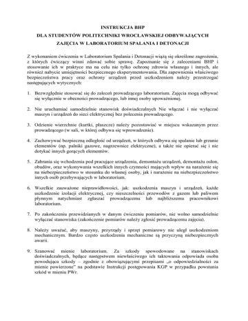 INSTRUKCJA BHP DLA STUDENTÓW POLITECHNIKI WROCŁAWSKIEJ ODBYWAJĄCYCH ZAJĘCIA W LABORATORIUM SPALANIA I DETONACJI Z wykonaniem ćwiczenia w Laboratorium Spalania i Detonacji wiążą się określone zagrożenia, z których ćwiczący winni zdawać sobie sprawę. Zapoznanie się z zaleceniami BHP i stosowanie ich w praktyce ma na celu nie tylko ochronę zdrowia własnego i innych, ale również nabycie umiejętności bezpiecznego eksperymentowania. Dla zapewnienia właściwego bezpieczeństwa pracy oraz ochrony urządzeń przed uszkodzeniem należy przestrzegać następujących wytycznych: 1. Bezwzględnie stosować się do zaleceń prowadzącego laboratorium. Zajęcia mogą odbywać się wyłącznie w obecności prowadzącego, lub innej osoby upoważnionej. 2. Nie uruchamiać samodzielnie stanowisk doświadczalnych Nie włączać i nie wyłączać maszyn i urządzeń do sieci elektrycznej bez polecenia prowadzącego. 3. Odzienie wierzchnie (kurtki, płaszcze) należy pozostawiać w miejscu wskazanym przez prowadzącego (w sali, w której odbywa się wprowadzenie). 4. Zachowywać bezpieczną odległość od urządzeń, w których odbywa się spalanie lub grzanie elementów (np. palniki gazowe, nagrzewnice elektryczne), a także nie opierać się i nie dotykać innych gorących elementów. 5. Zabrania się wchodzenia pod pracujące urządzenia, demontażu urządzeń, demontażu osłon, obudów, oraz wykonywania wszelkich innych czynności mających wpływ na narażenie się na niebezpieczeństwo w stosunku do własnej osoby, jak i narażenie na niebezpieczeństwo innych osób przebywających w laboratorium. 6. Wszelkie zauważone nieprawidłowości, jak: uszkodzenia maszyn i urządzeń, każde uszkodzenie izolacji elektrycznej, czy nieszczelności przewodów z gazem lub paliwem płynnym natychmiast zgłaszać prowadzącemu lub najbliższemu pracownikowi laboratorium. 7. Po zakończeniu przewidzianych w danym ćwiczeniu pomiarów, nie wolno samodzielnie wyłączać stanowiska (zakończenie pomiarów należy zgłosić prowadzącemu zajęcia). 8. Należy uważać, aby maszyny, przyrządy i sprzęt pomiarowy nie uległ uszkodzeniom mechanicznym. Bardzo często uszkodzenia mechaniczne są przyczyną niebezpiecznych awarii. 9. Szanować mienie laboratorium. Za szkody spowodowane na stanowiskach doświadczalnych, będące następstwem niewłaściwego ich taktowania odpowiada osoba powodująca szkody – zgodnie z obowiązującymi przepisami „o odpowiedzialności za mienie powierzone” na podstawie Instrukcji postępowania KGP w przypadku powstania szkód w mieniu PWr. INSTRUKCJA POSTĘPOWANIA W PRZYPADKU ZAISTNIENIA PORAŻENIA OSÓB PRĄDEM ELEKTRYCZNYM W przypadku porażenia osób prądem elektrycznym należy natychmiast podjąć działanie mające na celu udzielenie pomocy. Możliwości uratowania osoby porażonej szybko spadają w miarę upływu czasu. Podjęcie akcji ratowniczej w pierwszej minucie po porażeniu daje 98% pewności uratowania życia. Po trzech minutach jest 72%, po pięciu minutach 26%, po ośmiu minutach 5%. W czasie ratowania należy działać SZYBKO- bez straty czasu na poszukiwanie osób mogących udzielić pomocy i przyglądanie się porażonemu, SPRAWNIE wykonywać czynności zamierzone i celowe, SPOKOJNIE bez wpadania w panikę. 1. Porażonego trzeba natychmiast uwolnić spod działania prądu elektrycznego zachowując środki ostrożności dla własnego bezpieczeństwa: - wyłączyć wyłącznikiem na stanowisku napięcie dla właściwego obwodu elektrycznego lub odłączyć przewody zasilające. 2. Jeśli wyłączenie napięcia trwałoby zbyt długo, względnie byłoby trudniejsze i niebezpieczniejsze wówczas zachowując środki ostrożności dla własnego bezpieczeństwa trzeba izolować porażonego spod działania prądu elektrycznego przez: - podsunięcie pod nogi porażonego materiału izolacyjnego w przypadku przepływu prądu przez ciało porażonego od ręki do nóg z jednoczesnym zaciśnięciem dłoni na urządzeniu będącym pod napięciem lub podkładanie materiału izolacyjnego pod kolejno odginane palce jednej dłoni w przypadku przepływu prądu od jednej ręki do drugiej (podłoże izolowane). 3. Przy uwalnianiu osób porażonych spod działania prądu elektrycznego o napięciu do 1 kV trzeba stosować dla własnej ochrony podstawowe materiały izolacyjne , którymi są rękawice gumowe, buty, dywanik, drążki itp. Można również stosować materiały izolacyjne zastępcze jak suche drewno, tworzywa, suche materiały tekstylne itp. 4. Bezpośrednio po uwolnieniu porażonego spod napięcia sprawdzić czy u porażonego występuje krwawienie (jeśli tak, to wykonać czynności dla jego zatrzymania) oraz czy nie ma w jamie ustnej obcych ciał (jeśli tak, to usunąć je za pomocą chustki). 5. Porażony powinien otrzymać pomoc przedlekarską. Jeśli: - porażony jest przytomny- rozluźnić ubranie w okolicach szyi, klatki piersiowej i brzucha oraz ułożyć wygodnie porażonego, odnieść porażonego do lekarza lub wezwać lekarza na miejsce wypadku, do chwili zabrania porażonego przez lekarza porażony powinien leżeć. - porażony jest nieprzytomny , ale oddycha – nie wolno nieprzytomnego zostawić ani na chwilę w pozycji na wznak, należy ułożyć go na boku, rozluźnić ubranie, nie wolno odstępować porażonego, albowiem może nastąpić zatrzymanie oddechu, natychmiast wezwać lekarza, - porażony jest nieprzytomny , nie oddycha- przystąpić natychmiast do stosowania sztucznego oddychania, w przypadku zatrzymania krążenia stosować masaż serca. Natychmiast wezwać Lekarza Zakładowej Służby Zdrowia, a w razie nieobecności lekarza wezwać pogotowie ratunkowe nr tel. 999. 2 INSTRUKCJA POSTĘPOWANIA W PRZYPADKU POWSTANIA POŻARU 1. W przypadku powstawania pożaru należy: a) zaalarmować niezwłocznie przy użyciu wszelkich dostępnych środków: Straż pożarną – nr tel. 998, Zarządzającego – Dyrektora Administracyjnego obiek