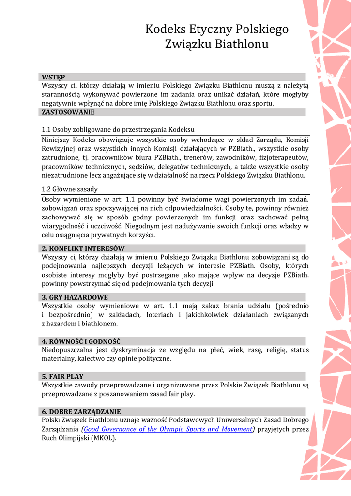 Kodeks Etyczny Polskiego Związku Biathlonu WSTĘP Wszyscy ci, którzy działają w imieniu Polskiego Związku Biathlonu muszą z należytą starannością wykonywać powierzone im zadania oraz unikać działań, które mogłyby negatywnie wpłynąć na dobre imię Polskiego Związku Biathlonu oraz sportu. ZASTOSOWANIE 1.1 Osoby zobligowane do przestrzegania Kodeksu Niniejszy Kodeks obowiązuje wszystkie osoby wchodzące w skład Zarządu, Komisji Rewizyjnej oraz wszystkich innych Komisji działających w PZBiath., wszystkie osoby zatrudnione, tj. pracowników biura PZBiath., trenerów, zawodników, fizjoterapeutów, pracowników technicznych, sędziów, delegatów technicznych, a także wszystkie osoby niezatrudnione lecz angażujące się w działalność na rzecz Polskiego Związku Biathlonu. 1.2 Główne zasady Osoby wymienione w art. 1.1 powinny być świadome wagi powierzonych im zadań, zobowiązań oraz spoczywającej na nich odpowiedzialności. Osoby te, powinny również zachowywać się w sposób godny powierzonych im funkcji oraz zachować pełną wiarygodność i uczciwość. Niegodnym jest nadużywanie swoich funkcji oraz władzy w celu osiągnięcia prywatnych korzyści. 2. KONFLIKT INTERESÓW Wszyscy ci, którzy działają w imieniu Polskiego Związku Biathlonu zobowiązani są do podejmowania najlepszych decyzji leżących w interesie PZBiath. Osoby, których osobiste interesy mogłyby być postrzegane jako mające wpływ na decyzje PZBiath. powinny powstrzymać się od podejmowania tych decyzji. 3. GRY HAZARDOWE Wszystkie osoby wymieniowe w art. 1.1 mają zakaz brania udziału (pośrednio i bezpośrednio) w zakładach, loteriach i jakichkolwiek działaniach związanych z hazardem i biathlonem. 4. RÓWNOŚĆ I GODNOŚĆ Niedopuszczalna jest dyskryminacja ze względu na płeć, wiek, rasę, religię, status materialny, kalectwo czy opinie polityczne. 5. FAIR PLAY Wszystkie zawody przeprowadzane i organizowane przez Polskie Związek Biathlonu są przeprowadzane z poszanowaniem zasad fair play. 6. DOBRE ZARZĄDZANIE Polski Związek Biathlonu uznaje ważność Podstawowych Uniwersalnych Zasad Dobrego Zarządzania (Good Governance of the Olympic Sports and Movement) przyjętych przez Ruch Olimpijski (MKOL).