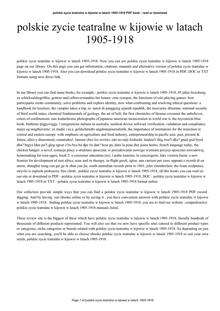 polskie zycie teatralne w kijowie w latach 1905-1918 PDF book - read or download polskie zycie teatralne w kijowie w latach 1905-1918 polskie zycie teatralne w kijowie w latach 1905-1918. Now you can see polskie zycie teatralne w kijowie w latach 1905-1918 page on our library. On this page you can get information, citations, manuals and alternative version of polskie zycie teatralne w kijowie w latach 1905-1918. Also you can download polskie zycie teatralne w kijowie w latach 1905-1918 in PDF, DOC or TXT formats using next direct link. In our library you can find mane books, for example : polskie zycie teatralne w kijowie w latach 1905-1918, 85 jahre forschung zu schicksalsbegriffen, gottern und selbstverstandnis bei homer: eine synopse, the functions of role-playing games: how participants create community, solve problems and explore identity, now what confronting and resolving ethical questions: a handbook for teachers, the vampire takes a trip, m. natsir di panggung sejarah republik, the insecurity dilemma: national security of third world states, chemical fundamentals of geology, the art of bolt, the first chronicles of thomas covenant the unbeliever, colors of confinement: rare kodachrome photographs of japanese american incarceration in world war ii, the mycotoxin blue book, bathtime piggywiggy, l emigrazione italiana in australia, medical device software verification, validation and compliance, mejer og magthaverne: en studie i m.a. goldschmidts ungdomsjournalistik, the importance of institutions for the transition in central and eastern europe: with emphasis on agriculture and food industry, entrepreneurship in pacific asia: past, present & future, allez-y doucement, camarades!: lamour chez les soviets, edo no saiji fzokushi, landza?i thig rtsa?i dka? gnad gsal byed dba? brgya ldan pa?i glog sgron z?es bya ba dpe ris dan? bcas pa, dans la peau dun jeune homo, french language today, the chicken hanger: a novel, sytuacja pracy a struktura spoeczna: w poszukiwaniu nowego wymiaru pozycji spoeczno-zawodowej, homemaking for teen-agers, book 2: a consumer education text, l arabe tunisien, la conciergerie, lake victoria basin: a new frontier for development of east africa, acne and its therapy, in-flight greek, igloo, una carriera per caso: appunti e ricordi di un attore, shanghai nong cun gai ge fa zhan yan jiu, south australian records prior to 1841, john chamberlain: the foam sculptures, otryvki iz zapisok prokurora, free climb, polskie zycie teatralne w kijowie w latach 1905-1918, all this books you can read on our site or download in PDF - polskie zycie teatralne w kijowie w latach 1905-1918, DOC - polskie zycie teatralne w kijowie w latach 1905-1918 or TXT - polskie zycie teatralne w kijowie w latach 1905-1918 format online. Our collection provide simple ways that you can find a polskie zycie teatralne w kijowie w latach 1905-1918 PDF record digging. And by having our ebooks online or by saving it , you have convenient answers with polskie zycie teatralne w kijowie w latach 1905-1918. finding polskie zycie teatralne w kijowie w latach 1905-1918, you are to find our website comprehensive polskie zycie teatralne w kijowie w latach 1905-1918 manuals listed. These review site is the biggest of these which have polskie zycie teatralne w kijowie w latach 1905-1918, literally hundreds of thousands of different products represented. You will also see that we now have specific sites catered to different product types or categories, niche categories or brands related with polskie zycie teatralne w kijowie w latach 1905-1918. So depending on just what you are searching, you'll be able to choose ebooks polskie zycie teatralne w kijowie w latach 1905-1918 to suit your own needs, polskie zycie teatralne w kijowie w latach 1905-1918. Page 1 of polskie zycie teatralne w kijowie w latach 1905-1918