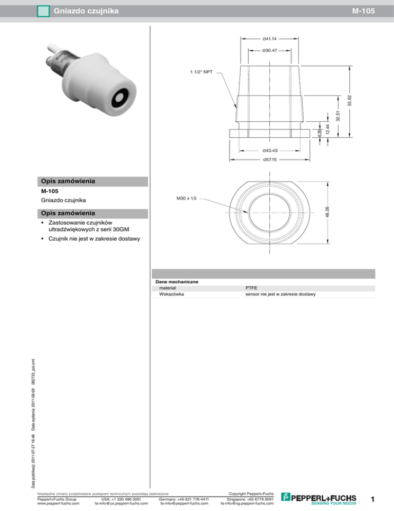 Gniazdo czujnika M-105 Ø41.14 Ø30.47 12.44 6.35 32.51 55.62 1 1/2'' NPT Ø43.43 Ø57.15 Opis zamówienia M-105 M30 x 1.5 48.26 Gniazdo czujnika Opis zamówienia • Zastosowanie czujników ultradźwiękowych z serii 30GM • Czujnik nie jest w zakresie dostawy PTFE sensor nie jest w zakresie dostawy Data publikacji: 2011-07-27 16:48 Data wydania: 2011-08-09 092733_pol.xml Dane mechaniczne materiał Wskazówka Niezbêdne zmiany podyktowane postêpem technicznym pozostaj¹ zastrze¿one Pepperl+Fuchs Group USA: +1 330 486 0001 Germany: +49 621 776-4411 www.pepperl-fuchs.com [email protected] [email protected] Copyright Pepperl+Fuchs Singapore: +65 6779 9091 [email protected] 1