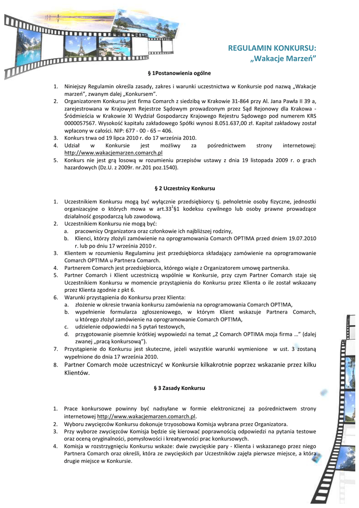 REGULAMIN KONKURSU: „Wakacje Marzeń” § 1Postanowienia ogólne 1. 2. 3. 4. 5. Niniejszy Regulamin określa zasady, zakres i warunki uczestnictwa w Konkursie pod nazwą „Wakacje marzeń”, zwanym dalej „Konkursem”. Organizatorem Konkursu jest firma Comarch z siedzibą w Krakowie 31-864 przy Al. Jana Pawła II 39 a, zarejestrowana w Krajowym Rejestrze Sądowym prowadzonym przez Sąd Rejonowy dla Krakowa Śródmieścia w Krakowie XI Wydział Gospodarczy Krajowego Rejestru Sądowego pod numerem KRS 0000057567. Wysokość kapitału zakładowego Spółki wynosi 8.051.637,00 zł. Kapitał zakładowy został wpłacony w całości. NIP: 677 - 00 - 65 – 406. Konkurs trwa od 19 lipca 2010 r. do 17 września 2010. Udział w Konkursie jest możliwy za pośrednictwem strony internetowej: http://www.wakacjemarzen.comarch.pl Konkurs nie jest grą losową w rozumieniu przepisów ustawy z dnia 19 listopada 2009 r. o grach hazardowych (Dz.U. z 2009r. nr.201 poz.1540). § 2 Uczestnicy Konkursu 1. 2. 3. 4. 5. 6. 7. 8. Uczestnikiem Konkursu mogą być wyłącznie przedsiębiorcy tj. pełnoletnie osoby fizyczne, jednostki 1 organizacyjne o których mowa w art.33 §1 kodeksu cywilnego lub osoby prawne prowadzące działalność gospodarczą lub zawodową. Uczestnikiem Konkursu nie mogą być: a. pracownicy Organizatora oraz członkowie ich najbliższej rodziny, b. Klienci, którzy złożyli zamówienie na oprogramowania Comarch OPT!MA przed dniem 19.07.2010 r. lub po dniu 17 września 2010 r. Klientem w rozumieniu Regulaminu jest przedsiębiorca składający zamówienie na oprogramowanie Comarch OPT!MA u Partnera Comarch. Partnerem Comarch jest przedsiębiorca, którego wiąże z Organizatorem umowę partnerska. Partner Comarch i Klient uczestniczą wspólnie w Konkursie, przy czym Partner Comarch staje się Uczestnikiem Konkursu w momencie przystąpienia do Konkursu przez Klienta o ile został wskazany przez Klienta zgodnie z pkt 6. Warunki przystąpienia do Konkursu przez Klienta: a. złożenie w okresie trwania konkursu zamówienia na oprogramowania Comarch OPT!MA, b. wypełnienie formularza zgłoszeniowego, w którym Klient wskazuje Partnera Comarch, u którego złożył zamówienie na oprogramowanie Comarch OPT!MA, c. udzielenie odpowiedzi na 5 pytań testowych, d. przygotowanie pisemnie krótkiej wypowiedzi na temat „Z Comarch OPTIMA moja firma …” (dalej zwanej „pracą konkursową”). Przystąpienie do Konkursu jest skuteczne, jeżeli wszystkie warunki wymienione w ust. 3 zostaną wypełnione do dnia 17 września 2010. Partner Comarch może uczestniczyć w Konkursie kilkakrotnie poprzez wskazanie przez kilku Klientów. § 3 Zasady Konkursu 1. 2. 3. 4. Prace konkursowe powinny być nadsyłane w formie elektronicznej za pośrednictwem strony internetowej http://www.wakacjemarzen.comarch.pl. Wyboru zwycięzców Konkursu dokonuje trzyosobowa Komisja wybrana przez Organizatora. Przy wyborze zwycięzców Komisja będzie się kierować poprawnością odpowiedzi na pytania testowe oraz oceną oryginalności, pomysłowości i kreatywności prac konkursowych. Komisja w rozstrzygnięciu Konkursu wskaże: dwie zwycięskie pary - Klienta i wskazanego przez niego Partnera Comarch oraz określi, która ze zwycięskich par Uczestników zajęła pierwsze miejsce, a która drugie miejsce w Konkursie. 5. Komisja rozstrzygnie Konkurs w dniu 21 września 2010 r. podając rozstrzygnięcie Konkursu oraz dane zwycięzców Konkursu w formie ogłoszenia na stronie internetowej http://www.wakacjemarzen.comarch.pl. § 4 Nagrody 1. Nagrodą w Konkursie są cztery vouchery, dwa o wartości 7000 zł brutto za pierwsze miejsce i dwa o wartości 6000 zł brutto z drugie miejsce. 2. Vauchery upoważniają zwycięzców Konkursu do żądania od Organizatora sfinansowania dowolnej wycieczki lub wczasów do wartości vouchera i na warunkach określonych poniżej: a. zwycięzca będzie uprawniony do wskazania do dnia 30.04.2011 r. dowolnej wycieczki lub wczasów, które mają być sfinansowane przez Organizatora w ramach nagrody za wygranie Konkursu. b. uprawnienie do żądania sfinansowania wycieczki lub wczasów przysługuje wyłącznie zwycięzcy Konkursu i nie może być przeniesione na osobę trzecią bez zgody Organizatora, c. wycieczka lub wczasy mogą być organizowane przez dowolne biuro podróży w Polsce, d. możliwe jest wskazanie wycieczki lub wczasów dla więcej niż jednej osoby, e. różnica między wartością vauchera a rzeczywistą ceną wycieczki lub wczasów nie będzie wypłacana zwycięzcy Konkursu, f. zwycięzcy Konkursu nie przysługuje prawo do żądania zamiany vauchera na wypłatę kwoty pieniężnej, g. w terminie 14 dni od dnia wskazania przez zwycięzcę Konkursu konta i danych adresowych biura podróży oraz wybranej wycieczki lub wczasów, Organizator wpłaci w formie przelewu cenę wycieczki lub wczasów albo kwotę odpowiadającą wartości vauchera, jeżeli cena wycieczki lub wczasów będzie wyższa, na konto biura podróży wskazanego przez zwycięzcę Konkursu, h. wskazanie przez zwycięzcę Konkursu wycieczki lub wczasów oraz biura podróży i jego konta musi być dokonane w formie pisemnej pod rygorem nieważności. 3. Vauchery sa ważne do dnia 30.04.2011 r. § 5 Postanowienia końcowe 1. Przystąpienie do Konkursu jest równoznaczne z akceptacją przez Uczestnika Konkursu warunków Regulaminu i wyrażenie zgody na publiczne ujawnienie w dowolnej formie jego imienia i nazwiska lub nazwy w przypadku wygrania przez niego Konkursu. 2. Organizator nabywa nieodpłatnie prawa autorskie do pracy konkursowej Uczestnika Konkursu z dniem jej otrzymania na następujących polach eksploatacji : a. w zakresie utrwalania i zwielokrotniania utworu - wytwarzanie określoną techniką egzemplarzy utworu, w tym techniką drukarską, reprograficzną, zapisu magnetycznego oraz techniką cyfrową; b. w zakresie obrotu oryginałem albo egzemplarzami, na których utwór utrwalono - wprowadzanie do ob