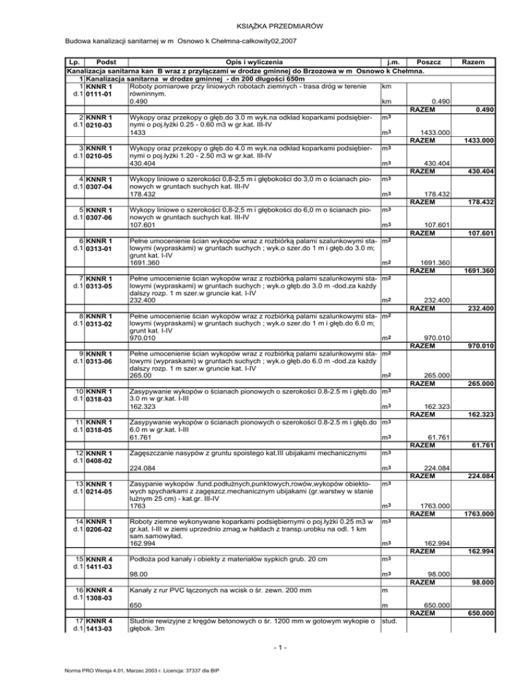 KSIĄśKA PRZEDMIARÓW Budowa kanalizacji sanitarnej w m Osnowo k Chełmna-całkowity02,2007 Lp. Podst Opis i wyliczenia j.m. Poszcz Kanalizacja sanitarna kan B wraz z przyłączami w drodze gminnej do Brzozowa w m Osnowo k Chełmna. 1 Kanalizacja sanitarna w drodze gminnej - dn 200 długości 650m 1 KNNR 1 Roboty pomiarowe przy liniowych robotach ziemnych - trasa dróg w terenie km d.1 0111-01 równinnym. 0.490 km 0.490 RAZEM 2 KNNR 1 Wykopy oraz przekopy o głęb.do 3.0 m wyk.na odkład koparkami podsiębier- m3 d.1 0210-03 nymi o poj.łyŜki 0.25 - 0.60 m3 w gr.kat. III-IV 1433 m3 1433.000 RAZEM 3 KNNR 1 Wykopy oraz przekopy o głęb.do 4.0 m wyk.na odkład koparkami podsiębier- m3 d.1 0210-05 nymi o poj.łyŜki 1.20 - 2.50 m3 w gr.kat. III-IV 430.404 m3 430.404 RAZEM 4 KNNR 1 Wykopy liniowe o szerokości 0,8-2,5 m i głębokości do 3,0 m o ścianach pio- m3 d.1 0307-04 nowych w gruntach suchych kat. III-IV 178.432 m3 178.432 RAZEM 5 KNNR 1 Wykopy liniowe o szerokości 0,8-2,5 m i głębokości do 6,0 m o ścianach pio- m3 d.1 0307-06 nowych w gruntach suchych kat. III-IV 107.601 m3 107.601 RAZEM 6 KNNR 1 Pełne umocenienie ścian wykopów wraz z rozbiórką palami szalunkowymi sta- m2 d.1 0313-01 lowymi (wypraskami) w gruntach suchych ; wyk.o szer.do 1 m i głęb.do 3.0 m; grunt kat. I-IV 1691.360 m2 1691.360 RAZEM 7 KNNR 1 Pełne umocenienie ścian wykopów wraz z rozbiórką palami szalunkowymi sta- m2 d.1 0313-05 lowymi (wypraskami) w gruntach suchych ; wyk.o głęb.do 3.0 m -dod.za kaŜdy dalszy rozp. 1 m szer.w gruncie kat. I-IV 232.400 m2 232.400 RAZEM 8 KNNR 1 Pełne umocenienie ścian wykopów wraz z rozbiórką palami szalunkowymi sta- m2 d.1 0313-02 lowymi (wypraskami) w gruntach suchych ; wyk.o szer.do 1 m i głęb.do 6.0 m; grunt kat. I-IV 970.010 m2 970.010 RAZEM 9 KNNR 1 Pełne umocenienie ścian wykopów wraz z rozbiórką palami szalunkowymi sta- m2 d.1 0313-06 lowymi (wypraskami) w gruntach suchych ; wyk.o głęb.do 6.0 m -dod.za kaŜdy dalszy rozp. 1 m szer.w gruncie kat. I-IV 265.00 m2 265.000 RAZEM 10 KNNR 1 Zasypywanie wykopów o ścianach pionowych o szerokości 0.8-2.5 m i głęb.do m3 d.1 0318-03 3.0 m w gr.kat. I-III 162.323 m3 162.323 RAZEM 11 KNNR 1 Zasypywanie wykopów o ścianach pionowych o szerokości 0.8-2.5 m i głęb.do m3 d.1 0318-05 6.0 m w gr.kat. I-III 61.761 m3 61.761 RAZEM 12 KNNR 1 Zagęszczanie nasypów z gruntu spoistego kat.III ubijakami mechanicznymi m3 d.1 0408-02 224.084 m3 224.084 RAZEM 13 KNNR 1 Zasypanie wykopów .fund.podłuŜnych,punktowych,rowów,wykopów obiektom3 d.1 0214-05 wych spycharkami z zagęszcz.mechanicznym ubijakami (gr.warstwy w stanie luźnym 25 cm) - kat.gr. III-IV 1763 m3 1763.000 RAZEM 14 KNNR 1 Roboty ziemne wykonywane koparkami podsiębiernymi o poj.łyŜki 0.25 m3 w m3 d.1 0206-02 gr.kat. I-III w ziemi uprzednio zmag.w hałdach z transp.urobku na odl. 1 km sam.samowyład. 162.994 m3 162.994 RAZEM 15 KNNR 4 PodłoŜa pod kanały i obiekty z materiałów sypkich grub. 20 cm m3 d.1 1411-03 98.00 m3 98.000 RAZEM 16 KNNR 4 Kanały z rur PVC łączonych na wcisk o śr. zewn. 200 mm m d.1 1308-03 650 m 650.000 RAZEM 17 KNNR 4 Studnie rewizyjne z kręgów betonowych o śr. 1200 mm w gotowym wykopie o stud. d.1 1413-03 głębok. 3m -1- Norma PRO Wersja 4.01, Marzec 2003 r. Licencja: 37337 dla BIP Razem 0.490 1433.000 430.404 178.432 107.601 1691.360 232.400 970.010 265.000 162.323 61.761 224.084 1763.000 162.994 98.000 650.000 KSIĄśKA PRZEDMIARÓW Budowa kanalizacji sanitarnej w m Osnowo k Chełmna-całkowity02,2007 Lp. Podst Opis i wyliczenia 12.000 18 KNNR 4 d.1 1413-04 j.m. stud. Studnie rewizyjne z kręgów betonowych o śr. 1200 mm w gotowym wykopie za [0.5 m] kaŜde 0.5 m róŜnicy głęb. stud. 4.000 [0.5 m] stud. Poszcz 12.000 RAZEM 20 KNNR 4 d.1 1512-01 21 KNNR 4 d.1 1513-03 22 KNNR 4 d.1 1512-03 23 KNNR 4 d.1 1322-03 24 KNNR 4 d.1 1412-02 25 KNNR 4 d.1 1610-02 Powłoka izolacyjna pionowych powierzchni murowanych i betonowych z emul- m2 sji lub roztworu asfaltowego (gruntowanie) - pierwsza warstwa 210.857 m2 Powłoka izolacyjna poziomych powierzchni betonowych z emulsji lub roztworu m2 asfaltowego (gruntowanie) - pierwsza warstwa 18.086 m2 Powłoka izolacyjna pionowych powierzchni murowanych i betonowych z lepiku m2 asfaltowego na zimno - pierwsza warstwa 210.857 m2 Powłoka izolacyjna poziomych powierzchni betonowych z lepiku asfaltowego na zimno - pierwsza warstwa 18.086 m2 Kształtki PVC kanalizacyjne dwukielichowe łączone na wcisk o śr. zewn. 200 mm 18.000 szt Otuliny betonowe kanałów m3 0.006 m3 m2 szt Próba wodna szczelności kanałów rurowych betonowych i Ŝelbetowych o śr.no- odc. -1 minalnej 200 mm prób. 2.000 odc. -1 prób. 27 KNNR 6 d.1 0802-04 28 KNNR 6 d.1 0802-02 29 KNR 4-01 d.1 0811-02 30 KNNR 6 d.1 0103-01 31 KNNR 6 d.1 0113-02 32 KNNR 6 d.1 1005-01 33 KNNR 6 d.1 1005-07 34 KNNR 6 d.1 0308-01 4.000 210.857 RAZEM 210.857 18.086 RAZEM 18.086 210.857 RAZEM 210.857 18.086 RAZEM 18.086 18.000 RAZEM 18.000 0.006 RAZEM 0.006 2.000 RAZEM 26 KNR AT-03 Roboty remontowe - cięcie piłą nawierzchni bitumicznych na gł. 6-10 cm d.1 0101-02 461.000 12.000 4.000 RAZEM 19 KNNR 4 d.1 1513-01 Razem 2.000 m m 461.000 RAZEM 461.000 559.700 RAZEM 559.700 559.700 RAZEM 559.700 212.686 RAZEM 212.686 559.700 RAZEM 559.700 559.700 RAZEM 559.700 559.700 RAZEM 559.700 559.700 RAZEM 559.700 559.700 RAZEM 559.700 Rozebranie nawierzchni z mas mineralno-bitumicznych gr. 4 cm mechanicznie m2 559.700 m2 Rozebranie nawierzchni z tłucznia gr. 15 cm mechanicznie m2 559.700 m2 Wymiana posadzki o pow.do 1 m2 w jednym miejscu na zapr.cem.z płytek terakotowych o wym. 10x10 cm 212.686 m2 Profilowanie i zagęszczanie podłoŜa wykonywane ręcznie w gruncie kat. II-IV pod warstwy konstrukcyjne nawierzchni 559.700 m2 Warswa dolna podbudowy z kruszyw łamanych gr. 20 cm m2 559.700 m2 Oczyszczenie ręczne nawierzchni drogowych nieulepszonych m2 559.700 m2 Skropienie asfaltem nawierzchni drogowych m2 559.700 m2 Nawierzchnie z 