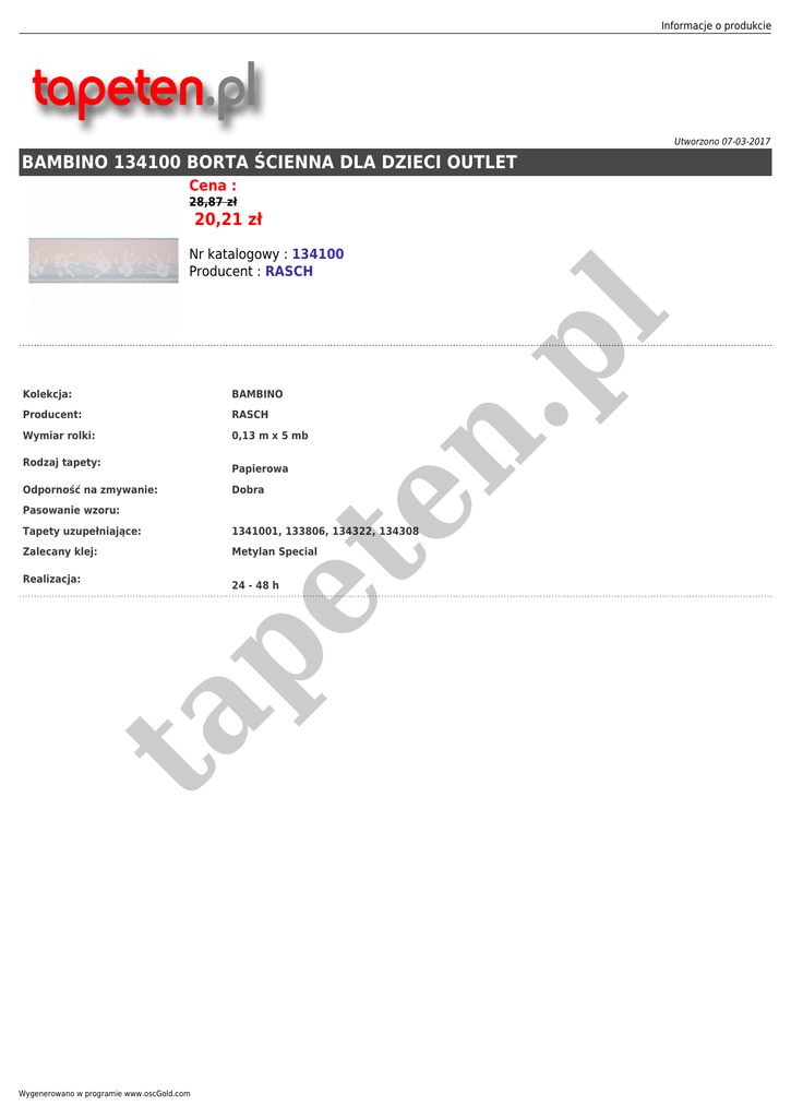 Informacje o produkcie Utworzono 07-03-2017 BAMBINO 134100 BORTA ŚCIENNA DLA DZIECI OUTLET Cena : 28,87 zł 20,21 zł BAMBINO Producent: RASCH Wymiar rolki: 0,13 m x 5 mb Rodzaj tapety: pe te n Kolekcja: Odporność na zmywanie: Pasowanie wzoru: Tapety uzupełniające: Zalecany klej: Papierowa Dobra 1341001, 133806, 134322, 134308 Metylan Special 24 - 48 h ta Realizacja: .p l Nr katalogowy : 134100 Producent : RASCH Wygenerowano w programie www.oscGold.com