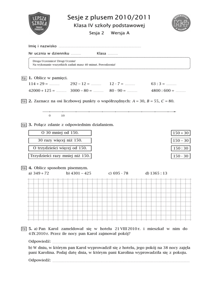 Sesje z plusem 2010/2011 Klasa IV szkoły podstawowej Sesja 2 Imię i nazwisko Wersja A ................................................... .............................. Nr ucznia w dzienniku Klasa .......... .......... Droga Uczennico! Drogi Uczniu! Na wykonanie wszystkich zadań masz 40 minut. Powodzenia! 1. Oblicz w pamięci. 114 + 29 = .......... 42000 + 125 = .......... 292 − 12 = .......... 3000 − 80 = .......... 12 · 7 = .......... 80 · 90 = .......... 63 : 3 = .......... 4800 : 600 = .......... 2. Zaznacz na osi liczbowej punkty o współrzędnych: A = 30, B = 55, C = 80. 3. Połącz zdanie z odpowiednim działaniem. O 30 mniej od 150. 150 + 30 30 razy więcej niż 150. 150 − 30 O trzydzieści więcej od 150. 150 : 30 Trzydzieści razy mniej niż 150. 150 · 30 4. Oblicz sposobem pisemnym. a) 349 + 72 b) 4301 − 425 c) 695 · 78 d) 1365 : 13 5. a) Pan Karol zameldował się w hotelu 21 VIII 2010 r. i mieszkał w nim do 4 IX 2010 r. Przez ile nocy pan Karol zajmował pokój? Odpowiedź: ....................................................................................................................................... b) W dniu, w którym pan Karol wyprowadził się z hotelu, jego pokój na 38 nocy zajęła pani Karolina. Podaj datę dnia, w którym pani Karolina wyprowadziła się z pokoju. Odpowiedź: ....................................................................................................................................... 6. Uzupełnij zdania. a) Cyfrą setek w liczbie 458726 jest b) Suma cyfr liczby 6523 wynosi .............................. .............................. c) Liczba trzy miliony sto dwadzieścia tysięcy pięć zapisana w systemie dziesiątkowym, to .............................. d) Liczba czterysta sześć zapisana w systemie rzymskim ma postać .............................. 7. Oblicz. 54 + 6 : 2 = ...................................................................................................... 8. Krzysiek otrzymał od babci paczkę cukierków. Postanowił podzielić je równo pomiędzy siebie i swoich trzech kolegów. Gdy każdy otrzymał po 4 cukierki, okazało się, że w paczce zostały jeszcze dwa cukierki. Ile cukierków było początkowo w opakowaniu? .............................................................................................................................................................. Odpowiedź: ....................................................................................................................................... 9. Iza kupiła cztery batoniki po 90 groszy i sześć gum do żucia. Za wszystko zapłaciła 6 zł. Ile kosztowała jedna guma do żucia? Obliczenia wykonaj w groszach. .............................................................................................................................................................. .............................................................................................................................................................. Odpowiedź: ....................................................................................................................................... Zadanie dodatkowe Na dwóch krzakach siedziało 18 wróbli. Gdy z pierwszego krzaka na drugi przeleciały 3 wróble, to okazało się, że na pierwszym krzaku zostało dwa razy tyle wróbli co na drugim. Ile wróbli siedziało początkowo na każdym krzaku? Sesje z plusem 2010/2011 Klasa IV szkoły podstawowej Sesja 2 Imię i nazwisko Wersja B ................................................... .............................. Nr ucznia w dzienniku .......... Klasa .......... Droga Uczennico! Drogi Uczniu! Na wykonanie wszystkich zadań masz 40 minut. Powodzenia! 1. Oblicz w pamięci. 119 + 34 = 383 − 13 = 13 · 6 = 84 : 4 = 23000 + 541 = 7000 − 30 = 80 · 70 = 4800 : 800 = 2. Zaznacz na osi liczbowej punkty o współrzędnych: A = 20, B = 45, C = 70. 3. Połącz zdanie z odpowiednim działaniem. O 40 więcej od 130. 130 · 40 40 razy więcej niż 130. 130 + 40 O czterdzieści mniej od 130. 130 : 40 Czterdzieści razy mniej niż 130. 130 − 40 4. Oblicz sposobem pisemnym. a) 438 + 93 b) 5013 − 425 c) 695 · 87 d) 1272 : 12 5. a) Pan Mirek zameldował się w hotelu 12 IX 2010 r. i mieszkał w nim do 5 X 2010 r. Przez ile nocy pan Mirek zajmował pokój? Odpowiedź: ....................................................................................................................................... b) W dniu, w którym pan Mirek wyprowadził się z hotelu, jego pokój na 39 nocy zajęła pani Mirka. Podaj datę dnia, w którym pani Mirka wyprowadziła się z pokoju. Odpowiedź: ....................................................................................................................................... 6. Uzupełnij zdania. a) Cyfrą tysięcy w liczbie 45876 jest b) Suma cyfr liczby 2526 wynosi .............................. .............................. c) Liczba trzy miliony sto tysięcy dwadzieścia pięć zapisana w systemie dziesiątkowym, to .............................. d) Liczba sześćset cztery zapisana w systemie rzymskim ma postać .............................. 7. Oblicz. 42 + 8 : 2 = ...................................................................................................... 8. Ania dostała od mamy pudełko ciastek. Postanowiła podzielić je równo między siebie i cztery swoje koleżanki. Gdy każda otrzymała po 4 ciastka, okazało się, że w pudełku zostały jeszcze cztery ciastka. Ile ciastek było początkowo w pudełku? .............................................................................................................................................................. Odpowiedź: ....................................................................................................................................... 9. Piotr kupił sześć wafelków po 70 groszy i cztery małe czekoladki. Za wszystko