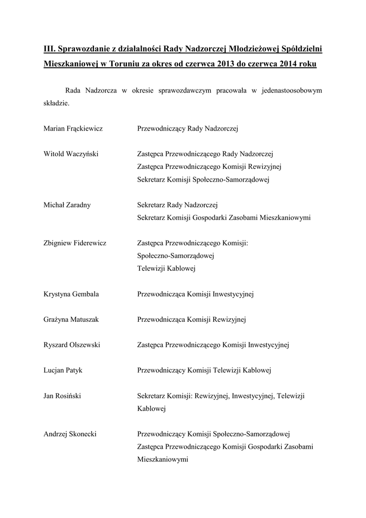 III. Sprawozdanie z działalności Rady Nadzorczej Młodzieżowej Spółdzielni Mieszkaniowej w Toruniu za okres od czerwca 2013 do czerwca 2014 roku Rada Nadzorcza w okresie sprawozdawczym pracowała w jedenastoosobowym składzie. Marian Frąckiewicz Przewodniczący Rady Nadzorczej Witold Waczyński Zastępca Przewodniczącego Rady Nadzorczej Zastępca Przewodniczącego Komisji Rewizyjnej Sekretarz Komisji Społeczno-Samorządowej Michał Zaradny Sekretarz Rady Nadzorczej Sekretarz Komisji Gospodarki Zasobami Mieszkaniowymi Zbigniew Fiderewicz Zastępca Przewodniczącego Komisji: Społeczno-Samorządowej Telewizji Kablowej Krystyna Gembala Przewodnicząca Komisji Inwestycyjnej Grażyna Matuszak Przewodnicząca Komisji Rewizyjnej Ryszard Olszewski Zastępca Przewodniczącego Komisji Inwestycyjnej Lucjan Patyk Przewodniczący Komisji Telewizji Kablowej Jan Rosiński Sekretarz Komisji: Rewizyjnej, Inwestycyjnej, Telewizji Kablowej Andrzej Skonecki Przewodniczący Komisji Społeczno-Samorządowej Zastępca Przewodniczącego Komisji Gospodarki Zasobami Mieszkaniowymi 2 Kazimierz Szajbach Przewodniczący Komisji Gospodarki Zasobami Mieszkaniowymi Sprawozdanie Rady Nadzorczej adresowane jest do wszystkich członków, którzy wezmą udział w poszczególnych częściach Walnego Zgromadzenia. Przedstawione zostało w miarę szczegółowo, aby wszyscy członkowie mieli obraz problematyki i zagadnień, jakimi zajmowała się Rada Nadzorcza i jej komisje. W okresie sprawozdawczym pracowało pięć stałych Komisji Rady. Są to Komisje: Rewizyjna, Gospodarki Zasobami Mieszkaniowymi, Inwestycyjna, Społeczno-Samorządowa, Telewizji Kablowej. Poza wewnętrzną strukturą Rady Nadzorczej pracowała również Rada Programowa Telewizji Kablowej Młodzieżowej Spółdzielni Mieszkaniowej. Zakres kompetencji Rady Nadzorczej umocowany jest w prawie spółdzielczym i Statucie MSM. Wszystkie wynikające z kompetencji zagadnienia były przedmiotem obrad i uchwał Rady. Rada Nadzorcza sprawowała kontrolę i nadzór nad działalnością Spółdzielni. Swoje zadania kontrolne i pozostałe obowiązki odnosiła do działalności Zarządu MSM, zachowując statutowy podział kompetencji pomiędzy organami wykonawczo- samorządowymi Spółdzielni. W okresie sprawozdawczym Rada Nadzorcza odbyła jedenaście posiedzeń. Przed każdym z nich Komisje szczegółowo analizowały sprawy i zagadnienia omawiane później na posiedzeniach Rady. Komisja Rewizyjna w swoich pracach zajmowała się gospodarką finansową Spółdzielni, sprawami związanymi z rachunkowością, rozliczeniami finansowymi, sprawami windykacji należności wobec Spółdzielni i regulowania jej zobowiązań finansowych. Komisja Gospodarki Zasobami Mieszkaniowymi zajmowała się gospodarką lokalami spółdzielczymi oraz gospodarką konserwacyjną, remontową, termo-modernizacyjną, stanem osiedli i ich wyposażenia oraz analizami zużycia mediów komunalnych. 3 Komisja Społeczno-Samorządowa zajmowała się działalnością społeczną, oświatową i kulturalną prowadzoną przez dwa kluby osiedlowe MSM, a także podejmowała pracę nad problematyką działalności samorządowej oraz opiniowała wnioski w sprawach o pozbawienie członkostwa w Spółdzielni. W przypadkach dotyczących pozbawienia członkostwa zwracała szczególną uwagę na problemy i sytuację rodzinną danego członka Spółdzielni. Komisja Inwestycyjna pracowała nad tematami dotyczącymi gospodarki inwestycyjnej Spółdzielni, jej działaniami w zakresie pozyskiwania nowych terenów pod inwestycje mieszkaniowe oraz uregulowaniami stanów prawnych gruntów MSM i racjonalnym wykorzystaniu posiadanych terenów pod kątem realizacji nowych inwestycji mieszkaniowych. Komisja Telewizji Kablowej nadzorowała działalność Telewizji Kablowej MSM m.in. w sprawach dotyczących studia telewizyjnego i programu lokalnego, infrastruktury technicznej telewizji kablowej, rozwojem terytorialnym oraz usługami świadczonymi przez naszą Telewizję. Wszystkie Komisje Rady Nadzorczej nadzorowały przebieg komisji przetargowych Spółdzielni na poszczególne zakresy robót i usług. Tematyka posiedzeń Rady Nadzorczej była zgodna z przyjętymi półrocznymi planami pracy uzupełnianymi o problemy bieżące wnoszone przez członków Rady i Zarządu oraz o sprawy kierowane do Rady przez członków i mieszkańców Spółdzielni. Tematy rozpatrywane przez Radę dotyczyły zagadnień: gospodarczo-finansowych, eksploatacyjno-remontowych, inwestycyjnych, samorządowych, członkowsko-mieszkaniowych, działalności społeczno-kulturalnej, telewizji kablowej. Rada Nadzorcza w Najważniejsze z nich to: okresie sprawozdawczym zajmowała się różnymi tematami. 4 1. Analiza wyników ekonomicznych i realizacja planu gospodarczo-finansowego MSM za I kwartał 2013r. 2. Informacje z kontroli okresowej budynków pod kątem stanu technicznego. 3. Informacje o przygotowaniu klubów osiedlowych do sezonu letniego dla dzieci i młodzieży. 4. Wybór związku rewizyjnego dokonującego ustawowej lustracji działalności inwestycyjnej Spółdzielni w roku 2012. 5. Sprawozdania z prac Komisji Rady Nadzorczej oraz plany ich prac na kolejne półrocze. 6. Przyjęcie planu pracy i posiedzeń Rady Nadzorczej na kolejne półrocza. 7. Analiza zużycia wody. 8. Analiza zaległości w opłatach za użytkowanie lokali i za usługi TVK oraz efektywność egzekucji zaległości. 9. Zatwierdzenie harmonogramu realizacji uchwał Walnego Zgromadzenia MSM podjętych w 2013 r. 10. Ocena przygotowań klubów do działalności społeczno-kulturalnej w okresie jesiennozimowym. 11. Analiza zużycia i kosztów energii cieplnej za I półrocze 2013 r. z porównaniem do lat poprzednich oraz informacja o realizacji wniosków z poprzednich analiz. 12. Przedstawienie wyników lustracji działalności inwestycyjnej Spółdzielni za 2012 rok. 13. Informacje o przygotowaniu zasobów MSM do sezonu zimowego. 14. Wybór podmiotu gospodarczego w celu zbada