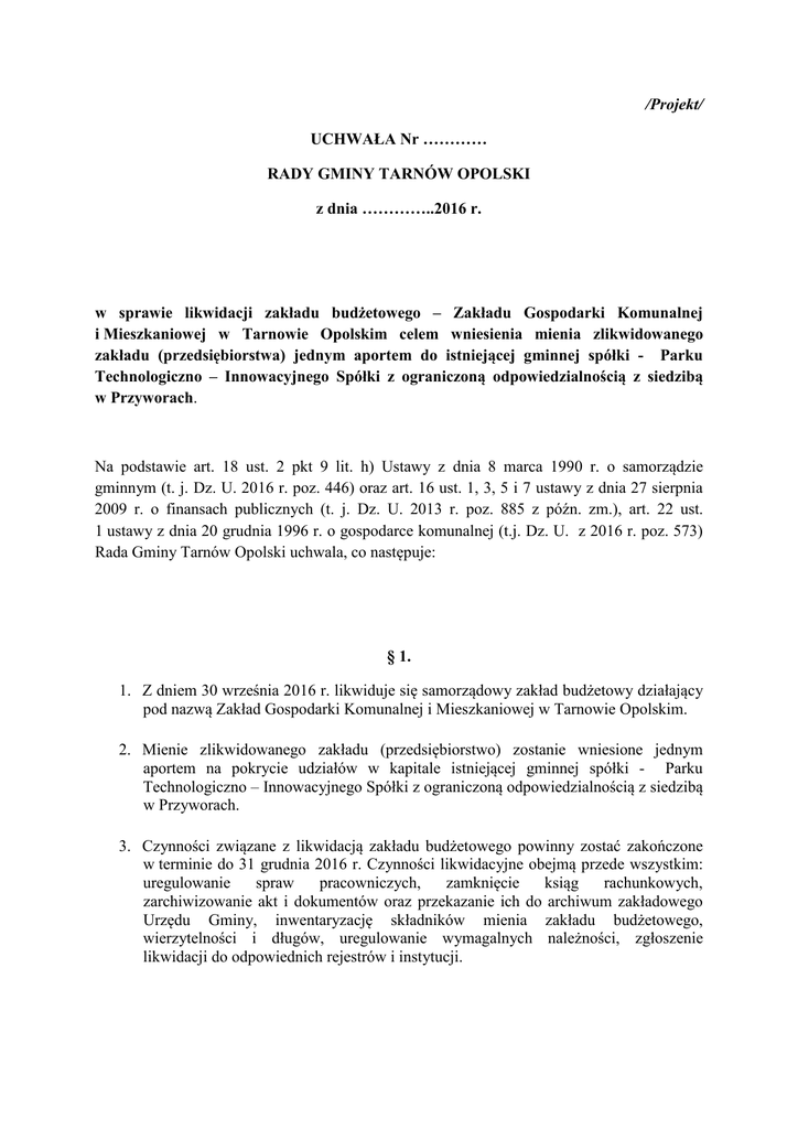 /Projekt/ UCHWAŁA Nr ………… RADY GMINY TARNÓW OPOLSKI z dnia …………..2016 r. w sprawie likwidacji zakładu budżetowego – Zakładu Gospodarki Komunalnej i Mieszkaniowej w Tarnowie Opolskim celem wniesienia mienia zlikwidowanego zakładu (przedsiębiorstwa) jednym aportem do istniejącej gminnej spółki - Parku Technologiczno – Innowacyjnego Spółki z ograniczoną odpowiedzialnością z siedzibą w Przyworach. Na podstawie art. 18 ust. 2 pkt 9 lit. h) Ustawy z dnia 8 marca 1990 r. o samorządzie gminnym (t. j. Dz. U. 2016 r. poz. 446) oraz art. 16 ust. 1, 3, 5 i 7 ustawy z dnia 27 sierpnia 2009 r. o finansach publicznych (t. j. Dz. U. 2013 r. poz. 885 z późn. zm.), art. 22 ust. 1 ustawy z dnia 20 grudnia 1996 r. o gospodarce komunalnej (t.j. Dz. U. z 2016 r. poz. 573) Rada Gminy Tarnów Opolski uchwala, co następuje: § 1. 1. Z dniem 30 września 2016 r. likwiduje się samorządowy zakład budżetowy działający pod nazwą Zakład Gospodarki Komunalnej i Mieszkaniowej w Tarnowie Opolskim. 2. Mienie zlikwidowanego zakładu (przedsiębiorstwo) zostanie wniesione jednym aportem na pokrycie udziałów w kapitale istniejącej gminnej spółki - Parku Technologiczno – Innowacyjnego Spółki z ograniczoną odpowiedzialnością z siedzibą w Przyworach. 3. Czynności związane z likwidacją zakładu budżetowego powinny zostać zakończone w terminie do 31 grudnia 2016 r. Czynności likwidacyjne obejmą przede wszystkim: uregulowanie spraw pracowniczych, zamknięcie ksiąg rachunkowych, zarchiwizowanie akt i dokumentów oraz przekazanie ich do archiwum zakładowego Urzędu Gminy, inwentaryzację składników mienia zakładu budżetowego, wierzytelności i długów, uregulowanie wymagalnych należności, zgłoszenie likwidacji do odpowiednich rejestrów i instytucji. § 2. 1. Spółka wskazana w § 1 ust. 2 wstąpi we wszystkie prawa i obowiązki związane z działalnością likwidowanego zakładu budżetowego oraz przejmie jego należności i zobowiązania. 2. Na spółkę wskazaną w § 1 ust. 2 przejdą posiadane przez zakład budżetowy zezwolenia oraz decyzje na prowadzoną działalność. 3. Spółka wskazana w § 1 ust. 2 zapewni ciągłość działalności wykonywanej przez zakład budżetowy w zakresie gospodarki komunalnej określonej w statucie zakładu budżetowego związanej z realizacją zadań o charakterze własnym Gminy oraz zadań z zakresu użyteczności publicznej. § 3. 1. Spółka wskazana w § 1 ust. 2 przejmuje zobowiązania ze stosunków pracy zakładu budżetowego. 2. Pracownicy likwidowanego zakładu budżetowego stają się z dniem dokonania aportu jego mienia (przedsiębiorstwa) do spółki wskazanej w § 1 ust. 2, pracownikami tej spółki. 3. Zmiany organizacyjne w zakresie praw i obowiązków pracowniczych, o których mowa w niniejszej uchwale, stanowią przejście zakładu pracy na innego pracodawcę w trybie art. 231 Ustawy z dnia 26 czerwca 1974 r. Kodeks pracy. § 4. Wykonanie uchwały powierza się Wójtowi Gminy Tarnów Opolski. Wójt może powierzyć określone czynności likwidacyjne wskazanym przez siebie likwidatorom. § 5. Uchwała wchodzi w życie z dniem podjęcia Przewodniczący Rady Gminy Uzasadnienie Na podstawie art. 18 ust. 2 pkt. 9 lit. h Ustawy z dnia 8 marca 1990 r. o samorządzie gminnym do wyłącznej właściwości rady gminy należy tworzenie, likwidacja i reorganizacja przedsiębiorstw, zakładów i innych gminnych jednostek organizacyjnych oraz wyposażenie ich w majątek. Zgodnie z art. 9 i art. 21 Ustawy z dnia 20 grudnia 1996 r. o gospodarce komunalnej jednostki samorządu terytorialnego mogą tworzyć spółki z ograniczoną odpowiedzialnością lub spółki akcyjne, a także mogą przystępować do takich spółek. Organ stanowiący jednostki samorządu terytorialnego może, w drodze uchwały, zdecydować o likwidacji samorządowego zakładu budżetowego w celu zawiązania spółki akcyjnej lub spółki z ograniczoną odpowiedzialnością przez wniesienie na pokrycie kapitału spółki wkładu w postaci mienia samorządowego zakładu budżetowego pozostałego po jego likwidacji. Ustawodawca nie wyklucza przy tym także możliwości proponowanej w niniejszej uchwale, kiedy to majątek likwidowanego zakładu budżetowego zostanie wniesiony aportem do istniejącej spółki gminnej. Czynności związane z likwidacją samorządowego zakładu budżetowego w celu wniesienia jego mienia do istniejącej spółki gminnej, wykonuje organ wykonawczy jednostki samorządu terytorialnego, w tym przypadku Wójt Gminy Tarnów Opolski. Na podstawie art. 23 Ustawy z dnia 20 grudnia 1996 r. o gospodarce komunalnej składniki mienia samorządowego zakładu budżetowego przekształconego w spółkę stają się majątkiem tej spółki. Prawo zarządu gruntem samorządowego zakładu budżetowego przekształconego w spółkę staje się prawem użytkowania wieczystego spółki. Spółka powstała w wyniku przekształcenia wstępuje we wszystkie prawa i obowiązki związane z działalnością samorządowego zakładu budżetowego. Regulacje te znajdą analogiczne zastosowanie w przypadku wniesienia aportem przedsiębiorstwa zlikwidowanego zakładu budżetowego do istniejącej spółki gminnej. W myśl art. 16 ust. 1,3,5 i 7 Ustawy z dnia 27 sierpnia 2009 r. o finansach publicznych organ stanowiący jednostki samorządu terytorialnego tworzy, łączy, przekształca w inną formę organizacyjno-prawną i likwiduje samorządowe zakładu budżetowe. Likwidując zakład budżetowy, organ stanowiący jednostki samorządu terytorialnego określa przeznaczenie mienia znajdującego się w użytkowaniu tego zakładu. Składniki mienia likwidowanego zakładu budżetowego przejdą do istniejącej spółki gminnej. Gmina Tarnów Opolski jest jedynym udziałowcem tej spółki, która za pośrednictwem rady nadzorczej sprawuje nadzór właścicielski nad jej działaniem. Rada jest powoływana i odwoływana przez Wójta Gminy. Zakład Gospodarki Komu