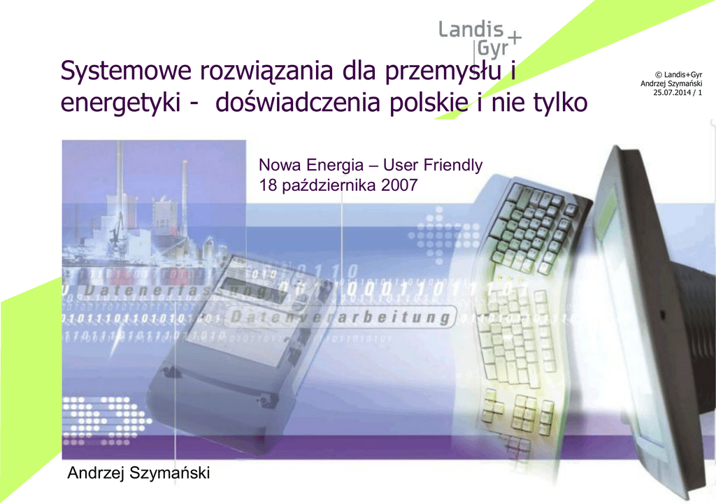 Systemowe rozwiązania dla przemysłu i energetyki - doświadczenia polskie i nie tylko Nowa Energia – User Friendly 18 października 2007 Andrzej Szymański © Landis+Gyr Andrzej Szymański 25.07.2014 / 1 Globalna Wizja Landis+Gyr © Landis+Gyr Andrzej Szymański 25.07.2014 / 2 Zbudować i wciąż rozwijać wiodącą grupę przemysłową w zaawansowanych rozwiązaniach systemowych dla efektywnego zarządzania energią i lepszego poszanowania środowiska naturalnego Partner ... ...zainteresowany wzrostem efektywności biznesowej klienta poprzez systemową obsługę zarządzania energią Podejście systemowe – kompletność kompetencji © Landis+Gyr Andrzej Szymański 25.07.2014 / 3 „Informacja na Rynku Energii jest najcenniejsza.” System to zbiór kompetencji : wiedza, doświadczenie, umiejętności Rozwiązanie systemowe powinno : • Być otwarte – bazować na uznanych standardach, posiadać kompatybilność wsteczną, • Bezpieczne – zagwarantować zachowanie tajemnic handlowych stronom, • Rozwojowe – mieć długi czas życia i możliwość rozwoju, skalowalności Stowarzyszenie dlms międzynarodowe standardy (IEC) © Landis+Gyr Andrzej Szymański 25.07.2014 / 4 IEC 62056-21: Direct Local Data Exchange (3rd edition of IEC 61107) IEC 62056-42: Physical layer services and procedures for connection oriented asynchronous data exchange IEC 62056-46: Data Link Layer using HDLC-Protocol IEC 62056-53: IEC 62056-61: IEC 62056-62: device COSEM Application Layer language OBISmessage Object Identification System specification Interface Objects dlms – więcej informacji na stronie : www.dlms.com Kod OBIS - standardy (IEC) /LGZ4\2ZMD4102100 F.F (00000000) 0.0.1 (417242) 0.1.0 (28) 0.1.2.04 (98-05-01 00:00) 1.2.1 (26068.7*kW) 1.2.2 (15534.8*kW) 1.6.1 (192.4*kW)(99-05-06 10:45) 1.6.1*04 (202.4)(99-04-22 09:30) 1.6.2 (086.7*kW)(99-05-04 22:30) 1.6.2*04 (100.9)(99-04-14 23:00) 1.8.1 (0244948*kWh) 1.8.1*04 (0234520) 1.8.2 (0082520*kWh) 1.8.2*04 (0078197) 5.8.1 (0106103*kvarh) . . . © Landis+Gyr Andrzej Szymański 25.07.2014 / 5 Standardowe systemy informatyczne © Landis+Gyr Andrzej Szymański 25.07.2014 / 6 Standardowe struktury informatyczne © Landis+Gyr Andrzej Szymański 25.07.2014 / 7 Primary Standby #08 HP-MSA500 HP-MSA500 9i 9i #05 AMR Zentrale SAP Metering code Standard Database Tables SAP IS-U ABAP Prog. MCAssign HP Server DL360 HP Server DL360 HP Server DL360 SAPISU_EDM_INTERFACE BAPI (EDM) HP Server DL360 HP Server DL360 Customer Contract #01 #02 LAN Device #03 Upload Loadprofile EtherLite GSM PST N #04 EtherLite GSM PST N Download Redout Orders SAPISU_CCS_INTERFACE #06 #09 Match Progr. Upload Billing Values Interfejs SAP BAPI (CCS) Konfiguracja HotStandby #07 System pomiarowo-rozliczeniowy Dane pomiarowe - liczniki - koncentratory Protokół transmisji danych Komunikacja - metoda - kanał transmisji - interfejs © Landis+Gyr Andrzej Szymański 25.07.2014 / 8 System informatyczny Baza Danych Produkty i rozwiązania dla każdego segmentu © Landis+Gyr Andrzej Szymański 25.07.2014 / 9 Liczniki najwyższej precyzji przesył Liczniki przemysłowe -dystrybucja Advanced Metering Solutions Grid & Transmission Industrial & Commercial  Systemy do zbierania & przetwarzania i kontroli  Rozwiązania „pok klucz”  Kierowanie projektem i wdrożenia Advanced Metering Solution  Serwis i wsparcie techniczne & praca na strukturze AMM converge Liczniki dla odb. komerc. Liczniki komunalne Residential System Converge – rozsądne połączenie pomiarów i rozliczenia © Landis+Gyr Andrzej Szymański 25.07.2014 / 10 Obsługa klienta GSM, GPRS, PSTN Baza danych • • • • • • • Odczyt danych Obróbka danych Dane rozliczeniowe Profile obciążenia Status licznika Zd. spontaniczne Praca automat. Trasy odczytowe Zdalna kontrola • • • • Taryfikacja Poprawność Rozliczenie Obróbka profili obciążenia • Informacje kontraktowe EDI (Energy Data Interchange) System billingowy Internetowy System informacji o poborze energii dla klienta końcowego © Landis+Gyr Andrzej Szymański 25.07.2014 / 11 www100 Server Klient www100 Ostatni rachunek Wizualizacja profilu obc Log On Skróty do zawartości Serwer danych www100 Wizualizacja profilu obc. Otwarte usługi (np. “Wyślij dane pomiarowe !”) Log On Publiczna zawartość sieci Web Hurtownia danych licznikowych Historia konta Zarządzanie klientami Klienci I&C Klienci komunalni Internet Explorer Referencje CONVERGE Siemens UK MDW (Converge, www100) Expanding to 2500 MP © Landis+Gyr Andrzej Szymański 25.07.2014 / 12 NUON, NL Meter Data Warehouse Incl. www100 & www200 50‘000 Load profiles NAM, NL MDW for Gas (& Electricity) Continuous acquisition (5 min) Czech Republic Installed Systems Several MDWs incl. www100 ASP, BE Hosted at Siemens BE Largest Internet Solution (End of 2003) 150 C2000 40 Converge 30 www100 200 MDE2 Energy Services, AT Meter Data Warehouse Interface to EDI-System ASP, CH Hosted at meter2cash Acquisition for NL (1600 MP) Slowenien Stw. Herne, DE Meter Data Warehouse (2) www100 MDW (Converge, www100) 1st SAP-EDM System in DE Transelectrica, RO EOS, CH Continuous acquisition (15 min) MUX-Systems (Fiber optic) ZFA/EDM, CH EnAlpin, Rhonewerke, Lugano, Davos Meter Data Warehouse Converge, www100 Zintegrowane i optymalne rozwiązania pomiarowe dla odbiorców komunalnych – system AIM © Landis+Gyr Andrzej Szymański 25.07.2014 / 13 Wygodny sposób integracji Unikalna platforma integracji (AIMIA) dla tworzenia w pełni funkcjonalnego, dwu kierunkowego, zintegrowanego z licznikami i infrastrukturą spółki systemu. Zaawansowany AMM Czwarta generacja systemu z funkcjami wspomagającymi podstawowe procesy spółek dystrybucyjnych. Wysoka skalowalność. Efektywna komunikacja Uniwersalne i kosztowo efektywne rozwiązania komunikacyjne dla klientów. Wysokiej klasy urządzenia Szeroki zakres liczników energii elektrycznej dla każdej grupy klientów i wszelkich wymagań biznesowych. Referencje skandynawskie © Landis