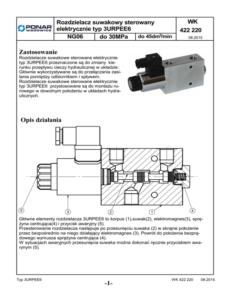 Rozdzielacz suwakowy sterowany elektrycznie typ 3URPEE6 do 45dm3/min NG06 do 30MPa WK 422 220 08.2015 Zastosowanie Rozdzielacze suwakowe sterowane elektrycznie typ 3URPEE6 przeznaczone są do zmiany kierunku przepływu cieczy hydraulicznej w układzie. Głównie wykorzystywane są do przełączania zasilania pomiędzy odbiornikiem i spływem. Rozdzielacze suwakowe sterowane elektrycznie typ 3URPEE6 przystosowane są do montażu rurowego w dowolnym położeniu w układach hydraulicznych. Opis działania 5 3 2 1 4 Główne elementy rozdzielacza 3URPEE6 to korpus (1),suwak(2), elektromagnes(3), sprężyna centrująca(4) i przycisk awaryjny (5). Przesterowanie rozdzielacza następuje po przesunięciu suwaka (2) w skrajne położenie przez bezpośrednio na niego działający elektromagnes (3). Powrót do położenia bezprądowego wymusza sprężyna centrująca (4). W sytuacjach awaryjnych przesunięcia suwaka można dokonać ręcznie przyciskiem awarynym (5). Typ 3URPEE6 -1- WK 422 220 08.2015 DANE TECHNICZNE Ciecz hydrauliczna olej mineralny Wymagana filtracja do 16 µm Zalecana filtracja do 10 µm Lepkość nominalna cieczy 37 mm 2 /s w temperaturze 55 C Zakres temperatury otoczenia Max ciśnienie pracy Czas przesterowania Max liczba przesterowań Masa o o - 30o C do +50 C 30 MPa załączenie wyłączenie do 60 ms do 40 ms 15000 zał./h ok 1,5 kg DC DC Napięcie nominalne zasilania elektromagnesu Tolerancja napięcia zasilania 12V 24V ±10% Stopień ochrony Pobór mocy (prąd stały) IP 65 30 W max 150 o C Temperatura cewki elektromagnesu WYMAGANIA MONTAŻU I EKSPLOATACJI 1. Rozdzielacz sterowany elektrycznie należy użytkować tylko w pełni sprawny i prawidłowo przyłączony do instalacji elektrycznej. Przyłączanie lub odłączanie od instalacji elektrycznej musi być wykonywane przez wykwalifikowany personel. 2. Łączówka uziemiająca ( ) musi być połączona z przewodem ochronnym (PE ) w instalacji zasilającej zgodnie z odpowiednimi przepisami. 3. Zabrania się eksploatacji rozdzielacza jeżeli nie jest zapewniona szczelność i odpowiedni zacisk kabla zasilającego w dławnicy wtyczki. 4. Zabrania się użytkowania rozdzielacza, jeżeli wtyczka nie dolega dokładnie do gniazda elektromagnesu i nie jest zabezpieczona poprzez dokręcenie do oporu wkręta mocującego. 5. Ze względu na nagrzewanie się cewki elektromagnesu do wysokiej temperatury rozdzielacze powinny być umiejscowione tak,aby wyeliminować możliwość przypadkowego kontaktu z nim podczas eksploatacji lub należy przewidzieć odpowiednie osłony (zgodnie z wymaganiami norm europejskich: PN - EN ISO 13732-1 i PN - EN 982. SCHEMAT Typ 3URPEE6 -2- WK 422 220 08.2015 WYMIARY GABARYTOWE I PRZYŁĄCZENIOWE Wtyczka wg DIN43650-A/ISO4400 O 97,3 26 70 12,5 45 8 6, 60,5 14 35 45 43 O G3/8 wg I " -3 gn SO 1 179- iazda 1 92,5 8,2 173 Typ 3URPEE6 -3- WK 422 220 08.2015 Wykres charakterystyki ∆ p(Q) dla rozdzielacza typ 3URPEE6... Charakterystyka oporów przepływu 14 12 ∆p [bar] 10 8 P->C 6 P->T 4 2 0 10 20 30 40 50 Q [dm3/min] Przykład zastosowania w układzie hydraulicznym Typ 3URPEE6 -4- WK 422 220 08.2015 Sposób zamawiania 3URPEE6-12/G12NZ4 * Nr serii 12 = 12 (10-20) niezmienne wym. przył.i zabudowy Napięcie zasilania elektromagnesu z przyciskiem awaryjnego przesterowania 12V DC = G12N 24V DC = G24N Wtyczka elektromagnesu wtyczka Z4 = Z4 wtyczka Z4L (z lampką ) = Z4L Rodzaj uszczelnienia NBR(dla cieczy na bazie olejów mineralnych) =bez oznaczenia FPM(dla cieczy na bazie estrów fosforanowych) =V Ewentualne dodatkowe wymagania określone w sposób opisowy (do uzgodnienia z producentem) PONAR Wadowice S.A. ul. Wojska Polskiego 29 34-100 Wadowice tel. +48 33 823 44 41 - 45 fax.+48 33 823 41 69 www.ponar-wadowice.pl Typ 3URPEE6 -5- WK 422 220 08.2015