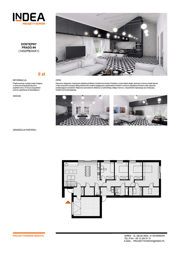 DOSTĘPNY PRADO #4 (1402/PB/X4X1) 0 zł INFORMACJA: OPIS: Projekt aranżacji i wystroju wnętrz dostępny w cenie promocyjnej tylko łącznie z projektem domu. W innych przypadkach cena do uzgodnienia ze Sprzedającym. Klasyczne i eleganckie, inspirowane stylistyką architektury śródziemnomorskiej. Posadzka z czarno-białych płytek, ułożonych w formę mozaiki stanowi motyw przewodni koncepcji. Efekt przestronności wnętrza spotęgowano zastosowanymi lustrami i czarnymi, połyskliwymi frontami mebli, optycznie powiększającymi przestrzeń. Miejscowo wprowadzono okładziny ze szlachetnego, białego marmuru - bezpośrednio kojarzącego się z tradycyjną, śródziemnomorską elegancją. WIDOKI: ARANŻACJA PARTERU: PROJEKTYDOMOW.INDEA.PL ADRES: UL. SZLAK 39/2A, 31-153 KRAKÓW TEL./FAX: +48 12 294 81 31 E-MAIL: [email protected]