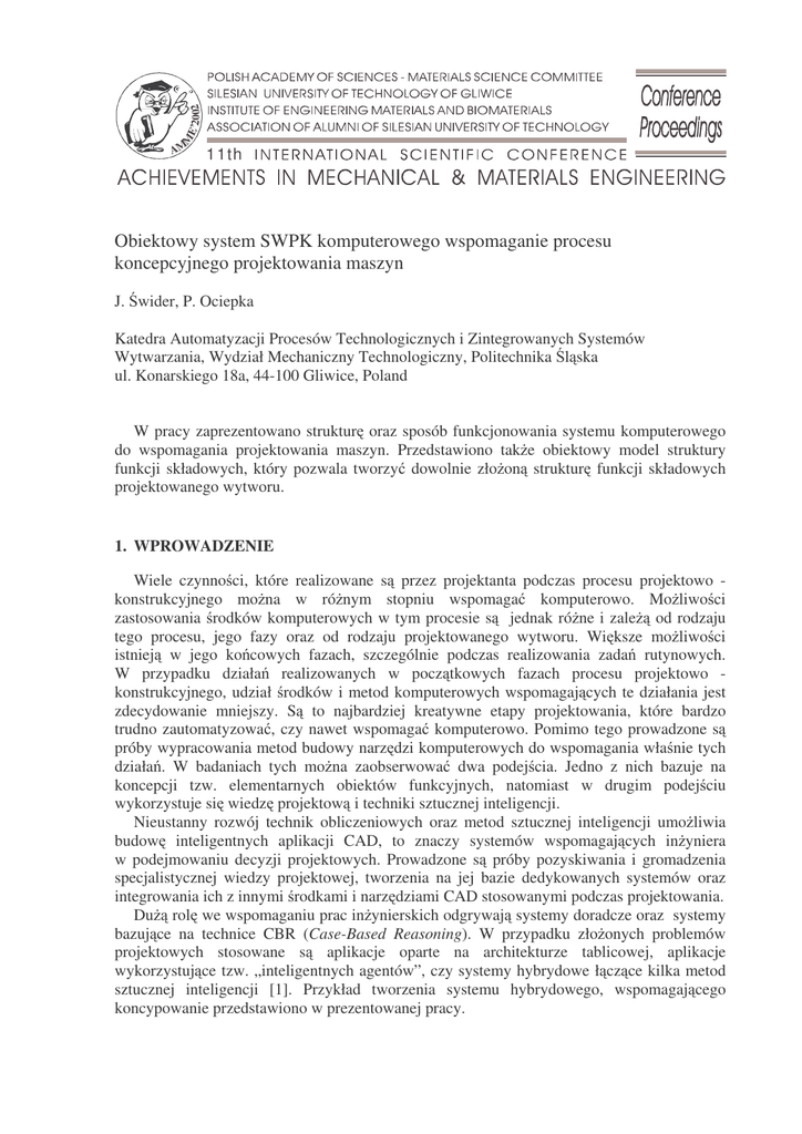 2. P. Ociepka: Metoda komputerowego wspomagania projektowania koncepcyjnego maszyn.