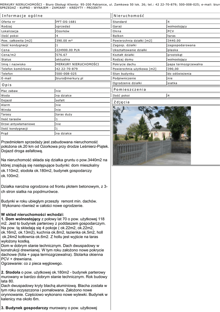 MERKURY NIERUCHOMOŚCI - Biuro Obsługi Klienta: 95-200 Pabianice, ul. Zamkowa 50 lok. 26; tel.: 42 22-70-879; 500-008-025; e-mail: biuro SPRZEDAŻ - KUPNO - WYNAJEM - ZAMIANY - KREDYTY - PROJEKTY Informacje ogólne Nieruchomość Oferta nr PFT-DS-1681 Standard 4 Rodzaj sprzedaż Garaż wolnostojący Lokalizacja Ozorków Okna PCV Ilość pokoi 4 Balkon taras Pow. całkowita [m2] 390.00 m² Powierzchnia działki [m2] 3440.00 Ilość kondygnacji 1 Zagosp. działki zagospodarowana Cena 224900.00 PLN Ukształtowanie działki płaska Cena/m2 576.67 Kształt działki prostokąt Status aktualna Rodzaj domu wolnostojący Imię i nazwisko MERKURY NIERUCHOMOŚCI Pokrycie dachu papa termozgrzewalna Telefon komórkowy 42 22-70-879 Powierzchnia użytkowa [m2] 390,00 Telefon 500-008-025 Stan budynku do odświeżenia E-mail [email protected] Podpiwniczenie nie Ogrodzenie działki siatka Opis Plac zabaw nie Pomieszczenia Woda na działce Ilość pokoi Dojazd asfalt Alarm nie Winda nie Tarasy taras duży Ilość tarasów 1 Drzwi antywłamaniowe nie Ilość kondygnacji 1 Prąd na działce Przedmiotem sprzedaży jest zabudowana nieruchomość położona ok.20 km od Ozorkowa przy drodze Leśmierz-Piątek. Dojazd droga asfaltową. Na nieruchomość składa się działka gruntu o pow.3440m2 na której znajdują się następujące budynki: dom mieszkalny ok.110m2, stodoła ok.180m2, budynek gospodarczy ok.100m2. Działka narożna ogrodzona od frontu płotem betonowym, z 3ch stron siatka na popdmurówce. Budynki w roku ubiegłym przeszły remont min. dachów. Wykonano również w całości nowe ogrodzenie. W skład nieruchomości wchodzi: 1. Dom wolnostojący z połowy lat 70 o pow. użytkowej 118 m2. Jest to budynek parterowy z poddaszem gospodarczym. Na pow. tą składają się 4 pokoje ( ok.22m2, ok.22m2, ok.16m2, ok.13m2), kuchnia ok.8m2, łazienka ok.5m2, holl ok.24m2 kotłownia ok.6m2. Z hollu jest wyjście na taras wyłożony kostką. Dom w dobrym stanie technicznym. Dach dwuspadowy w konstrukcji drewnianej. W tym roku założono nowe pokrycie dachowe (folia + papa termozgrzewalna). Stolarka okienna PCV + drewniana. Ogrzewanie: co z pieca węglowego. 2. Stodoła o pow. użytkowej ok.180m2 - budynek parterowy murowany w bardzo dobrym stanie technicznym. Rok budowy lata 80. Dach dwuspadowy kryty blachą aluminiową. Blacha została w tym roku oczyszczona i pomalowana. Założono nowe orynnowanie. Częściowo wykonano nowe wylewki. Budynek w kalenicy ma około 6m. 3. Budynek gospodarczy murowany o pow. użytkowej Zdjęcia 4 100m2. Budynek został poddany w tym tym roku modernizacji. Dwie ściany zewnętrzne pobudowano od podstaw. Również zostało wymienione pokrycie dachu (tj. więżba dachowa w części wymieniona na nową i została położona papa termozgrzewalna). DZIAŁKA o pow. 3440 m2. Klasa ziemii: III. Możliwość dokupienia dodatkowo działki o pow. ok.5000m2 usytuowanej po drugiej stronie ulicy. OGRODZENIE - w całości nowe. Z frontu są płyty betonowe po bokach: siatka. MEDIA:elektryczność, woda, szambo. Jest to również idealne miejsce na prowadzenie działalności gospodarczej. Odległość od Łodzi to około 35 km, od Zgierza około 25km, od Łęczycy około 15km. Do wjazdu na autostradę A1 jest zaledwie 8km. UWAGA: w rozliczeniu może być mieszkanie typu M-3 położone w Łęczycy, Zgierzu, Ozorkowie, Łodzi. Stan prawny: uregulowany. Brak jakichkolwiek obciążeń. Uwaga! Dane w ofercie mogą odbiegać od stanu faktycznego, mają jedynie charakter informacyjny, oparte są na informacjach uzyskanych od klientów zgłaszających. Oferta nie stanowi oferty w rozumieniu kodeksu cywilnego. Oferta może być w danym momencie nieaktualna. Prosimy o kontakt telefoniczny lub e-mailowy.Więcej ofert na naszej stronie www MERKURY NIERUCHOMOŚCI - Biuro Obsługi Klienta: 95-200 Pabianice, ul. Zamkowa 50 lok. 26; tel: 42 22-70-879; 500-008-025; e-mail: biu KUPNO - SPRZEDAŻ - WYNAJEM - ZAMIANA - KREDYTY - PROJEKTY