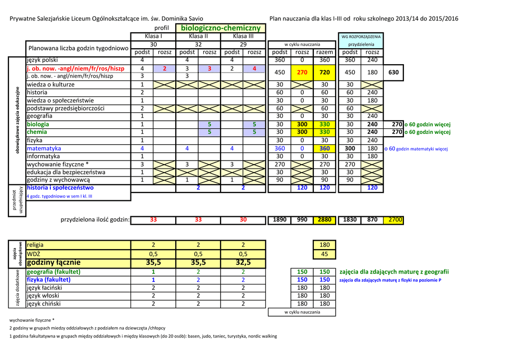 Prywatne Salezjańskie Liceum Ogólnokształcące im. św. Dominika Savio profil biologiczno-chemiczny Klasa I Klasa II Klasa III 30 32 29 Planowana liczba godzin tygodniowo podst rozsz podst rozsz podst rozsz język polski 4 4 4 j. ob. now. -angl/niem/fr/ros/hiszp 4 2 3 3 2 4 j. ob. now. - angl/niem/fr/ros/hiszp 3 3 wiedza o kulturze 1 historia 2 wiedza o społeczeństwie 1 podstawy przedsiębiorczości 2 geografia 1 biologia 1 5 5 chemia 1 5 5 fizyka 1 matematyka 4 4 4 informatyka 1 wychowanie fizyczne * 3 3 3 edukacja dla bezpieczeństwa 1 godziny z wychowawcą 1 1 1 historia i społeczeństwo 2 2 Plan nauczania dla klas I-III od roku szkolnego 2013/14 do 2015/2016 WG ROZPORZĄDZENIA w cyklu nauczania przedmiot uzupełniający razem 360 podst 360 rozsz 240 450 270 720 450 180 30 60 30 60 30 30 30 30 300 30 270 30 90 120 30 60 30 60 30 330 330 30 360 30 270 30 90 120 990 2880 1830 30 60 30 60 30 30 30 30 360 30 270 30 90 obowiązkowe zajęcia edukacyjne 33 za dużo godzin religia WDŻ 33 za dużo godzin 3 do zdjęcia do zdjęcia zajęcia obowiązkowe rozsz 0 0 0 0 300 300 0 0 0 630 240 180 240 240 240 240 180 180 270 o 60 godzin więcej 270 o 60 godzin więcej o 60 godzin matematyki więcej 120 4 godz. tygodniowo w sem I kl. III przydzielona ilość godzin: zajęcia dodatkowe przydzielenia podst 360 30 1890 870 2700 za dużo godzin 1 do zdjęcia 1 2 0,5 2 0,5 2 0,5 godziny łącznie 35,5 35,5 32,5 geografia (fakultet) fizyka (fakultet) język łaciński język włoski język chiński 1 1 2 2 2 2 2 2 2 2 2 2 2 2 2 180 45 150 150 zajęcia dla zdających maturę z geografii 150 150 zajęcia dla zdających maturę z fizyki na poziomie P 180 180 180 180 180 przydzielona łączna liczba180 godzin w cyklu nauczania wychowanie fizyczne * 2 godziny w grupach miedzy oddziałowych z podziałem na dziewczęta /chłopcy 1 godzina fakultatywna w grupach między oddziałowych i między klasowych (do 20 osób): basen, judo, taniec, turystyka, nordic walking