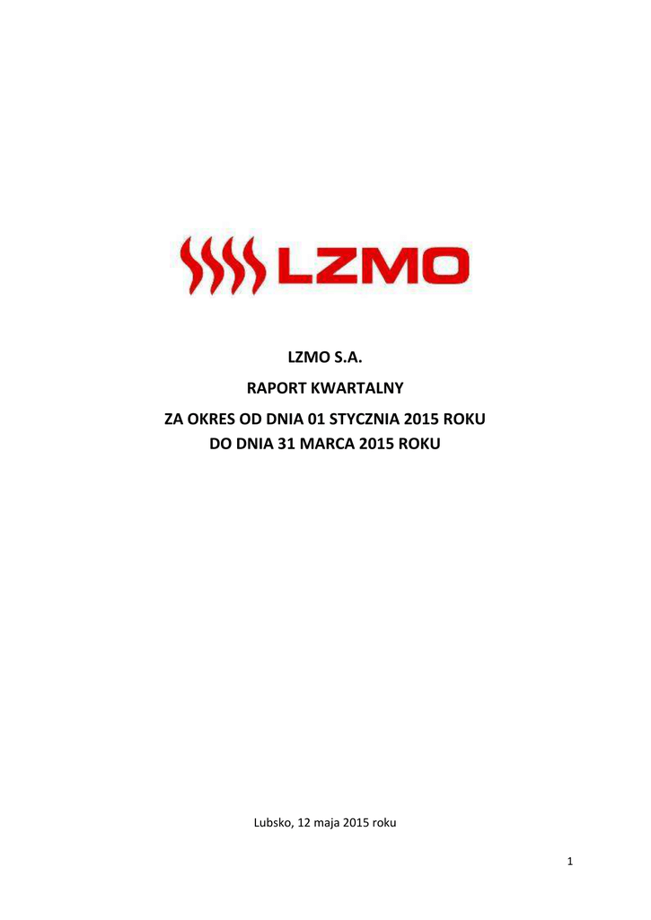 lzmo sa raport kwartalny za okres od dnia 01 stycznia 2015 roku do
