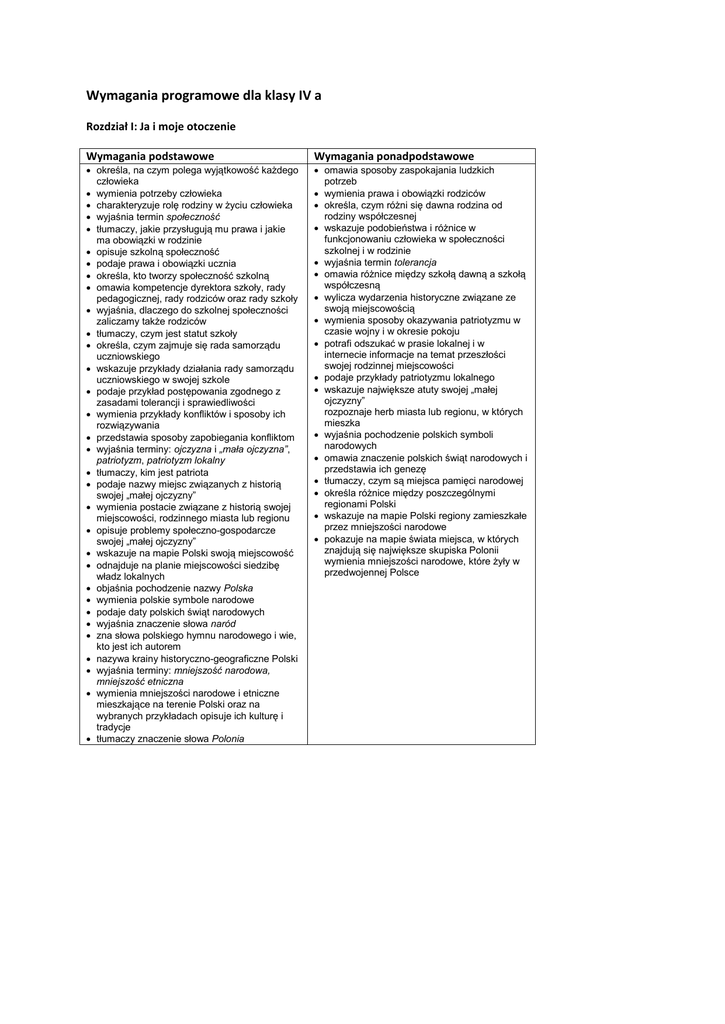 Wymagania programowe dla klasy IV a Rozdział I: Ja i moje otoczenie Wymagania podstawowe Wymagania ponadpodstawowe określa, na czym polega wyjątkowość każdego człowieka wymienia potrzeby człowieka charakteryzuje rolę rodziny w życiu człowieka wyjaśnia termin społeczność tłumaczy, jakie przysługują mu prawa i jakie ma obowiązki w rodzinie opisuje szkolną społeczność podaje prawa i obowiązki ucznia określa, kto tworzy społeczność szkolną omawia kompetencje dyrektora szkoły, rady pedagogicznej, rady rodziców oraz rady szkoły wyjaśnia, dlaczego do szkolnej społeczności zaliczamy także rodziców tłumaczy, czym jest statut szkoły określa, czym zajmuje się rada samorządu uczniowskiego wskazuje przykłady działania rady samorządu uczniowskiego w swojej szkole podaje przykład postępowania zgodnego z zasadami tolerancji i sprawiedliwości wymienia przykłady konfliktów i sposoby ich rozwiązywania przedstawia sposoby zapobiegania konfliktom wyjaśnia terminy: ojczyzna i „mała ojczyzna”, patriotyzm, patriotyzm lokalny tłumaczy, kim jest patriota podaje nazwy miejsc związanych z historią swojej „małej ojczyzny” wymienia postacie związane z historią swojej miejscowości, rodzinnego miasta lub regionu opisuje problemy społeczno-gospodarcze swojej „małej ojczyzny” wskazuje na mapie Polski swoją miejscowość odnajduje na planie miejscowości siedzibę władz lokalnych objaśnia pochodzenie nazwy Polska wymienia polskie symbole narodowe podaje daty polskich świąt narodowych wyjaśnia znaczenie słowa naród zna słowa polskiego hymnu narodowego i wie, kto jest ich autorem nazywa krainy historyczno-geograficzne Polski wyjaśnia terminy: mniejszość narodowa, mniejszość etniczna wymienia mniejszości narodowe i etniczne mieszkające na terenie Polski oraz na wybranych przykładach opisuje ich kulturę i tradycje tłumaczy znaczenie słowa Polonia omawia sposoby zaspokajania ludzkich potrzeb wymienia prawa i obowiązki rodziców określa, czym różni się dawna rodzina od rodziny współczesnej wskazuje podobieństwa i różnice w funkcjonowaniu człowieka w społeczności szkolnej i w rodzinie wyjaśnia termin tolerancja omawia różnice między szkołą dawną a szkołą współczesną wylicza wydarzenia historyczne związane ze swoją miejscowością wymienia sposoby okazywania patriotyzmu w czasie wojny i w okresie pokoju potrafi odszukać w prasie lokalnej i w internecie informacje na temat przeszłości swojej rodzinnej miejscowości podaje przykłady patriotyzmu lokalnego wskazuje największe atuty swojej „małej ojczyzny” rozpoznaje herb miasta lub regionu, w których mieszka wyjaśnia pochodzenie polskich symboli narodowych omawia znaczenie polskich świąt narodowych i przedstawia ich genezę tłumaczy, czym są miejsca pamięci narodowej określa różnice między poszczególnymi regionami Polski wskazuje na mapie Polski regiony zamieszkałe przez mniejszości narodowe pokazuje na mapie świata miejsca, w których znajdują się największe skupiska Polonii wymienia mniejszości narodowe, które żyły w przedwojennej Polsce Rozdział II: Z historią na ty Wymagania podstawowe Wymagania ponadpodstawowe wyjaśnia pochodzenie terminu historia tłumaczy, dlaczego uczymy się historii objaśnia znaczenie zdania: Historia jest nauczycielką życia omawia, jakie są zadania historii podaje po jednym przykładzie postaci baśniowej, legendarnej i historycznej przedstawia historię swojej miejscowości lub rodziny wyjaśnia, dlaczego historyk powinien czerpać informacje z różnych źródeł historycznych charakteryzuje nowoczesne metody badawcze dostrzega rolę, jaką odgrywają muzea, skanseny i archiwa w dziedzinie ochrony źródeł historycznych odpowiada, dlaczego zabytki podlegają ochronie prawnej tłumaczy, w jaki sposób chroni się źródła historyczne i zabytki wskazuje, gdzie znajduje się najbliższe muzeum objaśnia, w jaki sposób należy zachowywać się w muzeum wyjaśnia, dlaczego historyk powinien czerpać informacje z różnych źródeł historycznych charakteryzuje nowoczesne metody badawcze dostrzega rolę, jaką odgrywają muzea, skanseny i archiwa w dziedzinie ochrony źródeł historycznych odpowiada, dlaczego zabytki podlegają ochronie prawnej tłumaczy, w jaki sposób chroni się źródła historyczne i zabytki wskazuje, gdzie znajduje się najbliższe muzeum objaśnia, w jaki sposób należy zachowywać się w muzeum wyjaśnia, czym jest historia i przeszłość tłumaczy, kim jest historyk określa różnice między legendą i baśnią odróżnia postacie historyczne od postaci legendarnych wskazuje przyczyny, przebieg i skutki wydarzeń historycznych podaje przykłady efektów prac historyków wyjaśnia terminy: źródło historyczne, archeologia określa, czym zajmuje się archeolog dokonuje podziału źródeł historycznych oraz podaje ich konkretne przykłady wymienia informacje, jakie możemy zdobyć na podstawie źródeł historycznych tłumaczy, na czym polega działalność archiwów, muzeów i skansenów wskazuje podobieństwa i różnice między muzeum a skansenem wskazuje na znaczenie pamiątek rodzinnych i podaje ich przykłady wyjaśnia, czym jest ród omawia, w jaki sposób kultywowanie tradycji umacnia poczucie wspólnoty w rodzinie określa, czym zajmuje się genealogia tłumaczy, czym jest drzewo genealogiczne Rozdział III: Czas i mapa w historii Wymagania podstawowe Wymagania ponadpodstawowe wyjaśnia termin chronologia wskazuje narodziny Jezusa z Nazaretu jako początek naszej ery odczytuje skróty: p.n.e. i n.e. określa czas trwania wieku i tysiąclecia zapisuje liczby arabskie cyframi rzymskimi rysuje oś czasu i umieszcza na niej daty porządkuje daty w sposób chronologiczny posługuje się terminami: data, era, epoka historyczna, tysiąclecie, wiek, prehistoria wymienia epoki historyczne oblicza, ile czasu upłynęło między poszczególnymi wydarzeniami ustala, w któr