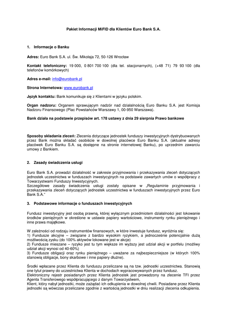 Pakiet Informacji MiFID dla Klientów Euro Bank S.A. 1. Informacje o