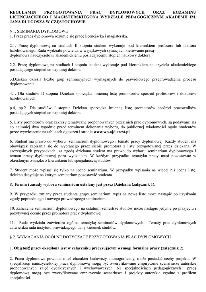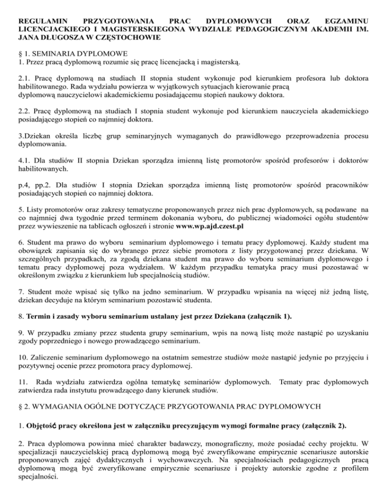 REGULAMIN PRZYGOTOWANIA PRAC DYPLOMOWYCH ORAZ EGZAMINU LICENCJACKIEGO I MAGISTERSKIEGONA WYDZIALE PEDAGOGICZNYM AKADEMII IM. JANA DŁUGOSZA W CZĘSTOCHOWIE § 1. SEMINARIA DYPLOMOWE 1. Przez pracą dyplomową rozumie się pracę licencjacką i magisterską. 2.1. Pracę dyplomową na studiach II stopnia student wykonuje pod kierunkiem profesora lub doktora habilitowanego. Rada wydziału powierza w wyjątkowych sytuacjach kierowanie pracą dyplomową nauczycielowi akademickiemu posiadającemu stopień naukowy doktora. 2.2. Pracę dyplomową na studiach I stopnia student wykonuje pod kierunkiem nauczyciela akademickiego posiadającego stopień co najmniej doktora. 3.Dziekan określa liczbę grup seminaryjnych wymaganych do prawidłowego przeprowadzenia procesu dyplomowania. 4.1. Dla studiów II stopnia Dziekan sporządza imienną listę promotorów spośród profesorów i doktorów habilitowanych. p.4, pp.2. Dla studiów I stopnia Dziekan sporządza imienną listę promotorów spośród pracowników posiadających stopień co najmniej doktora. 5. Listy promotorów oraz zakresy tematyczne proponowanych przez nich prac dyplomowych, są podawane na co najmniej dwa tygodnie przed terminem dokonania wyboru, do publicznej wiadomości ogółu studentów przez wywieszenie na tablicach ogłoszeń i stronie www.wp.ajd.czest.pl 6. Student ma prawo do wyboru seminarium dyplomowego i tematu pracy dyplomowej. Każdy student ma obowiązek zapisania się do wybranego przez siebie promotora z listy przygotowanej przez dziekana. W szczególnych przypadkach, za zgodą dziekana student ma prawo do wyboru seminarium dyplomowego i tematu pracy dyplomowej poza wydziałem. W każdym przypadku tematyka pracy musi pozostawać w określonym związku z kierunkiem lub specjalnością studiów. 7. Student może wpisać się tylko na jedno seminarium. W przypadku wpisania na więcej niż jedną listę, dziekan decyduje na którym seminarium pozostawić studenta. 8. Termin i zasady wyboru seminarium ustalany jest przez Dziekana (załącznik 1). 9. W przypadku zmiany przez studenta grupy seminarium, wpis na nową listę może nastąpić po uzyskaniu zgody poprzedniego i nowego prowadzącego seminarium. 10. Zaliczenie seminarium dyplomowego na ostatnim semestrze studiów może nastąpić jedynie po przyjęciu i pozytywnej ocenie przez promotora pracy dyplomowej. 11. Rada wydziału zatwierdza ogólna tematykę seminariów dyplomowych. zatwierdza rada instytutu prowadzącego dany kierunek studiów. Tematy prac dyplomowych § 2. WYMAGANIA OGÓLNE DOTYCZĄCE PRZYGOTOWANIA PRAC DYPLOMOWYCH 1. Objętość ć pracy określona jest w załączniku precyzującym wymogi formalne pracy (załącznik 2). 2. Praca dyplomowa powinna mieć charakter badawczy, monograficzny, może posiadać cechy projektu. W specjalizacji nauczycielskiej pracą dyplomową mogą być zweryfikowane empirycznie scenariusze autorskie proponowanych zajęć dydaktycznych i wychowawczych. Na specjalnościach pedagogicznych pracą dyplomową mogą być zweryfikowane empirycznie scenariusze i projekty autorskie zgodne z profilem specjalności. 3. Praca licencjacka może mieć charakter ilościowy, jakościowy lub też może być wynikiem łączenia podejścia ilościowego z jakościowym. 4. Temat pracy powinien jednoznacznie wykazywać związek z kierunkiem studiów, na którym praca jest pisana i tematyką działalności naukowej prowadzących seminaria dyplomowe. 5. Przy ustalaniu tematu pracy dyplomowej powinny być brane pod uwagę zainteresowania naukowe studenta. 6. Praca dyplomowa może być napisana w języku obcym, jeśli wniosek studenta w tej sprawie zostanie pozytywnie zaopiniowany przez promotora pracy i uzyska zgodę dziekana. 7. W pracy student powinien uwzględnić formaty redakcyjne opracowane odrębnie dla każdego kierunku funkcjonującego w obrębie Wydziału Pedagogicznego (załącznik 2) 8. Praca nie może nosić cech plagiatu. 9. Losowo wybrane prace muszą być sprawdzone przez program Plagiat (lub inny program pozwalający określić samodzielność pisanej pracy). W przypadku wątpliwości promotor może każdą prace sprawdzić w programie Plagiat. Dziekan określa ile prac podlega sprawdzeniu w danym roku akademickim. 10. Praca podlega recenzji dokonywanej przez promotora i recenzenta zgodnie z opisem w § 4 niniejszego regulaminu. 11. Przygotowanie pracy dyplomowej powinno ukształtować umiejętności: - samodzielnego studiowania i krytycznej analizy literatury, - diagnozowania i oceny instytucji, zjawisk, sytuacji, zdarzeń społecznych oraz problemów indywidualnych i zbiorowych mieszczących się w ramach zagadnień poruszanych w treściach i programach kształcenia obowiązujących na kierunku oraz wybranej przez studenta specjalności, - obserwowania i analizy zjawisk społecznych, zwłaszcza tych, z którymi absolwent będzie miał do czynienia w praktyce, dostrzegania prawidłowości występujących w życiu społecznym (indywidualnym i zbiorowym), wyciągania właściwych wniosków, podejmowania działań praktycznych (np. profilaktycznych, edukacyjnych, informacyjnych, terapeutycznych, itp.), - posługiwania się nabytą w czasie studiów wiedzą i wykorzystania jej w praktyce - posługiwania się jasnym i precyzyjnym językiem oraz prowadzenia logicznego wywodu. 12. Praca powinna być napisana poprawnym językiem, bez błędów gramatycznych i stylistycznych. Promotor ma prawo odrzucić pracę z istotnymi błędami merytorycznymi, formalnymi, gramatycznymi i stylistycznymi. Prace zawierające wspomniane uchybienia mogą być także dyskwalifikowane przez recenzentów i przez komisję egzaminacyjną. § 3. WYMOGI FORMALNE I REDAKCYJNE PRACY DYPLOMOWEJ 1. Wymogi formalne stawiane pracom dyplomowym są właściwe dla kierunku studiów. Na Wydziale Pedagogicznym przyjmuje się odrębne wymogi formalne dla każdego kierunku funkcjonującego w obrębie Wydziału Pedagogicznego (załącznik 2) 2. Przyjmuje się wymogi redakcyjne prac 