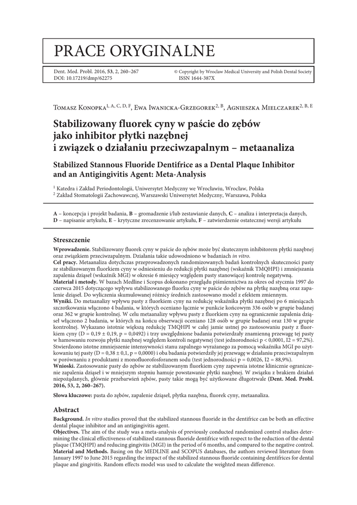 PRACE ORYGINALNE Dent. Med. Probl. 2016, 53, 2, 260–267 DOI: 10.17219/dmp/62275 © Copyright by Wroclaw Medical University and Polish Dental Society ISSN 1644-387X Tomasz Konopka1, A, C, D, F, Ewa Iwanicka-Grzegorek2, B, Agnieszka Mielczarek2, B, E Stabilizowany fluorek cyny w paście do zębów jako inhibitor płytki nazębnej i związek o działaniu przeciwzapalnym – metaanaliza Stabilized Stannous Fluoride Dentifrice as a Dental Plaque Inhibitor and an Antigingivitis Agent: Meta-Analysis 1Katedra 2Zakład i Zakład Periodontologii, Uniwersytet Medyczny we Wrocławiu, Wrocław, Polska Stomatologii Zachowawczej, Warszawski Uniwersytet Medyczny, Warszawa, Polska A – koncepcja i projekt badania, B – gromadzenie i/lub zestawianie danych, C – analiza i interpretacja danych, D – napisanie artykułu, E – krytyczne zrecenzowanie artykułu, F – zatwierdzenie ostatecznej wersji artykułu Streszczenie Wprowadzenie. Stabilizowany fluorek cyny w paście do zębów może być skutecznym inhibitorem płytki nazębnej oraz związkiem przeciwzapalnym. Działania takie udowodniono w badaniach in vitro. Cel pracy. Metaanaliza dotychczas przeprowadzonych randomizowanych badań kontrolnych skuteczności pasty ze stabilizowanym fluorkiem cyny w odniesieniu do redukcji płytki nazębnej (wskaźnik TMQHPI) i zmniejszania zapalenia dziąseł (wskaźnik MGI) w okresie 6 miesięcy względem pasty stanowiącej kontrolę negatywną. Materiał i metody. W bazach Medline i Scopus dokonano przeglądu piśmiennictwa za okres od stycznia 1997 do czerwca 2015 dotyczącego wpływu stabilizowanego fluorku cyny w paście do zębów na płytkę nazębną oraz zapalenie dziąseł. Do wyliczenia skumulowanej różnicy średnich zastosowano model z efektem zmiennym. Wyniki. Do metaanalizy wpływu pasty z fluorkiem cyny na redukcję wskaźnika płytki nazębnej po 6 miesiącach szczotkowania włączono 4 badania, w których oceniano łącznie w punkcie końcowym 336 osób w grupie badanej oraz 362 w grupie kontrolnej. W celu metaanalizy wpływu pasty z fluorkiem cyny na ograniczenie zapalenia dziąseł włączono 2 badania, w których na końcu obserwacji oceniano 128 osób w grupie badanej oraz 130 w grupie kontrolnej. Wykazano istotnie większą redukcję TMQHPI w całej jamie ustnej po zastosowaniu pasty z fluorkiem cyny (D = 0,19 ± 0,19, p = 0,0492) i trzy uwzględnione badania potwierdzały znamienną przewagę tej pasty w hamowaniu rozwoju płytki nazębnej względem kontroli negatywnej (test jednorodności p < 0,0001, I2 = 97,2%). Stwierdzono istotne zmniejszenie intensywności stanu zapalnego wyrażanego za pomocą wskaźnika MGI po użytkowaniu tej pasty (D = 0,38 ± 0,1, p = 0,0000) i oba badania potwierdziły jej przewagę w działaniu przeciwzapalnym w porównaniu z produktami z monofluorofosforanem sodu (test jednorodności p = 0,0026, I2 = 88,9%). Wnioski. Zastosowanie pasty do zębów ze stabilizowanym fluorkiem cyny zapewnia istotne klinicznie ograniczenie zapalenia dziąseł i w mniejszym stopniu hamuje powstawanie płytki nazębnej. W związku z brakiem działań niepożądanych, głównie przebarwień zębów, pasty takie mogą być użytkowane długotrwale (Dent. Med. Probl. 2016, 53, 2, 260–267). Słowa kluczowe: pasta do zębów, zapalenie dziąseł, płytka nazębna, fluorek cyny, metaanaliza. Abstract Background. In vitro studies proved that the stabilized stannous fluoride in the dentifrice can be both an effective dental plaque inhibitor and an antigingivitis agent. Objectives. The aim of the study was a meta-analysis of previously conducted randomized control studies determining the clinical effectiveness of stabilized stannous fluoride dentifrice with respect to the reduction of the dental plaque (TMQHPI) and reducing gingivitis (MGI) in the period of 6 months, and compared to the negative control. Material and Methods. Basing on the MEDLINE and SCOPUS databases, the authors reviewed literature from January 1997 to June 2015 regarding the impact of the stabilized stannous fluoride containing dentifrices for dental plaque and gingivitis. Random effects model was used to calculate the weighted mean difference. 261 SnF2 – inhibitor płytki i efekt przeciwzapalny Results. For the purpose of meta-analysis of the effect of stannous fluoride containing dentifrice on the reduction of the plaque after 6 months of brushing, 4 studies were evaluated. In order to check the influence of SnF2-containing dentifrice on gingivitis reduction, meta-analysis included two studies. The significant reduction of TMQHPI in the oral cavity was observed for SnF2 dentifrice (D = 0.19 ± 0.19, p = 0.0492). Three of the mentioned studies confirmed the significant advantage of this toothpaste in reducing plaque when compared to the negative control (test of heterogeneity p < 0.0001, I2 = 97.2%). Statistically significant reduction of the intensity of gingivitis, expressed with the MGI index, was observed when this toothpaste was used (D = 0.38 ± 0.1, p = 0.0000). Both of the studies confirmed the superiority in anti-inflammatory action when compared to the products containing sodium monofluorophosphate (test of heterogeneity p = 0.0026, I2 = 88.9%). Conclusions. Using the dentifrice containing stabilized stannous fluoride guarantees statistically significant difference in reducing gingivitis and, in smaller range, reduces dental plaque. Due to lack of side effects, mainly teeth discolorations, such toothpastes may be used for a long period of time (Dent. Med. Probl. 2016, 53, 2, 260–267). Key words: toothpaste, gingivitis, dental plaque, stannous fluoride, meta-analysis. Pasta do zębów we współczesnej profilaktyce stomatologicznej powinna zawierać związki o udowodnionym działaniu hamującym rozwój płytki nazębnej. Bardzo pożądana jest także, niezależnie od wpływu na płytkę, obecność składników przeciwzapalnych. Takim związkiem antypłytkowym i o niezależnym działaniu przeciwzapalnym 