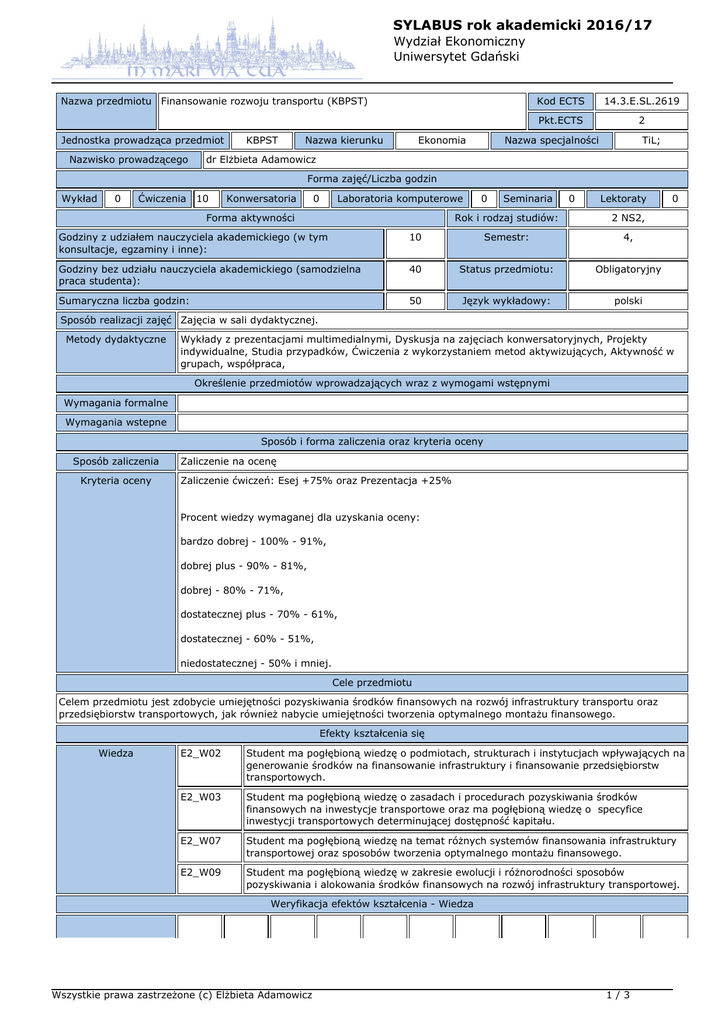 SYLABUS rok akademicki 2016/17 Wydział Ekonomiczny Uniwersytet Gdański Nazwa przedmiotu Finansowanie rozwoju transportu (KBPST) Jednostka prowadząca przedmiot Nazwisko prowadzącego KBPST Nazwa kierunku Ekonomia Kod ECTS 14.3.E.SL.2619 Pkt.ECTS 2 Nazwa specjalności TiL; dr Elżbieta Adamowicz Forma zajęć/Liczba godzin Wykład 0 Ćwiczenia 10 Konwersatoria 0 Laboratoria komputerowe Forma aktywności 0 Seminaria 0 Lektoraty Rok i rodzaj studiów: 2 NS2, Godziny z udziałem nauczyciela akademickiego (w tym konsultacje, egzaminy i inne): 10 Semestr: 4, Godziny bez udziału nauczyciela akademickiego (samodzielna praca studenta): 40 Status przedmiotu: Obligatoryjny Sumaryczna liczba godzin: 50 Język wykładowy: polski 0 Sposób realizacji zajęć Zajęcia w sali dydaktycznej. Metody dydaktyczne Wykłady z prezentacjami multimedialnymi, Dyskusja na zajęciach konwersatoryjnych, Projekty indywidualne, Studia przypadków, Ćwiczenia z wykorzystaniem metod aktywizujących, Aktywność w grupach, współpraca, Określenie przedmiotów wprowadzających wraz z wymogami wstępnymi Wymagania formalne Wymagania wstepne Sposób i forma zaliczenia oraz kryteria oceny Sposób zaliczenia Kryteria oceny Zaliczenie na ocenę Zaliczenie ćwiczeń: Esej +75% oraz Prezentacja +25% Procent wiedzy wymaganej dla uzyskania oceny: bardzo dobrej - 100% - 91%, dobrej plus - 90% - 81%, dobrej - 80% - 71%, dostatecznej plus - 70% - 61%, dostatecznej - 60% - 51%, niedostatecznej - 50% i mniej. Cele przedmiotu Celem przedmiotu jest zdobycie umiejętności pozyskiwania środków finansowych na rozwój infrastruktury transportu oraz przedsiębiorstw transportowych, jak również nabycie umiejętności tworzenia optymalnego montażu finansowego. Efekty kształcenia się Wiedza E2_W02 Student ma pogłębioną wiedzę o podmiotach, strukturach i instytucjach wpływających na generowanie środków na finansowanie infrastruktury i finansowanie przedsiębiorstw transportowych. E2_W03 Student ma pogłębioną wiedzę o zasadach i procedurach pozyskiwania środków finansowych na inwestycje transportowe oraz ma pogłębioną wiedzę o specyfice inwestycji transportowych determinującej dostępność kapitału. E2_W07 Student ma pogłębioną wiedzę na temat różnych systemów finansowania infrastruktury transportowej oraz sposobów tworzenia optymalnego montażu finansowego. E2_W09 Student ma pogłębioną wiedzę w zakresie ewolucji i różnorodności sposobów pozyskiwania i alokowania środków finansowych na rozwój infrastruktury transportowej. Weryfikacja efektów kształcenia - Wiedza Wszystkie prawa zastrzeżone (c) Elżbieta Adamowicz 1/3 SYLABUS rok akademicki 2016/17 Wydział Ekonomiczny Uniwersytet Gdański Efekty E2_W02 X X X X E2_W03 X X X X E2_W07 X X X X E2_W09 X X X X Umiejętności E2_U06 Student identyfikuje dostępne na rynku źródła finansowania zarówno w zakresie infrastruktury transportowej, jak i przedsiębiorstw transportowych. E2_U07 Student posiada umiejętność tworzenia montażu finansowego oraz proponowania konkretnych źródeł finansowania wybranego przedsięwzięcia inwestycyjnego w zakresie transportu ze wskazaniem procedur dostępu do wskazanych źródeł. E2_U09 Student posiada pogłębioną umiejętność przygotowania opracowań naukowych z wykorzystaniem podstawowych ujęć teoretycznych z zakresu finansów i transportu. Posiada umiejętność gromadzenia różnych źródeł danych, ich opisu i interpretacji oraz wnioskowania na bazie literatury naukowej. E2_U10 Student posiada pogłębioną umiejętność przygotowania specjalistycznych prezentacji w zakresie finansowania rozwoju transportu oraz wystąpień ustnych z wykorzystaniem podstawowych ujęć teoretycznych, zasad gromadzenia różnych źródeł danych, ich opisu i interpretacji, a także wnioskowania na bazie literatury naukowej. Weryfikacja efektów kształcenia - Umiejętności Efekty E2_U06 X E2_U07 X X E2_U09 X E2_U10 Kompetencje X X X X X X E2_K01 Student zna ograniczenia własnej wiedzy oraz umiejętności i rozumie potrzebę uzupełniania, pogłębiania i weryfikacji swojej wiedzy w zakresie finansowania rozwoju transportu. E2_K02 Student potrafi współdziałać i pracować w grupie, przyjmując w niej odpowiedzialne role za wykonywanie określonych zadań E2_K06 Student potrafi samodzielnie uzupełniać i doskonalić nabytą wiedzę i umiejętności ekonomiczne, jest otwarty na nowe pomysły i techniki, ma skłonność do nauki każdą metodą oraz skłonność do interakcji z innymi uczestnikami procesu uczenia się. Weryfikacja efektów kształcenia - Kompetencje Efekty E2_K01 X X X E2_K02 X X E2_K06 X X X X Treści programowe Wszystkie prawa zastrzeżone (c) Elżbieta Adamowicz 2/3 SYLABUS rok akademicki 2016/17 Wydział Ekonomiczny Uniwersytet Gdański 1. Czynniki determinujące finansowanie rozwoju transportu. 2. Ocena różnorodności obciążeń fiskalnych transportu 3. Zarządzanie infrastrukturą a finansowanie. 3. Zasady finansowania rozwoju transportu na poziomie UE, na poziomach krajowych i regionalnych. 4. Finansowanie rozwoju TEN. 5. Analiza porównawcza systemów finansowania infrastruktury w wybranych krajach UE. 6. Innowacyjne formy finansowania infrastruktury transportu w USA. 7. Opłaty za użytkowanie infrastruktury transportu 8. Fundusze unijne w finansowania rozwoju infrastruktury 9. Partnerstwo publiczno-prywatne 10. Międzynarodowe instytucje finansowe wspierające rozwój transportu. 11. Krajowe środki publiczne w finansowaniu rozwoju transportu w Polsce. 12. Miejsce transportu w dochodach i wydatkach samorządów. 13. Źródła finansowania rozwoju transportu w Polsce w przekroju gałęziowym. 14. Kierunki rozwoju i finansowanie infrastruktury transportu w Polsce w perspektywie 2007-13. 15. Źródła finansowania rozwoju przedsiębiorstw transportowych. Wykaz literatury podstawowej i uzupełniającej 1.Formy i metody finansowania infrastruktury transportu w Polsce. Problemy optymalizac