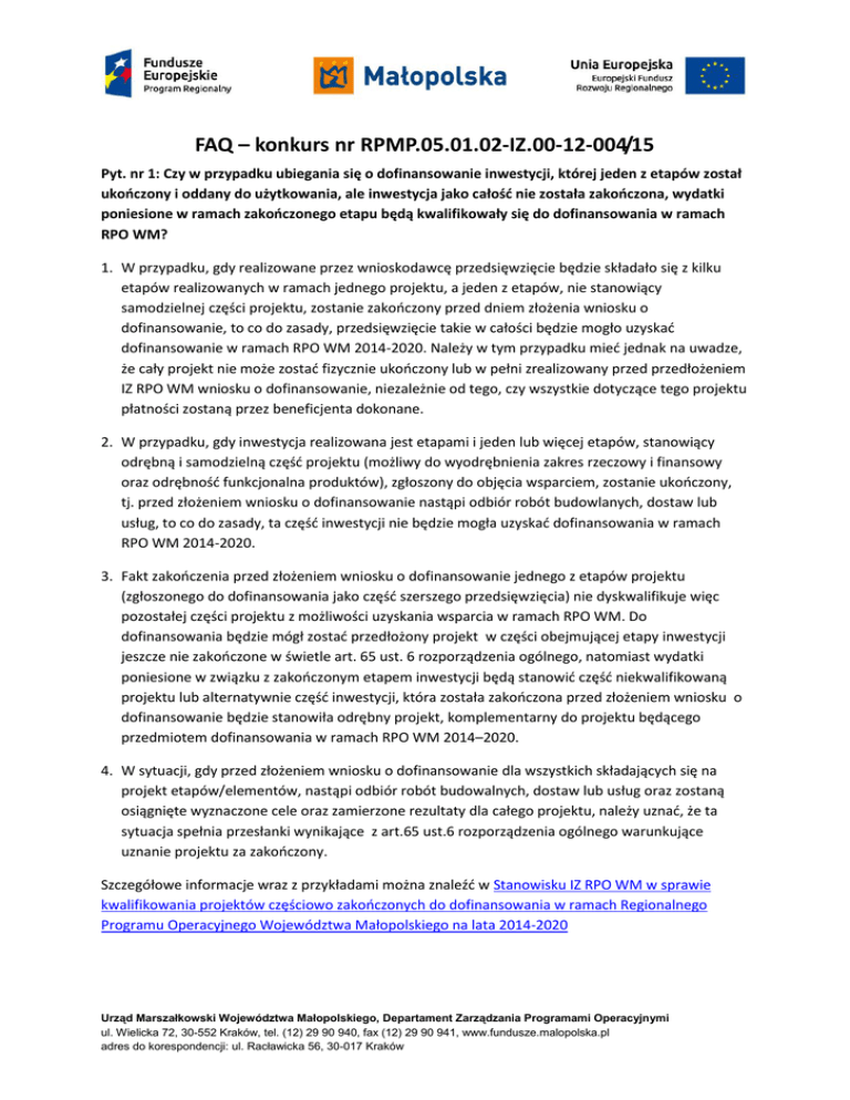 FAQ – konkurs nr RPMP.05.01.02-IZ.00-12-004/15 Pyt. nr 1: Czy w przypadku ubiegania się o dofinansowanie inwestycji, której jeden z etapów został ukończony i oddany do użytkowania, ale inwestycja jako całość nie została zakończona, wydatki poniesione w ramach zakończonego etapu będą kwalifikowały się do dofinansowania w ramach RPO WM? 1. W przypadku, gdy realizowane przez wnioskodawcę przedsięwzięcie będzie składało się z kilku etapów realizowanych w ramach jednego projektu, a jeden z etapów, nie stanowiący samodzielnej części projektu, zostanie zakończony przed dniem złożenia wniosku o dofinansowanie, to co do zasady, przedsięwzięcie takie w całości będzie mogło uzyskać dofinansowanie w ramach RPO WM 2014-2020. Należy w tym przypadku mieć jednak na uwadze, że cały projekt nie może zostać fizycznie ukończony lub w pełni zrealizowany przed przedłożeniem IZ RPO WM wniosku o dofinansowanie, niezależnie od tego, czy wszystkie dotyczące tego projektu płatności zostaną przez beneficjenta dokonane. 2. W przypadku, gdy inwestycja realizowana jest etapami i jeden lub więcej etapów, stanowiący odrębną i samodzielną część projektu (możliwy do wyodrębnienia zakres rzeczowy i finansowy oraz odrębność funkcjonalna produktów), zgłoszony do objęcia wsparciem, zostanie ukończony, tj. przed złożeniem wniosku o dofinansowanie nastąpi odbiór robót budowlanych, dostaw lub usług, to co do zasady, ta część inwestycji nie będzie mogła uzyskać dofinansowania w ramach RPO WM 2014-2020. 3. Fakt zakończenia przed złożeniem wniosku o dofinansowanie jednego z etapów projektu (zgłoszonego do dofinansowania jako część szerszego przedsięwzięcia) nie dyskwalifikuje więc pozostałej części projektu z możliwości uzyskania wsparcia w ramach RPO WM. Do dofinansowania będzie mógł zostać przedłożony projekt w części obejmującej etapy inwestycji jeszcze nie zakończone w świetle art. 65 ust. 6 rozporządzenia ogólnego, natomiast wydatki poniesione w związku z zakończonym etapem inwestycji będą stanowić część niekwalifikowaną projektu lub alternatywnie część inwestycji, która została zakończona przed złożeniem wniosku o dofinansowanie będzie stanowiła odrębny projekt, komplementarny do projektu będącego przedmiotem dofinansowania w ramach RPO WM 2014–2020. 4. W sytuacji, gdy przed złożeniem wniosku o dofinansowanie dla wszystkich składających się na projekt etapów/elementów, nastąpi odbiór robót budowalnych, dostaw lub usług oraz zostaną osiągnięte wyznaczone cele oraz zamierzone rezultaty dla całego projektu, należy uznać, że ta sytuacja spełnia przesłanki wynikające z art.65 ust.6 rozporządzenia ogólnego warunkujące uznanie projektu za zakończony. Szczegółowe informacje wraz z przykładami można znaleźć w Stanowisku IZ RPO WM w sprawie kwalifikowania projektów częściowo zakończonych do dofinansowania w ramach Regionalnego Programu Operacyjnego Województwa Małopolskiego na lata 2014-2020 Urząd Marszałkowski Województwa Małopolskiego, Departament Zarządzania Programami Operacyjnymi ul. Wielicka 72, 30-552 Kraków, tel. (12) 29 90 940, fax (12) 29 90 941, www.fundusze.malopolska.pl adres do korespondencji: ul. Racławicka 56, 30-017 Kraków Pyt. nr 2: Czy Województwo Małopolskie zamierza realizować projekt w ramach Regionalnego Programu Operacyjnego Województwa Małopolskiego na lata 2014-2020, w ramach V Osi priorytetowej Ochrona środowiska, Działanie 5.1 Adaptacja do zmian klimatu, Poddziałanie 5.1.2. Wsparcie służb ratunkowych? Tak. Województwo Małopolskie po przeprowadzeniu konkursu na Partnerów do udziału w Projekcie pn. „Bezpieczna Małopolska – samochody strażackie” zamierza ubiegać się o realizację projektu celem którego jest zakup nowych samochodów ratowniczo-gaśniczych typu średniego bez wyposażenia ratowniczo-gaśniczego wraz z systemem łączności oraz z systemem monitoringu środowiskowego dla jednostek ochotniczych straży pożarnych (OSP) z obszaru województwa małopolskiego. Więcej informacji na ten temat dostępnych jest na stronie Biuletynu Informacji Publicznej Urzędu Marszałkowskiego Województwa Małopolskiego Pyt. 3. Czy w związku z realizacją projektu przez Województwo Małopolskie „Bezpieczna Małopolska – samochody strażackie” jednostki samorządu terytorialnego będą mogły samodzielnie składać wnioski aplikacyjne do Poddziałania 5.1.2 Wsparcie służb ratunkowych RPO WM? Jednostki samorządu terytorialnego będą mogły ubiegać się o wsparcie z Poddziałania 5.1.2 Wsparcie służb ratunkowych samodzielnie lub w partnerstwie z Województwem Małopolskim. Urząd Marszałkowski Województwa Małopolskiego, Departament Zarządzania Programami Operacyjnymi ul. Wielicka 72, 30-552 Kraków, tel. (12) 29 90 940, fax (12) 29 90 941, www.fundusze.malopolska.pl adres do korespondencji: ul. Racławicka 56, 30-017 Kraków