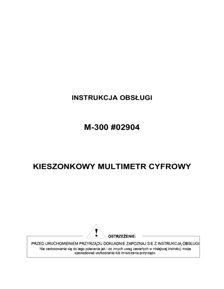 INSTRUKCJA OBSŁUGI M-300 #02904 KIESZONKOWY MULTIMETR CYFROWY ! Instrukcja obsługi - Kieszonkowy multimetr cyfrowy M-300 1. WSTĘP Instrukcja obsługi dostarcza informacji dotyczących bezpieczeństwa i sposobu użytkowania, parametrów technicznych oraz konserwacji multimetru cyfrowego M-300. • • • • • Multimetr ten może być stosowany do następujących pomiarów: napięcia stałego (DC) i przemiennego (AC); prądu stałego (DC); rezystancji; kontrola ciągłości obwodu (z sygnalizacją dźwiękową); diod półprzewodnikowych; 2. INFORMACJE DOTYCZĄCE BEZPIECZEŃSTWA UŻYTKOWANIA • • • • • Do pracy z miernikiem można przystąpić tylko z przykręconą spodnią częścią obudowy; Przed przystąpieniem do pomiarów upewnić się czy przełącznik funkcji znajduje się we właściwej pozycji; Należy zawsze zachować ostrożność przy pomiarach napięć stałych wyższych 60V i napięć przemiennych wyższych niż 30V (wartość skuteczna); Nigdy nie mierzyć rezystancji w układzie znajdującym się pod napięciem; Nigdy nie używać multimetru, gdy przyrząd lub przewody pomiarowe wyglądają na uszkodzone; niż 3. CHARAKTERYSTYKA OGÓLNA Wyświetlacz Metoda przetwarzania AC/DC Wskazanie polaryzacji Wskaźnik stanu baterii Praca w zakresie temperatur : 3 1/2 cyfry : podwójne całkowanie : symbol "-" wyświetlany automatycznie : wyświetlany symbol : 0°C ... 40°C przy wilgotności mniejszej niż 80% : szerokość : 70mm, długość : 120mm, grubość : 18mm : 110g (z baterią) : 9 - 12 V GP23A lub odpowiednik : bateria GP23A, futerał, instrukcja obsługi Wymiary Ciężar Typ baterii Wyposażenie dodatkowe 4. SPECYFIKACJE DOKŁADNOŚĆ: ± (X1 % wartości wskazanej + X2 cyfr, działek elementarnych), gwarantowana przez okres 1 roku, dla zakresu temperatur 23°C ± 5°C 10/2000 -2- Instrukcja obsługi - Kieszonkowy multimetr cyfrowy M-300 4.1. POMIAR NAPIĘCIA STAŁEGO (DC) ZAKRES ROZDZIELCZOŚĆ 2V 1mV 20V 10mV 200V 100mV 500V 1V Maksymalna wartość napięcia stałego (DC): 500V DOKŁADNOŚĆ ±(0,5% w.w. + 1d) ±(0,8% w.w. + 1d) 4.2. POMIAR NAPIĘCIA PRZEMIENNEGO (AC) ZAKRES ROZDZIELCZOŚĆ DOKŁADNOŚĆ 200V 0,1V ±(1,2% w.w. + 10d) 500V 1V Zakres częstotliwości mierzonych napięć: 45 ... 1000Hz, Maksymalna wartość napięcia zmiennego (AC): 600V (wartość skuteczna), Zmierzone napięcia wyrażone są w wartościach skutecznych przebiegu sinusoidalnego. 4.3. POMIAR PRĄDU STAŁEGO (DC) ZAKRES ROZDZIELCZOŚĆ 200mA 0,1mA Ochrona przed przeciążeniem: bezpiecznik 200mA / 250V DOKŁADNOŚĆ ±(2,0% w.w. + 2d) 4.4. POMIAR REZYSTANCJI ZAKRES ROZDZIELCZOŚĆ 2kΩ 1Ω 20kΩ 10Ω 200kΩ 100Ω 2000kΩ 1kΩ Ochrona przed przeciążeniem: 250V (wartość skuteczna) (AC). Napięcie obwodu otwartego: max. 0.65V DOKŁADNOŚĆ ±(1,0% w.w. + 2d) 4.5. TEST DIOD PÓŁPRZEWODNIKOWYCH ROZDZIELCZOŚĆ PRĄD TESTUJĄCY 1mV 0,8mA Ochrona przed przeciążeniem: 250V (wartość skuteczna) (AC). NAPIĘCIE OBWODU OTWARTEGO 3,2V 4.6. KONTROLA CIĄGŁOŚCI OBWODU ROZDZIELCZOŚĆ DZIAŁANIE Jeżeli rezystancja pomiędzy dwoma punktami obwodu jest 1Ω mniejsza niż 50Ω, będzie wówczas słyszalny brzęczek. Ochrona przed przeciążeniem: 250V (wartość skuteczna) (AC). 10/2000 -3- Instrukcja obsługi - Kieszonkowy multimetr cyfrowy M-300 5. OPIS ELEMENTÓW ZEWNĘTRZNYCH PRZYRZĄDU Poszczególne elementy odpowiadają numeracji zamieszczonej na poniższym rysunku: 1. Przełącznik zmiany zakresu pomiarowego z wyłącznikiem zasilania. 2. Przełącznik funkcji. 3. Wyświetlacz ciekłokrystaliczny 3 1/2 cyfry z maksymalną liczbą wskazań 1999 liczb. 4. Przewody pomiarowe - czerwony (dodatni) oraz czarny (ujemny). 6. WYKONANIE POMIARÓW 6.1. POMIAR NAPIĘCIA STAŁEGO (DC) 1. Przełącznik funkcji multimetru przełączyć w pozycję V ... 2. Ustawić przełącznik zmiany zakresu w pozycji odpowiadającej wielkości mierzonego napięcia. Jeśli wielkość mierzonego napięcia jest nieznana, pomiar należy rozpocząć od zakresu najwyższego, a następnie przełączać się na coraz niższy zakres w celu uzyskania najkorzystniejszego odczytu. 3. Przyłączyć przewody pomiarowe równolegle do końców, zacisków itp., między którymi mierzone jest napięcie. Odczytać wskazanie przyrządu. Dodatkowo przy pomiarze napięcia stałego wyświetlana jest biegunowość przewodu czerwonego. 4. Podczas przeprowadzania pomiarów na zakresie 500V na wyświetlaczu pojawia się symbol "HV" przypominający o styczności z wysokim napięciem, a także o zachowaniu należytej ostrożności. 6.2. POMIAR NAPIĘCIA PRZEMIENNEGO (AC) 1. Przełącznik funkcji multimetru przełączyć w pozycję V~. 2. Ustawić przełącznik zmiany zakresu w pozycji odpowiadającej wielkości mierzonego napięcia. Pomiar napięcia przemiennego można przeprowadzić na zakresach 2V i 20V lecz dokładność podana w specyfikacji nie jest gwarantowana. 3. Przyłączyć przewody pomiarowe równolegle do końców, zacisków itp., między którymi mierzone jest napięcie. Odczytać wskazanie przyrządu. 4. Podczas przeprowadzania pomiarów na zakresie 500V na wyświetlaczu pojawia się symbol "HV" przypominający o styczności z wysokim napięciem, a także o zachowaniu należytej ostrożności. 10/2000 -4- Instrukcja obsługi - Kieszonkowy multimetr cyfrowy M-300 6.3. POMIAR PRĄDU STAŁEGO (DC) 1. Przełącznik funkcji multimetru przełączyć w pozycję A. 2. Ustawić przełącznik zmiany zakresu w pozycji 200mA. Pomiar prądu stałego może być przeprowadzony przy innym położeniu tego przełącznika, lecz należy liczyć wówczas ze złym umiejscowieniem przecinka dziesiętnego. 3. Przewody pomiarowe włączyć szeregowo do obwodu, w którym mierzony jest prąd. 4. Odczytać wskazanie przyrządu wraz z informacją o biegunowości przewodu czerwonego. 6.4. POMIAR REZYSTANCJI 1. Przełącznik funkcji multimetru przełączyć w pozycję Ω. 2. Ustawić przełącznik zmiany zakresu w pozycji odpowiadającej wielkości m