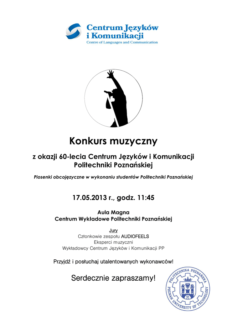 Konkurs muzyczny z okazji 60-lecia Centrum Języków i Komunikacji Politechniki Poznańskiej Piosenki obcojęzyczne w wykonaniu studentów Politechniki Poznańskiej 17.05.2013 r., godz. 11:45 Aula Magna Centrum Wykładowe Politechniki Poznańskiej Jury Członkowie zespołu AUDIOFEELS Eksperci muzyczni Wykładowcy Centrum Języków i Komunikacji PP Przyjdź i posłuchaj utalentowanych wykonawców! Serdecznie zapraszamy!