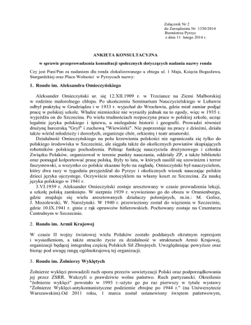 Załącznik Nr 2 do Zarządzenia Nr 1330/2014 Burmistrza Pyrzyc z dnia 11 lutego 2014 r. ANKIETA KONSULTACYJNA w sprawie przeprowadzenia konsultacji społecznych dotyczących nadania nazwy ronda Czy jest Pani/Pan za nadaniem dla ronda zlokalizowanego u zbiegu ul. 1 Maja, Księcia Bogusława, Stargardzkiej oraz Placu Wolności w Pyrzycach nazwy: 1. Rondo im. Aleksandra Omieczyńskiego Aleksander Omieczyński ur. się 12.XII.1909 r. w Trzciance na Ziemi Malborskiej w rodzinie małorolnego chłopa. Po ukończeniu Seminarium Nauczycielskiego w Lubawie odbył praktykę w Grudziądzu i w 1933 r. wyjechał do Wrocławia, gdzie miał zamiar podjąć pracę w polskiej szkole. Władze niemieckie nie wyraziły jednak na to zgody, więc w 1935 r. wyjeżdża on do Szczecina. Po wielu trudnościach rozpoczyna prace w polskiej szkole, ucząc legalnie języka polskiego i śpiewu, a nielegalnie historii i geografii. Prowadzi również drużynę harcerską "Gryf" i zuchową "Wiewiórki". Nie poprzestaje na pracy z dziećmi, działa także wśród młodzieży i dorosłych, organizuje chór, orkiestrę i teatr amatorski. Działalność Omieczyńskiego na polu krzewienia polskości nie ograniczała się tylko do polskiego środowiska w Szczecinie, ale sięgała także do okolicznych powiatów skupiających robotników polskiego pochodzenia. Pełniąc funkcję nauczyciela drużynowego i członka Związku Polaków, organizował w terenie punkty nauczania, oddziały ZP, a także biblioteki oraz pomagał kolportować prasę polską. Były to lata, w których nasilił się szowinizm i terror faszystowski, a wszystko co polskie skazane było na zagładę. Omieczyński był nauczycielem, który dwa razy w tygodniu przyjeżdżał do Pyrzyc i okolicznych wiosek nauczając polskie dzieci języka ojczystego. Oczywiście motocyklem na własny koszt ze Szczecina. Za naukę języka polskiego w 1941 r. 3.VI.1939 r. Aleksander Omieczyński zostaje aresztowany w czasie prowadzenia lekcji, a szkołę polską zamknięto. W sierpniu 1939 r. wywieziono go do obozu w Oranienburgu, gdzie znajduje się wielu aresztowanych działaczy polonijnych, m.in.: M. Golisz, J. Mozolewski, W. Narożynski. W 1940 r. przewieziony został do więzienia w Szczecinie, gdzie 10.IX.1941 r. ginie z rąk oprawców hitlerowskich. Pochowany zostaje na Cmentarzu Centralnym w Szczecinie. 2. Rondo im. Armii Krajowej W czasie II wojny światowej wielu Polaków zostało poddanych okrutnym represjom i wysiedleniom, a także straciło życie za działalność w strukturach Armii Krajowej, organizacji będącej integralną częścią Polskich Sił Zbrojnych. Uwzględniając powyższe oraz biorąc pod uwagę rangę ogólnokrajową tej organizacji. 3. Rondo im. Żołnierzy Wyklętych Żołnierze wyklęci prowadzili ruch oporu przeciw sowietyzacji Polski oraz podporządkowania jej przez ZSRR. Walczyli o prawdziwie wolne państwo. Ruch partyzancki. Określenie "żołnierze wyklęci" powstało w 1993 r.-użyto go po raz pierwszy w tytule wystawy "Żołnierze Wyklęci-antykomunistyczne podziemie zbrojne po 1944 r." (na Uniwersytecie Warszawskim).Od 2011 roku, 1 marca został ustanowiony świętem państwowym, poświęconym żołnierzom zbrojnego podziemia antykomunistycznego. Przez całe lata PRL-u nazywano ich "zaplutymi karłami reakcji", a wszystkie organizacje niepodległościowe, do których należeli określano jako "faszystowskie bandy". W latach 1945-1956, według ciągle niepewnych danych, z rąk komunistów zginęło ok. 8 tys., a 5 tys. skazano na karę śmierci. W obozach w więzieniach poniosło śmierć ok. 20 tys. żołnierzy. 4. Rondo im. Ofiar Katastrofy Smoleńskiej Nazwa ronda ma na celu upamiętnienie 96 ofiar katastrofy lotniczej pod Smoleńskiem 10 kwietnia 2010 r., którzy oddali życie w służbie ojczyzny w drodze na obchody 70 rocznicy zbrodni katyńskiej. 5. Rondo im. prof. Edwarda Rymara Edward Rymar (ur. 28 grudnia 1936 w Haczowie) – polski historyk, mediewista, specjalista w dziedzinie historii Nowej Marchii, Pomorza i genealogii dynastycznej. Studiował historię na Uniwersytecie Jagiellońskim w Krakowie. Pracę magisterską Początki i rozwój Pyrzyc napisał na Uniwersytecie Adama Mickiewicza w 1964 r. u prof. dr hab. Gerarda Labudy. Doktoryzował się w 1976 roku, habilitował w 1996 na Uniwersytecie Gdańskim, gdzie tytuł profesora nauk humanistycznych uzyskał w 2004. Od 1997 był profesorem nadzwyczajnym w instytucie Historii i Stosunków Międzynarodowych Uniwersytetu Szczecińskiego. W latach 1958-1997 był dyrektorem Powiatowej i Miejskiej Biblioteki Publicznej w Pyrzycach, gdzie utworzył regionalne muzeum. 1989-1990 był przewodniczącym Komitetu Obywatelskiego Ziemi Pyrzyckiej. 1964-1968 i 1990-1994 był radnym Rady Miejskiej w Pyrzycach. 1995-1998 był radnym Rady Powiatu Pyrzyckiego. W latach 1990-2001 był przewodniczącym Koła Unii Wolności. Od 1994 jest zastępcą redaktora naczelnego Gazety Ziemi Pyrzyckiej. Jako redaktor pisze do tego miesięcznika od 1991. Pierwsze prace drukował w roczniku Zeszyty Pyrzyckie (1967-1973). W 1977 r. obronił pracę doktorską pod kierunkiem prof. Gerarda Labudy (UAM Poznań) na temat: O rzekomym[1] księstwie sławieńsko-słupskim w XII- XIII w. Rozprawy genealogiczne i Rodowód książąt pomorskich (wyd. 1995-1996) stały się podstawą pomyślnego postępowania habilitacyjnego w 1996 r. (Uniwersytet Gdański). Był pracownikiem Instytutu Historii i Stosunków Międzynarodowych, w Zakładzie Historii Średniowiecznej Uniwersytetu Szczecińskiego. 6. Rondo im. Wincentego Witosa W dniu 21 stycznia 2014r. minęła 140 rocznica urodzin Wincentego Witosa, największego z polskich chłopów, trzykrotnego premiera rządu (1920-1921, 1923i 1926), autora najdoskonalszego po wsze czasy przesłania patriotyzmu dnia codziennego: „ A Polska winna trwać wiecznie”. Wincenty Witos stał się jednym z najwybitniejszych parlamentarzystów w naszych dziejach. Pryncypia działalności Wincen
