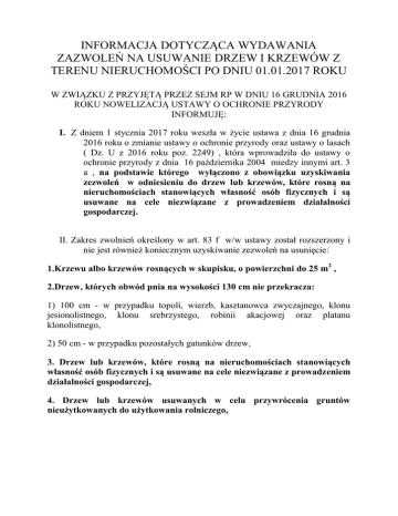 INFORMACJA DOTYCZĄCA WYDAWANIA ZAZWOLEŃ NA USUWANIE DRZEW I KRZEWÓW Z TERENU NIERUCHOMOŚCI PO DNIU 01.01.2017 ROKU W ZWIĄZKU Z PRZYJĘTĄ PRZEZ SEJM RP W DNIU 16 GRUDNIA 2016 ROKU NOWELIZACJĄ USTAWY O OCHRONIE PRZYRODY INFORMUJĘ: I. Z dniem 1 stycznia 2017 roku weszła w życie ustawa z dnia 16 grudnia 2016 roku o zmianie ustawy o ochronie przyrody oraz ustawy o lasach ( Dz. U z 2016 roku poz. 2249) , która wprowadziła do ustawy o ochronie przyrody z dnia 16 października 2004 miedzy innymi art. 3 a , na podstawie którego wyłączono z obowiązku uzyskiwania zezwoleń w odniesieniu do drzew lub krzewów, które rosną na nieruchomościach stanowiących własność osób fizycznych i są usuwane na cele niezwiązane z prowadzeniem działalności gospodarczej. II. Zakres zwolnień określony w art. 83 f w/w ustawy został rozszerzony i nie jest również koniecznym uzyskiwanie zezwoleń na usunięcie: 1.Krzewu albo krzewów rosnących w skupisku, o powierzchni do 25 m2 , 2.Drzew, których obwód pnia na wysokości 130 cm nie przekracza: 1) 100 cm - w przypadku topoli, wierzb, kasztanowca zwyczajnego, klonu jesionolistnego, klonu srebrzystego, robinii akacjowej oraz platanu klonolistnego, 2) 50 cm - w przypadku pozostałych gatunków drzew, 3. Drzew lub krzewów, które rosną na nieruchomościach stanowiących własność osób fizycznych i są usuwane na cele niezwiązane z prowadzeniem działalności gospodarczej, 4. Drzew lub krzewów usuwanych w celu przywrócenia gruntów nieużytkowanych do użytkowania rolniczego, III. Zakres zwolnień z obowiązku uiszczania opłat za usunięcie drzew i krzewów został w art. 86 zmieniony : Nie pobiera się opłat za usuwanie drzew i krzewów : 1. Usuwanych z nieruchomościach stanowiących własność osób fizycznych na cele niezwiązane z prowadzeniem działalności gospodarczej. 2. Drzew, których obwód pnia mierzony na wysokości 130 cm nie przekracza: 1) 120 cm - w przypadku topoli, wierzb, kasztanowca zwyczajnego, klonu jesionolistnego, klonu srebrzystego, robinii akacjowej oraz platanu klonolistnego, 2) 80 cm - w przypadku pozostałych gatunków drzew – w celu przywrócenia gruntów nieużytkowanych do użytkowania innego niż rolnicze, zgodnego z przeznaczeniem terenu, określonym w miejscowym planie zagospodarowania przestrzennego lub decyzji o warunkach zabudowy i zagospodarowania terenu. 3. Krzewu lub krzewów rosnących w skupiskach, pokrywających grunt o powierzchni do 50 m2, w celu przywrócenia gruntów nieużytkowanych do użytkowania innego niż rolnicze, zgodnego z przeznaczeniem terenu, określonym w miejscowym planie zagospodarowania przestrzennego lub decyzji o warunkach zabudowy i zagospodarowania terenu.