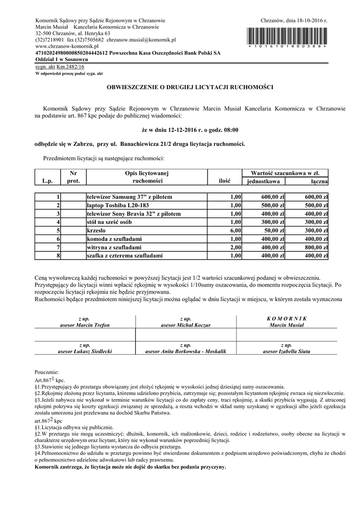 Komornik Sądowy przy Sądzie Rejonowym w Chrzanowie Marcin Musiał Kancelaria Komornicza w Chrzanowie 32-500 Chrzanów, al. Henryka 63 (32)7218901 fax (32)7505682 [email protected] www.chrzanow-komornik.pl 47102024980000850204442612 Powszechna Kasa Oszczędności Bank Polski SA Oddział 1 w Sosnowcu sygn. akt Km 2482/16 Chrzanów, dnia 18-10-2016 r. *1016101800388* W odpowiedzi proszę podać sygn. akt OBWIESZCZENIE O DRUGIEJ LICYTACJI RUCHOMOŚCI Komornik Sądowy przy Sądzie Rejonowym w Chrzanowie Marcin Musiał Kancelaria Komornicza w Chrzanowie na podstawie art. 867 kpc podaje do publicznej wiadomości: że w dniu 12-12-2016 r. o godz. 08:00 odbędzie się w Zabrzu, przy ul. Banachiewicza 21/2 druga licytacja ruchomości. Przedmiotem licytacji są następujące ruchomości: Nr prot. L.p. 1 2 3 4 5 6 7 8 Opis licytowanej ruchomości Wartość szacunkowa w zł. jednostkowa łączna ilość telewizor Samsung 37" z pilotem laptop Toshiba L20-183 telewizor Sony Bravia 32" z pilotem stół na sześć osób krzesło komoda z szufladami witryna z szufladami szafka z czterema szufladami 1,00 1,00 1,00 1,00 6,00 1,00 2,00 1,00 600,00 zł 500,00 zł 400,00 zł 300,00 zł 50,00 zł 400,00 zł 400,00 zł 400,00 zł 600,00 zł 500,00 zł 400,00 zł 300,00 zł 300,00 zł 400,00 zł 800,00 zł 400,00 zł Ceną wywoławczą każdej ruchomości w powyższej licytacji jest 1/2 wartości szacunkowej podanej w obwieszczeniu. Przystępujący do licytacji winni wpłacić rękojmię w wysokości 1/10sumy oszacowania, do momentu rozpoczęcia licytacji. Po rozpoczęciu licytacji rękojmia nie będzie przyjmowana. Ruchomości będące przedmiotem niniejszej licytacji można oglądać w dniu licytacji w miejscu, w którym została wyznaczona z up. asesor Marcin Trefon z up. asesor Michał Koczur KOMORNIK Marcin Musiał z up. asesor Łukasz Siedlecki z up. asesor Anita Borkowska - Moskalik z up. asesor Izabella Siuta Pouczenie: Art.8671 kpc. §1.Przystępujący do przetargu obowiązany jest złożyć rękojmię w wysokości jednej dziesiątej sumy oszacowania. §2.Rękojmię złożoną przez licytanta, któremu udzielono przybicia, zatrzymuje się; pozostałym licytantom rękojmię zwraca się niezwłocznie. §3.Jeżeli nabywca nie wykonał w terminie warunków licytacji co do zapłaty ceny, traci rękojmię, a skutki przybicia wygasają. Z utraconej rękojmi pokrywa się koszty egzekucji związanej ze sprzedażą, a reszta wchodzi w skład sumy uzyskanej w egzekucji albo jeżeli egzekucja została umorzona jest przelewana na dochód Skarbu Państwa. art.8672 kpc §1.Licytacja odbywa się publicznie. §2.W przetargu nie mogą uczestniczyć: dłużnik, komornik, ich małżonkowie, dzieci, rodzice i rodzeństwo, osoby obecne na licytacji w charakterze urzędowym oraz licytant, który nie wykonał warunków poprzedniej licytacji. §3.Stawienie się jednego licytanta wystarcza do odbycia przetargu. §4.Pełnomocnictwo do udziału w przetargu powinno być stwierdzone dokumentem z podpisem urzędowo poświadczonym, chyba że chodzi o pełnomocnictwo udzielone adwokatowi lub radcy prawnemu. Komornik zastrzega, że licytacja może nie dojść do skutku bez podania przyczyny.