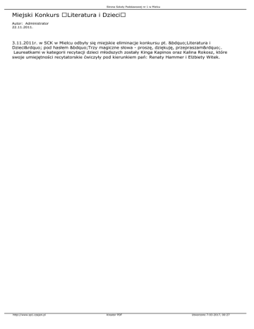 Strona Szkoły Podstawowej nr 1 w Mielcu Miejski Konkurs Literatura i Dzieci Autor: Administrator 22.11.2011. 3.11.2011r. w SCK w Mielcu odbyły się miejskie eliminacje konkursu pt. „Literatura i Dzieci” pod hasłem „Trzy magiczne słowa - proszę, dziękuję, przepraszam”. Laureatkami w kategorii recytacji dzieci młodszych zostały Kinga Kapinos oraz Kalina Rokosz, które swoje umiejętności recytatorskie ćwiczyły pod kierunkiem pań: Renaty Hammer i Elżbiety Witek. http://www.sp1.czajen.pl Kreator PDF Utworzono 7-03-2017, 00:27