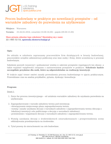 Proces budowlany w praktyce po nowelizacji przepisów – od warunków zabudowy do pozwolenia na użytkowanie Miejsce: Warszawa Termin: 25-26.02.2016, czwartek (10.00-16.00) - piątek (09.00-15.00) Masz pytania odnośne tego szkolenia? Skontaktuj się z nami: 22 / 845 52 53, [email protected] Opis: Do udziału w szkoleniu zapraszamy pracowników firm działających w branży budowlanej, pracowników urzędów administracji publicznej oraz inne osoby i firmy, które uczestniczą w procesie budowlanym. Szkolenie pozwoli rozszerzyć i podsumować wiedzę w zakresie przepisów regulujących ten obszar, a także wyjaśnić wątpliwości związane z zastosowaniem przepisów w praktyce. Szkolenie będzie szczególnie przydatne dla osób, które są odpowiedzialne za realizację inwestycji. W trakcie zajęć trener omówi zasady prowadzenia procesu budowlanego w ujęciu praktycznym. Przewidziano czas na analizę przykładów, pytania, dyskusję i konsultacje. Program: Dzień I: 1. Zarys faz procesu inwestycyjnego – od ustalenia warunków zabudowy do uzyskania pozwolenia na użytkowanie. 2. Zagospodarowanie i warunki zabudowy terenu pod inwestycję: obowiązywanie miejscowego planu zagospodarowania terenu, wymóg i zasady uzyskania decyzji o warunkach zabudowy i zagospodarowaniu terenu (decyzja o lokalizacji inwestycji celu publicznego a decyzja o warunkach zabudowy), przeniesienie / wygaśnięcie decyzji o warunkach zabudowy i zagospodarowaniu terenu. ❍ ❍ ❍ 3. Wymóg uzyskania decyzji o środowiskowych uwarunkowaniach i przeprowadzenia oceny oddziaływania przedsięwzięcia na środowisko. 4. Tytuł prawny do nieruchomości na cele budowlane. J.G.Training, ul. Olesińska 21, 02-548 Warszawa, tel. / fax: 22 / 845 52 53, www.jgt.pl NIP: 898-150-56-07, REGON: 932958345, BRE BANK S.A - mBank: 38 1140 2004 0000 3002 3360 7883 5. Uzgodnienia i zgody wymagane przed uzyskaniem pozwolenia na budowę. 6. Postępowanie poprzedzające rozpoczęcie robót budowlanych: zgłoszenie robót budowlanych a obowiązek uzyskania pozwolenia na budowę, procedura zatwierdzenia projektu budowlanego i postępowanie w sprawie wydania decyzji o pozwoleniu na budowę, odwołanie od decyzji administracyjnych, wpływ zaskarżenia decyzji o pozwoleniu na budowę na możliwość realizacji inwestycji. ❍ ❍ ❍ 7. Formy prowadzenia inwestycji: zastępstwo inwestycyjne, inwestycje w systemie „wybuduj” i w systemie „zaprojektuj i wybuduj”, generalne wykonawstwo a wykonawstwo częściowe. ❍ ❍ ❍ 8. Wybór wykonawcy. Zastosowanie warunków kontraktowych FIDIC. Założenia czasowe przy realizacji inwestycji. 9. Podział obowiązków między uczestników procesu budowlanego (inwestor, projektant, inspektor nadzoru inwestorskiego, kierownik budowy / kierownik robót). Odpowiedzialność za teren budowy. 10. Dokumentacja budowy, w tym dziennik budowy. 11. Odstąpienie od zatwierdzonego projektu budowlanego: istotne a nieistotne odstąpienie od zatwierdzonego projektu budowlanego lub warunków pozwolenia na budowę; orzecznictwo i aktualna praktyka organów administracyjnych, rola i odpowiedzialność projektanta w dokonywaniu kwalifikacji odstąpienia, obowiązek uzyskania decyzji o zmianie pozwolenia na budowę i związane z tym postępowanie administracyjne. ❍ ❍ ❍ Dzień II: 1. Najważniejsze kwestie prawne dot. umów o roboty budowlane: sposoby określania wynagrodzenia oraz warunków jego płatności (wynagrodzenie ryczałtowe a kosztorysowe), solidarna odpowiedzialność inwestora i wykonawcy za wynagrodzenie podwykonawcy; przepisy bezwzględnie obowiązujące, procedura odbiorów w umowie o roboty budowlane; terminy w umowie i konsekwencje ich niedochowania. ❍ ❍ ❍ 2. Najważniejsze kwestie prawne dot. umów o prace projektowe: prawa autorskie do projektu budowlanego, uregulowanie nadzoru autorskiego, odpowiedzialność projektanta za wady projektu. ❍ ❍ ❍ 3. Przystąpienie do użytkowania obiektu budowlanego: wymogi formalne i obowiązki uczestników postępowania przy oddawaniu obiektu do użytkowania, ❍ J.G.Training, ul. Olesińska 21, 02-548 Warszawa, tel. / fax: 22 / 845 52 53, www.jgt.pl NIP: 898-150-56-07, REGON: 932958345, BRE BANK S.A - mBank: 38 1140 2004 0000 3002 3360 7883 ❍ ❍ zawiadomienie o zakończeniu budowy a decyzja o pozwoleniu na użytkowanie, obowiązkowa kontrola obiektu budowlanego. 4. Samowola budowlana i możliwość jej legalizacji. 5. Planowane zmiany w obowiązujących przepisach dotyczących procesu budowlanego. 6. Podsumowanie, pytania i dyskusja. Wykładowca: Radca prawny posiadający bogate doświadczenie w obsłudze prawnej inwestycyjnego procesu budowlanego. Członek Okręgowej Izby Radców Prawnych w Warszawie. Prowadzi kancelarię prawną specjalizującą się w obsłudze prawnej inwestycji budowlanych. Posiada doświadczenie w przygotowywaniu i negocjowaniu umów o roboty budowlane i prace projektowe, w tym umów zawieranych w ramach zamówień publicznych oraz umów opartych na Warunkach Kontraktowych FIDIC. Doradza Klientom - zamawiającym, wykonawcom, podwykonawcom i projektantom - jak skutecznie zabezpieczyć swoje interesy i zminimalizować ryzyko prawne wynikające z prowadzonej inwestycji. Wspiera inwestorów w postępowaniach administracyjnych związanych z ustaleniem warunków zabudowy i zagospodarowania terenu, uzyskaniem pozwolenia na budowę lub dokonaniem zgłoszenia robót budowlanych, jak również przystąpieniem do użytkowania wybudowanego obiektu. Reprezentuje uczestników procesu budowlanego w sporach sądowych i pozasądowych. Prowadzi wykłady i szkolenia dotyczące prawa budowlanego i umów zawieranych w procesie budowlanym, planowania i zagospodarowania przestrzennego oraz przepisów regulujących gospodarkę nieruchomościami. Jest autorką licznych publikacji o tematyce prawnej z zakresu swojej specjalizacji. Biegle posługuje się językiem angielskim. Miejsce: Miejsce szkolenia zlokalizowane w centrum Warszawy, czas doja