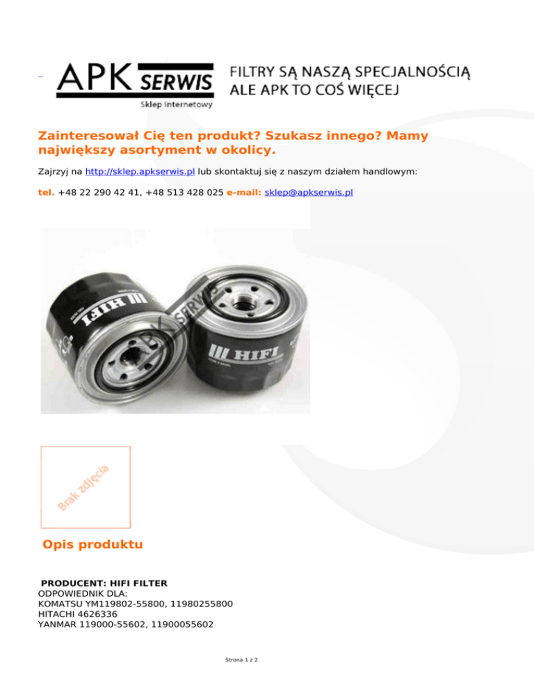 Zainteresował Cię ten produkt? Szukasz innego? Mamy największy asortyment w okolicy. Zajrzyj na http://sklep.apkserwis.pl lub skontaktuj się z naszym działem handlowym: tel. +48 22 290 42 41, +48 513 428 025 e-mail: [email protected] Opis produktu PRODUCENT: HIFI FILTER ODPOWIEDNIK DLA: KOMATSU YM119802-55800, 11980255800 HITACHI 4626336 YANMAR 119000-55602, 11900055602 Strona 1 z 2 YANMAR 119802-55800, 11980255800 Strona 2 z 2