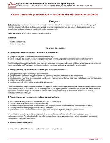 Optima Centrum Rozwoju i Kształcenia Kadr, Spółka cywilna 80-227 Gdańsk, ul. Do Studzienki 26, tel. 58 552 40 20, fax 58 727 99 33, NIP: 957-107-30-89 Ocena okresowa pracowników – szkolenie dla kierowników zespołów Program Cel szkolenia: rozwinięcie kluczowych umiejętności menedżerskich w zakresie przeprowadzania efektywnych rozmów okresowych, które podnoszą motywację wewnętrzną podwładnych do pracy i dalszego rozwoju oraz umożliwiają szybsze osiąganie wspólnych celów zawodowych. Czas trwania: 1 dzień (około 8 godz. dydaktycznych). Adresaci: Kadra kierownicza. Liderzy zespołów. PROGRAM SZKOLENIA 1. Rola przeprowadzenia oceny okresowej pracowników: a. jaką funkcję pełni ocena okresowa w uczelni wyższej? b. jakie korzyści dla uczelni, kierownika i podwładnego wynikają z przeprowadzania rozmów okresowych? Dzięki modułowi uczestnicy określą jakie korzyści wiążą się z przeprowadzaniem efektywnych rozmów oceniających pracę podwładnych. Przyjrzymy się również roli jaką rozmowa podsumowująca pełni w organizacji. 2. Przygotowanie się do rozmowy oceniającej pracę podwładnych: a. b. c. d. e. przygotowanie się do rozmowy z pracownikiem, jak pracownik powinien przygotować się do rozmowy - kryteria pomocnicze dla pracownika, dostosowanie rozmowy oceniającej do każdego z 4 typów pracowników w oparciu o metodologię Junga-Marstona, efekt rogów i efekt aureoli, analiza najczęściej popełnianych błędów w ocenianiu. Dzięki modułowi uczestnicy dowiedzą się w jaki sposób profesjonalnie przygotować się do przeprowadzenia rozmów podsumowujących. W szczególności uczestnicy nauczą się w jaki sposób dostosować się do potrzeb 4 kluczowych typów pracowników, dzięki czemu rozmowy będą wzmacniały motywację podwładnych do dalszego rozwoju i realizacji celów zawodowych. 3. Przeprowadzenie rozmowy oceniającej z pracownikiem: a. b. c. d. e. kluczowe etapy rozmowy podsumowującej pracę podwładnego, zarządzanie przebiegiem rozmowy oceniającej, motywujące poinformowanie pracownika o celu rozmowy i stworzenie atmosfery wzajemnego zaufania, zasady udzielania motywujących informacji zwrotnych, praktyczne przećwiczenie rozmów oceniających z każdym z 4 głównych typów pracowników. W module tym uczestnicy praktycznie przećwiczą prowadzenie profesjonalnych i motywujących rozmów podsumowujących. Ponadto dowiedzą się jaka jest struktura rozmowy oceniającej i w jaki sposób komunikować podwładnym kluczowe informacje. 4. Podsumowanie szkolenia: a. Indywidualny Plan Działania na podstawie zrealizowanych treści, strona 1 / 2 Powered by TCPDF (www.tcpdf.org) Optima Centrum Rozwoju i Kształcenia Kadr, Spółka cywilna 80-227 Gdańsk, ul. Do Studzienki 26, tel. 58 552 40 20, fax 58 727 99 33, NIP: 957-107-30-89 b. dekalog efektywnego przeprowadzenia rozmowy oceniającej. Moduł ten pozwoli uczestnikom na uporządkowanie nowo zdobytej wiedzy i umiejętności menedżerskich oraz wzmocni wewnętrzną motywację do wprowadzenia nowych umiejętności w życie zawodowe. Metody pracy: ćwiczenia indywidualne, ćwiczenia grupowe, dyskusje moderowane, mini-wykłady, symulacje, burza mózgów, analizy doświadczenia, gry szkoleniowe. Prowadzący Zajęcia prowadzi psycholog, certyfikowany coach ICC i trener specjalizujący się w szkoleniach menedżerskich i interpersonalnych. Posiada kilkunastoletnie doświadczenie w prowadzeniu szkoleń dla uczelni wyższych m.in. Politechniki Warszawskiej, Akademii Górniczo-Hutniczej, Uniwersytetu Jagiellońskiego, Uniwersytetu Medycznego w Łodzi, Politechniki Łódzkiej, Akademii Leona Koźmińskiego oraz Warszawskiego Uniwersytetu Medycznego. Doświadczenie biznesowe zdobywała pracując w Departamentach Zarządzania Zasobami Ludzkimi w Banku BPH S.A. i Nordea Bank Polska S.A. Specjalizuje się w szkoleniach z zakresu zarządzania zespołem i zmianą, zarządzania czasem, asertywności, wystąpień publicznych oraz profesjonalnej obsługi klienta. Termin i miejsce Lokalizacja w siedzibie Państwa uczelni Termin szkolenie zamknięte Godziny 09:00:00 - 15:30:00 Cena za osobę 565.00 PLN netto, 694.95 PLN brutto Cena zawiera Szkolenie może być zorganizowane na terenie Państwa uczelni lub ośrodka dydaktycznego, wyłącznie dla pracowników Waszej uczelni (jednostki). Cena i termin będzie ustalany indywidualnie. Zeskanuj kod smartfonem, dzięki temu będziesz mógł oznaczyć miejsce szkolenia na mapie oraz dodać wydarzenie do kalendarza. (Na telefony z systemem Android polecamy program QR Droid Private) strona 2 / 2