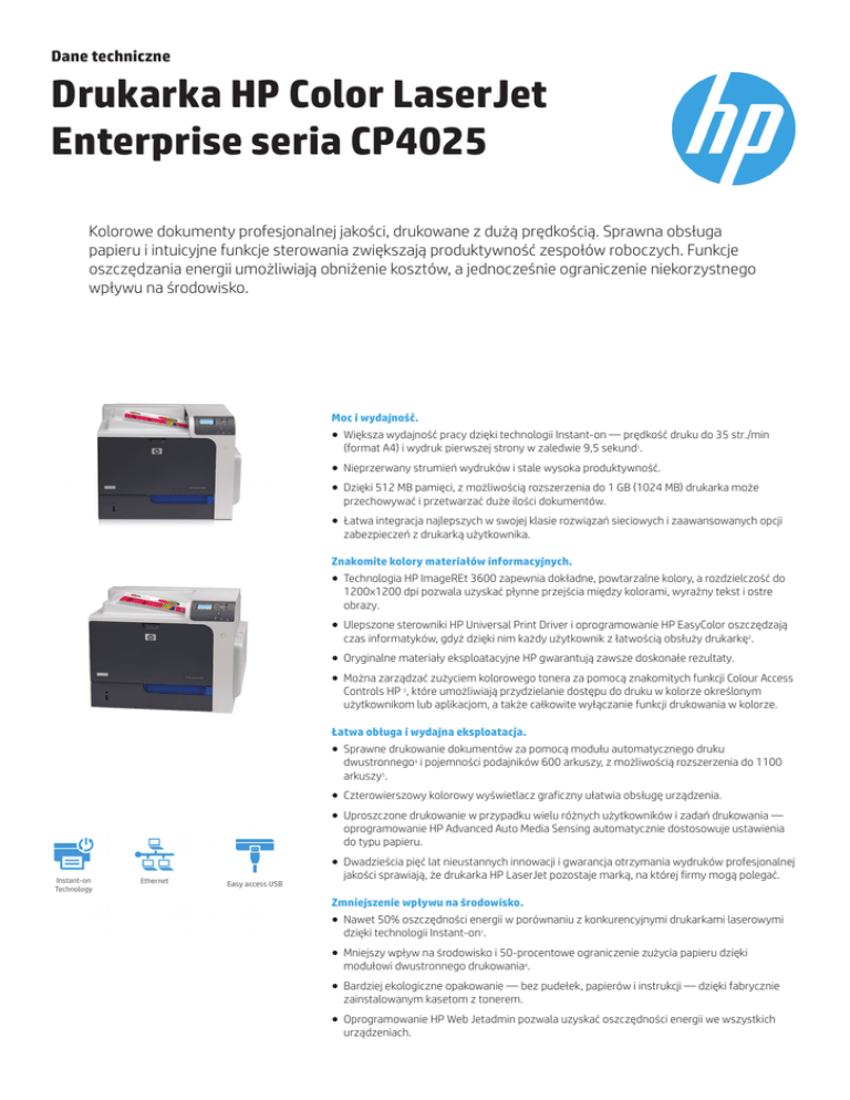 Dane techniczne Drukarka HP Color LaserJet Enterprise seria CP4025 Kolorowe dokumenty profesjonalnej jakości, drukowane z dużą prędkością. Sprawna obsługa papieru i intuicyjne funkcje sterowania zwiększają produktywność zespołów roboczych. Funkcje oszczędzania energii umożliwiają obniżenie kosztów, a jednocześnie ograniczenie niekorzystnego wpływu na środowisko. Moc i wydajność. ● Większa wydajność pracy dzięki technologii Instant-on — prędkość druku do 35 str./min (format A4) i wydruk pierwszej strony w zaledwie 9,5 sekund1. ● Nieprzerwany strumień wydruków i stale wysoka produktywność. ● Dzięki 512 MB pamięci, z możliwością rozszerzenia do 1 GB (1024 MB) drukarka może przechowywać i przetwarzać duże ilości dokumentów. ● Łatwa integracja najlepszych w swojej klasie rozwiązań sieciowych i zaawansowanych opcji zabezpieczeń z drukarką użytkownika. Znakomite kolory materiałów informacyjnych. ● Technologia HP ImageREt 3600 zapewnia dokładne, powtarzalne kolory, a rozdzielczość do 1200x1200 dpi pozwala uzyskać płynne przejścia między kolorami, wyraźny tekst i ostre obrazy. ● Ulepszone sterowniki HP Universal Print Driver i oprogramowanie HP EasyColor oszczędzają czas informatyków, gdyż dzięki nim każdy użytkownik z łatwością obsłuży drukarkę2. ● Oryginalne materiały eksploatacyjne HP gwarantują zawsze doskonałe rezultaty. ● Można zarządzać zużyciem kolorowego tonera za pomocą znakomitych funkcji Colour Access Controls HP 3, które umożliwiają przydzielanie dostępu do druku w kolorze określonym użytkownikom lub aplikacjom, a także całkowite wyłączanie funkcji drukowania w kolorze. Łatwa obługa i wydajna eksploatacja. ● Sprawne drukowanie dokumentów za pomocą modułu automatycznego druku dwustronnego4 i pojemności podajników 600 arkuszy, z możliwością rozszerzenia do 1100 arkuszy5. ● Czterowierszowy kolorowy wyświetlacz graficzny ułatwia obsługę urządzenia. ● Uproszczone drukowanie w przypadku wielu różnych użytkowników i zadań drukowania — oprogramowanie HP Advanced Auto Media Sensing automatycznie dostosowuje ustawienia do typu papieru. ● Dwadzieścia pięć lat nieustannych innowacji i gwarancja otrzymania wydruków profesjonalnej jakości sprawiają, że drukarka HP LaserJet pozostaje marką, na której firmy mogą polegać. Zmniejszenie wpływu na środowisko. ● Nawet 50% oszczędności energii w porównaniu z konkurencyjnymi drukarkami laserowymi dzięki technologii Instant-on1. ● Mniejszy wpływ na środowisko i 50-procentowe ograniczenie zużycia papieru dzięki modułowi dwustronnego drukowania4. ● Bardziej ekologiczne opakowanie — bez pudełek, papierów i instrukcji — dzięki fabrycznie zainstalowanym kasetom z tonerem. ● Oprogramowanie HP Web Jetadmin pozwala uzyskać oszczędności energii we wszystkich urządzeniach. Przegląd produktu Drukarka HP Color LaserJet Enterprise CP4025dn: 1. Panel sterowania z czterowierszowym kolorowym wyświetlaczem; 2. Odbiornik na 500 arkuszy; 3. Przednia pokrywa zapewnia wygodny dostęp do czterech wkładów drukujących HP; 4. Wbudowany moduł automatycznego druku dwustronnego (tylko CP4025dn); 5. Podajnik 2 na 500 arkuszy; 6. Uniwersalny podajnik na 100 arkuszy obsługuje niestandardowe nośniki o dużej gramaturze do 220 g/m2; 7. 1 port Hi-Speed USB 2.0; 8. Wbudowany serwer druku HP Jetdirect do sieci Gigabit Ethernet; 9. 512 MB łącznej pamięci oraz procesor 800 MHz umożliwiają szybkie wykonanie złożonych zadań drukowania; 10. Jedno wolne gniazdo EIO; 11. Gniazdo zabezpieczeń Krótka charakterystyka Model Drukarka HP Color LaserJet Enterprise CP4025n Drukarka HP Color LaserJet Enterprise CP4025dn oznaczenie produktu CC489A CC490A Podajnik uniwersalny nr 1 na 100 arkuszy Tak Tak Podajnik 2 na 500 arkuszy Tak Tak Podajnik papieru na 500 arkuszy z szafką Opcjonalne Opcjonalne Podajnik pocztówek Opcjonalne Opcjonalne Drukowanie dwustronne Ręczny Automat Wbudowany serwer druku HP Jetdirect do sieci Gigabit Ethernet Tak Tak Pamięć 512 MB, z możliwością rozszerzenia do 1 GB (1024 MB) 512 MB, z możliwością rozszerzenia do 1 GB (1024 MB) Certyfikat ENERGY STAR® Brak Tak Akcesoria, materiały eksploatacyjne i biurowe Materiały eksploatacyjne CE260A HP 647A oryginalny wkład z czarnym tonerem LaserJet 8500 stron CE261A HP 648A oryginalny wkład z błękitnym tonerem LaserJet 11 000 stron CE262A HP 648A oryginalny wkład z żółtym tonerem LaserJet 11 000 stron CE263A HP 648A oryginalny wkład z purpurowym tonerem LaserJet 11 000 stron CE265A HP 648A moduł pojemników na zużyty toner 36 000 stron CE246A HP CE246A nagrzewnica Color LaserJet 110 V 150000 str. CE247A HP CE247A nagrzewnica Color LaserJet 220 V 150000 str. CE249A HP CE249A zestaw do przenoszenia obrazu Color LaserJet 150000 str. akcesoria CC422A Podajnik papieru na 500 arkuszy do drukarki HP Color Laserjet z szafką CC425A Podajnik papieru na 500 arkuszy dla drukarek HP Color Laserjet CC497A Podajnik papieru pocztówkowego do drukarek HP LaserJet CE467A Pamięć HP DDR2 512 MB (200-pinowy moduł x32 DIMM) J8019A Dysk twardy HP Secure High-Performance EIO J7972G Karta interfejsu równoległego HP 1284B Sieci i łączność J7934G Serwer druku HP Jetdirect 620n Fast Ethernet J7961G Serwer druku HP Jetdirect 635n IPv6/IPsec J8007G Bezprzewodowy serwer druku HP Jetdirect 690n IPv6/IPsec 802.11g J8021A Bezprzewodowy serwer druku 802.11 b/g HP Jetdirect ew2500 serwis i wsparcie UL415E Pomoc techniczna HP przez 3 lata z serwisem w następnym dniu roboczym u klienta i zachowaniem wadliwych nośników dla kolorowej drukarki LaserJet CP4005/4025 UT982E Pomoc techniczna HP przez 4 lata z serwisem w następnym dniu roboczym u klienta i zachowaniem wadliwych nośników dla kolorowej drukarki LaserJet CP4005/4025 UU863E Pomoc techniczna HP przez 5 lat z serwisem w następnym dniu roboczym u klienta i zachowaniem wadliwych nośników dla 