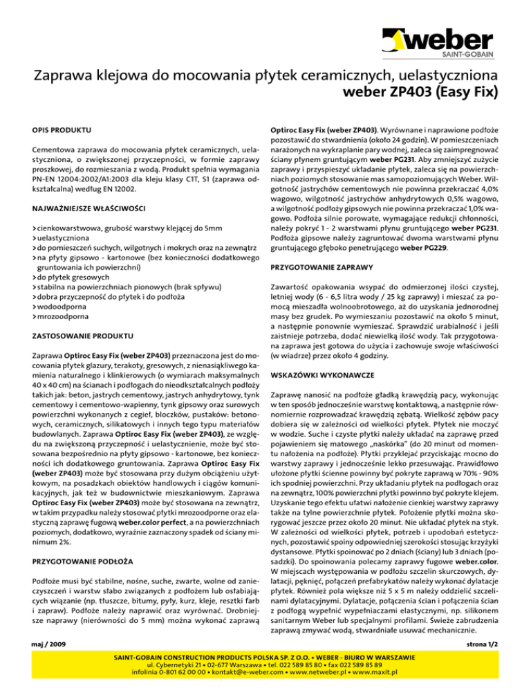 Zaprawa klejowa do mocowania płytek ceramicznych, uelastyczniona weber ZP403 (Easy Fix) OPIS PRODUKTU Cementowa zaprawa do mocowania płytek ceramicznych, uelastyczniona, o zwiększonej przyczepności, w formie zaprawy proszkowej, do rozmieszania z wodą. Produkt spełnia wymagania PN-EN 12004:2002/A1:2003 dla kleju klasy C1T, S1 (zaprawa odkształcalna) według EN 12002. NAJWAŻNIEJSZE WŁAŚCIWOŚCI >cienkowarstwowa, > grubość warstwy klejącej do 5mm >uelastyczniona > >do > pomieszczeń suchych, wilgotnych i mokrych oraz na zewnątrz >na > płyty gipsowo - kartonowe (bez konieczności dodatkowego gruntowania ich powierzchni) >do > płytek gresowych >stabilna > na powierzchniach pionowych (brak spływu) >dobra > przyczepność do płytek i do podłoża >wodoodporna > >mrozoodporna > ZASTOSOWANIE PRODUKTU Zaprawa Optiroc Easy Fix (weber ZP403) przeznaczona jest do mocowania płytek glazury, terakoty, gresowych, z nienasiąkliwego kamienia naturalnego i klinkierowych (o wymiarach maksymalnych 40 x 40 cm) na ścianach i podłogach do nieodkształcalnych podłoży takich jak: beton, jastrych cementowy, jastrych anhydrytowy, tynk cementowy i cementowo-wapienny, tynk gipsowy oraz surowych powierzchni wykonanych z cegieł, bloczków, pustaków: betonowych, ceramicznych, silikatowych i innych tego typu materiałów budowlanych. Zaprawa Optiroc Easy Fix (weber ZP403), ze względu na zwiększoną przyczepność i uelastycznienie, może być stosowana bezpośrednio na płyty gipsowo - kartonowe, bez konieczności ich dodatkowego gruntowania. Zaprawa Optiroc Easy Fix (weber ZP403) może być stosowana przy dużym obciążeniu użytkowym, na posadzkach obiektów handlowych i ciągów komunikacyjnych, jak też w budownictwie mieszkaniowym. Zaprawa Optiroc Easy Fix (weber ZP403) może być stosowana na zewnątrz, w takim przypadku należy stosować płytki mrozoodporne oraz elastyczną zaprawę fugową weber.color perfect, a na powierzchniach poziomych, dodatkowo, wyraźnie zaznaczony spadek od ściany minimum 2%. PRZYGOTOWANIE PODŁOŻA Podłoże musi być stabilne, nośne, suche, zwarte, wolne od zanieczyszczeń i warstw słabo związanych z podłożem lub osłabiających wiązanie (np. tłuszcze, bitumy, pyły, kurz, kleje, resztki farb i zapraw). Podłoże należy naprawić oraz wyrównać. Drobniejsze naprawy (nierówności do 5 mm) można wykonać zaprawą Optiroc Easy Fix (weber ZP403). Wyrównane i naprawione podłoże pozostawić do stwardnienia (około 24 godzin). W pomieszczeniach narażonych na wykraplanie pary wodnej, zaleca się zaimpregnować ściany płynem gruntującym weber PG231. Aby zmniejszyć zużycie zaprawy i przyspieszyć układanie płytek, zaleca się na powierzchniach poziomych stosowanie mas samopoziomujących Weber. Wilgotność jastrychów cementowych nie powinna przekraczać 4,0% wagowo, wilgotność jastrychów anhydrytowych 0,5% wagowo, a wilgotność podłoży gipsowych nie powinna przekraczać 1,0% wagowo. Podłoża silnie porowate, wymagające redukcji chłonności, należy pokryć 1 - 2 warstwami płynu gruntującego weber PG231. Podłoża gipsowe należy zagruntować dwoma warstwami płynu gruntującego głęboko penetrującego weber PG229. PRZYGOTOWANIE ZAPRAWY Zawartość opakowania wsypać do odmierzonej ilości czystej, letniej wody (6 - 6,5 litra wody / 25 kg zaprawy) i mieszać za pomocą mieszadła wolnoobrotowego, aż do uzyskania jednorodnej masy bez grudek. Po wymieszaniu pozostawić na około 5 minut, a następnie ponownie wymieszać. Sprawdzić urabialność i jeśli zaistnieje potrzeba, dodać niewielką ilość wody. Tak przygotowana zaprawa jest gotowa do użycia i zachowuje swoje właściwości (w wiadrze) przez około 4 godziny. WSKAZÓWKI WYKONAWCZE Zaprawę nanosić na podłoże gładką krawędzią pacy, wykonując w ten sposób jednocześnie warstwę kontaktową, a następnie równomiernie rozprowadzać krawędzią zębatą. Wielkość zębów pacy dobiera się w zależności od wielkości płytek. Płytek nie moczyć w wodzie. Suche i czyste płytki należy układać na zaprawę przed pojawieniem się matowego „naskórka” (do 20 minut od momentu nałożenia na podłoże). Płytki przyklejać przyciskając mocno do warstwy zaprawy i jednocześnie lekko przesuwając. Prawidłowo ułożone płytki ścienne powinny być pokryte zaprawą w 70% - 90% ich spodniej powierzchni. Przy układaniu płytek na podłogach oraz na zewnątrz, 100% powierzchni płytki powinno być pokryte klejem. Uzyskanie tego efektu ułatwi nałożenie cienkiej warstwy zaprawy także na tylne powierzchnie płytek. Położenie płytki można skorygować jeszcze przez około 20 minut. Nie układać płytek na styk. W zależności od wielkości płytek, potrzeb i upodobań estetycznych, pozostawić spoiny odpowiedniej szerokości stosując krzyżyki dystansowe. Płytki spoinować po 2 dniach (ściany) lub 3 dniach (posadzki). Do spoinowania polecamy zaprawy fugowe weber.color. W miejscach występowania w podłożu szczelin skurczowych, dylatacji, pęknięć, połączeń prefabrykatów należy wykonać dylatacje płytek. Również pola większe niż 5 x 5 m należy oddzielić szczelinami dylatacyjnymi. Dylatacje, połączenia ścian i połączenia ścian z podłogą wypełnić wypełniaczami elastycznymi, np. silikonem sanitarnym Weber lub specjalnymi profilami. Świeże zabrudzenia zaprawą zmywać wodą, stwardniałe usuwać mechanicznie. maj / 2009 strona 1/2 Saint-Gobain Construction Products Polska Sp. z o.o. • Weber - Biuro w Warszawie ul. Cybernetyki 21 • 02-677 Warszawa • tel. 022 589 85 80 • fax 022 589 85 89 infolinia 0-801 62 00 00 • [email protected] • www.netweber.pl • www.maxit.pl Zaprawa klejowa do mocowania płytek ceramicznych, uelastyczniona weber ZP403 (Easy Fix) WARUNKI PODCZAS STOSOWANIA I WIĄZANIA WYROBU ŚRODKI BEZPIECZEŃSTWA Temperatura otoczenia i podłoża w trakcie wykonywania prac i przez następne 24 godziny powinna wynosić 