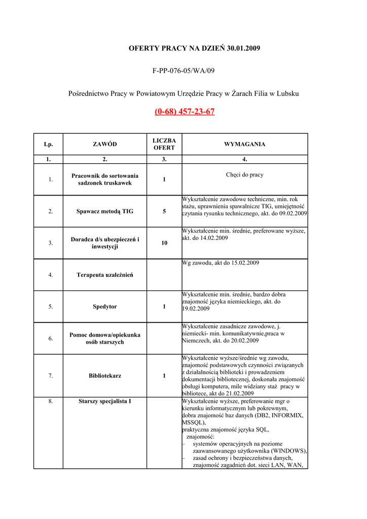 OFERTY PRACY NA DZIEŃ 30.01.2009 F-PP-076-05/WA/09 Pośrednictwo Pracy w Powiatowym Urzędzie Pracy w Żarach Filia w Lubsku (0-68) 457-23-67 Lp. ZAWÓD LICZBA OFERT WYMAGANIA 1. 2. 3. 4. Pracownik do sortowania sadzonek truskawek 1 1. 2. 3. Spawacz metodą TIG Doradca d/s ubezpieczeń i inwestycji 5 10 Chęci do pracy Wykształcenie zawodowe techniczne, min. rok stażu, uprawnienia spawalnicze TIG, umiejętność czytania rysunku technicznego, akt. do 09.02.2009 Wykształcenie min. średnie, preferowane wyższe, akt. do 14.02.2009 Wg zawodu, akt do 15.02.2009 4. Terapeuta uzależnień 5. Spedytor 6. Pomoc domowa/opiekunka osób starszych 7. Bibliotekarz 8. Starszy specjalista I 1 Wykształcenie min. średnie, bardzo dobra znajomość języka niemieckiego, akt. do 19.02.2009 Wykształcenie zasadnicze zawodowe, j. niemiecki- min. komunikatywnie,praca w Niemczech, akt. do 20.02.2009 1 Wykształcenie wyższe/średnie wg zawodu, znajomość podstawowych czynności związanych z działalnością biblioteki i prowadzeniem dokumentacji bibliotecznej, doskonała znajomość obsługi komputera, mile widziany staż pracy w bibliotece, akt do 21.02.2009 Wykształcenie wyższe, preferowanie mgr o kierunku informatycznym lub pokrewnym, dobra znajomość baz danych (DB2, INFORMIX, MSSQL), praktyczna znajomość języka SQL, znajomość: − systemów operacyjnych na poziome zaawansowanego użytkownika (WINDOWS), − zasad ochrony i bezpieczeństwa danych, znajomość zagadnień dot. sieci LAN, WAN, − standardowych aplikacji biurowych (MS Office), − języka angielskiego na poziomie średnim akt. do 23.02.2009 9. Starszy specjalista II 10. Nauczyciel j. angielskiego 11. 12. Nauczyciel j. niemieckiego Menager 1 1 1 Wykształcenie wyższe, preferowanie mgr o kierunku informatycznym lub pokrewnym znajomość: − SAP/R3 (MM, FI, inne), − zasad rachunkowości z zakresu jednostek budżetowych, − sprzętu informatyki i telekomunikacji oraz nowoczesnych standardów technologii informatycznych, − j. angielskiego na poziomie średnim, akt. do 23.02.2009 r. Znajomość języka angielskiego, akt. do 26.02.2009 Znajomość języka niemieckiego, akt. do 26.02.2009 Wykształcenie wyższe, 2 lata stażu pracy, akt. do 27.02.2009