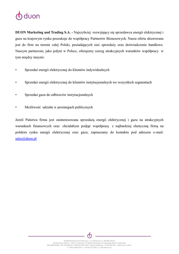 DUON Marketing and Trading S.A. - Najszybciej rozwijający się sprzedawca energii elektrycznej i gazu na krajowym rynku poszukuje do współpracy Partnerów Biznesowych. Nasza oferta skierowana jest do firm na terenie całej Polski, posiadających sieć sprzedaży oraz doświadczenie handlowe. Naszym partnerom, jako jedyni w Polsce, oferujemy szereg atrakcyjnych warunków współpracy w tym między innymi: • Sprzedaż energii elektrycznej do klientów indywidualnych • Sprzedaż energii elektrycznej do klientów instytucjonalnych we wszystkich segmentach • Sprzedaż gazu do odbiorców instytucjonalnych • Możliwość udziału w przetargach publicznych Jeżeli Państwa firma jest zainteresowana sprzedażą energii elektrycznej i gazu na atrakcyjnych warunkach finansowych oraz chciałabym podjąć współpracę z najbardziej elastyczną firmą na polskim rynku energii elektrycznej oraz gazu, zapraszamy do kontaktu pod adresem e-mail: [email protected] DUON Marketing and Trading S.A. | ul. Heweliusza 11, 80-890 Gdańsk Sąd Rejonowy Gdańsk – Północ w Gdańsku, VII Wydział Gospodarczy Krajowego Rejestru Sądowego KRS 0000378299 | NIP 7811861610 | REGON 301677244 | Kapitał zakładowy: 15 000 000 PLN – wpłacony w całości. T: +48 58 5858 438 | F: +48 58 7327 690 | E: [email protected]