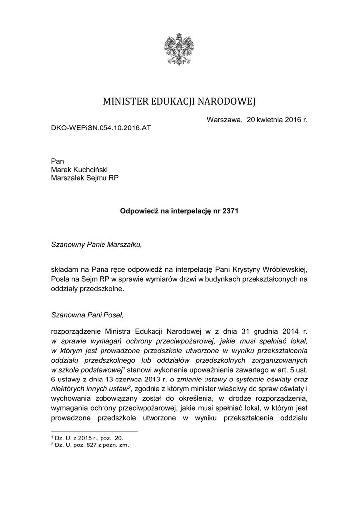 MINISTER EDUKACJI NARODOWEJ Warszawa, 20 kwietnia 2016 r. DKO-WEPiSN.054.10.2016.AT Pan Marek Kuchciński Marszałek Sejmu RP Odpowiedź na interpelację nr 2371 Szanowny Panie Marszałku, składam na Pana ręce odpowiedź na interpelację Pani Krystyny Wróblewskiej, Posła na Sejm RP w sprawie wymiarów drzwi w budynkach przekształconych na oddziały przedszkolne. Szanowna Pani Poseł, rozporządzenie Ministra Edukacji Narodowej w z dnia 31 grudnia 2014 r. w sprawie wymagań ochrony przeciwpożarowej, jakie musi spełniać lokal, w którym jest prowadzone przedszkole utworzone w wyniku przekształcenia oddziału przedszkolnego lub oddziałów przedszkolnych zorganizowanych w szkole podstawowej1 stanowi wykonanie upoważnienia zawartego w art. 5 ust. 6 ustawy z dnia 13 czerwca 2013 r. o zmianie ustawy o systemie oświaty oraz niektórych innych ustaw2, zgodnie z którym minister właściwy do spraw oświaty i wychowania zobowiązany został do określenia, w drodze rozporządzenia, wymagania ochrony przeciwpożarowej, jakie musi spełniać lokal, w którym jest prowadzone przedszkole utworzone w wyniku przekształcenia oddziału 1 2 Dz. U. z 2015 r., poz. 20. Dz. U. poz. 827 z późn. zm. przedszkolnego lub oddziałów przedszkolnych w szkole podstawowej, uwzględniając konieczność zapewnienia odpowiedniej jakości edukacji, wychowania i opieki nad dziećmi. Początkowo, zgodnie z art. 5 ust. 1 pkt 1 ww. ustawy, z dniem 1 września 2016 r. z mocy prawa oddziały przedszkolne zorganizowane w szkołach podstawowych miały przekształcić się w przedszkola funkcjonujące w ramach zespołów szkolno-przedszkolnych. Biorąc jednak pod uwagę liczne wnioski i postulaty napływające od jednostek samorządu terytorialnego oraz innych podmiotów będących organami prowadzącymi szkoły podstawowe z oddziałami przedszkolnymi, odroczono do 1 września 2019 r. wejście w życie przepisu dotyczącego obligatoryjnego przekształcenia oddziałów przedszkolnych w przedszkola, z jednoczesnym utworzeniem zespołów szkolnoprzedszkolnych3. Oznacza to, że oddziały przedszkolne w szkołach podstawowych mogą funkcjonować na dotychczasowych zasadach. Z tej samej przyczyny wydłużony zostanie czas na dostosowanie pomieszczeń do przepisów cyt. wyżej rozporządzenia Ministra Edukacji Narodowej z dnia 31 grudnia 2014 r. Rozporządzenie to reguluje wymagania ochrony przeciwpożarowej, jakie mają zastosowanie do lokalu przedszkola powstającego z przekształcenia oddziału przedszkolnego, tj. w sytuacji gdy lokal przedszkola będzie znajdował się w funkcjonującym budynku szkoły podstawowej (lub w części użytkowanego budynku szkoły). Rozporządzenie powstało w ramach ścisłej współpracy z Komedą Główną Państwowej Straży Pożarnej. Rozporządzenie przewiduje, że przedszkole powstałe w wyniku przekształcenia dotychczasowego oddziału przedszkolnego lub oddziałów przedszkolnych w szkole podstawowej co do zasady będzie mogło funkcjonować w lokalu znajdującym się w użytkowanym budynku szkoły lub jego części spełniających wymagania określone w przepisach techniczno-budowlanych oraz przepisach dotyczących ochrony przeciwpożarowej dla kategorii zagrożenia ludzi ZL II4) lub Zgodnie z art. 2 pkt. 3 ustawy z dnia 29 stycznia 2015 r. o zmianie ustawy o systemie oświaty oraz niektórych innych ustaw (Dz. U. z 2016 r., poz. 35). 4) W szczególności rozporządzenie Ministra Infrastruktury z dnia 12 kwietnia 2002 r. w sprawie warunków technicznych, jakim powinny odpowiadać budynki i ich usytuowanie (j.t. Dz. U. z 2015 r. poz. 1422), rozporządzenie Ministra Spraw Wewnętrznych i Administracji z dnia 7 czerwca 2010 r. w sprawie ochrony przeciwpożarowej budynków, innych obiektów budowlanych i terenów (Dz. U. Nr 109, poz. 719), rozporządzenie Ministra Spraw Wewnętrznych 3 2 wymagania uzgodnione z właściwym miejscowo komendantem wojewódzkim Państwowej Straży Pożarnej, w trybie określonym w tych przepisach. Zgodnie z art. 14 ust. 1 ustawy o systemie oświaty5, od 1 września 2016 r. wychowanie przedszkolne obejmuje dzieci od początku roku szkolnego w roku kalendarzowym, w którym dziecko kończy 3 lata, do końca roku szkolnego w roku kalendarzowym, w którym dziecko kończy 7 lat. Wychowanie przedszkolne jest realizowane w przedszkolach oraz w innych formach wychowania przedszkolnego, a do 31 sierpnia 2019 r. także w oddziałach przedszkolnych w szkołach podstawowych. W związku z tym, że z wychowania przedszkolnego w oddziałach przedszkolnych w szkołach podstawowych mogą korzystać także dzieci 3-letnie, ze względu na konieczność zapewnienia im bezpieczeństwa oraz możliwości przeprowadzenia sprawnej ewakuacji w przypadku sytuacji zagrożenia, ww. rozporządzenie przewiduje, że przedszkole utworzone w wyniku przekształcenia oddziału przedszkolnego lub oddziałów przedszkolnych w szkole podstawowej, ma znajdować się w wydzielonym lokalu. Przepisy rozporządzenia nakazują zastosowanie drzwi o klasie odporności ogniowej co najmniej EI 30 (z urządzeniem zapewniającym samoczynne zamykanie) w otworach drzwiowych pomiędzy szkołą a przedszkolem. Przytoczone przez Panią Poseł przepisy dotyczące szerokości drzwi wejściowych do lokalu przedszkola utworzonego w wyniku przekształcenia oddziału przedszkolnego lub oddziałów przedszkolnych w szkole podstawowej, są jedynie powtórzeniem wymagań zawartych w rozporządzeniu Ministra Infrastruktury z dnia 12 kwietnia 2002 r. w sprawie warunków technicznym, jakim powinny odpowiadać budynki i ich usytuowanie6 - drzwi wejściowe do budynku i ogólnodostępnych pomieszczeń użytkowych oraz do mieszkań powinny mieć w świetle ościeżnicy co najmniej: szerokość 0,9 m i wysokość 2 m. W przypadku zastosowania drzwi zewnętrznych dwuskrzydłowych szerokość skrzydła głównego nie może być mniejsza niż 0,9 m7. Należy mieć na uwadze, że oddziały przedszkolne w szkołach podstawowych funk