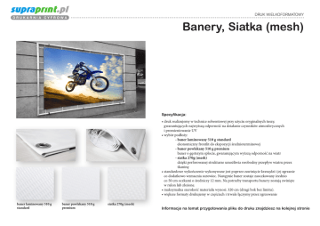 DRUK WIELKOFORMATOWY Banery, Siatka (mesh) Specyfikacja: • druk realizujemy w technice solwentowej przy użyciu oryginalnych tuszy, gwarantujących najwyższą odporność na działanie czynników atmosferycznych i promieniowanie UV • wybór podłoży: -b aner laminowany 510 g standard ekonomiczny frontlit do ekspozycji średnioterminowej -b aner powlekany 510 g premium baner o gęstszym splocie, gwaranującym wyższą odporność na wiatr - s iatka 270g (mesh) dzięki perforowanej strukturze umożliwia swobodny przepływ wiatru przez tkaninę • standardowe wykończenie wykonywane jest poprzez zawinięcie krawędzi i jej zgrzanie co dodatkowo wzmacnia surowiec. Następnie baner zostaje zaoczkowany średnio co 50 cm oczkami o średniczy 12 mm. Na potrzeby transportu banery zostają zwinięte w rulon lub złożone. • maksymalna szerokość materiału wynosi: 320 cm (drugi bok bez limitu). • większe formaty drukujemy w częściach i trwale łączymy przez zgrzewanie aner laminowany 510 g b standard baner powlekany 510 g premium siatka 270g (mesh) Informacje na temat przygotowania pliku do druku znajdziesz na kolejnej stronie DRUK WIELKOFORMATOWY Banery, Siatka (mesh) rozmiar brutto Czyli rozmiar netto powiększonym o 10 mm spadu z każdej strony i 40 mm białego tła na zawinięcie (w sumie 50 mm z każdej strony). rozmiar netto Takie wymiary będzie miał produkt po przycięciu. obszar bezpieczny Czyli rozmiar netto pomniejszony o 50 mm z każdej strony ze względu na oczkowanie. Proszę nie umieszczać istotnych elementów graficznych poza tym obszarem (loga, tekstów, równoległych do krawędzi linii). RozdzielczoÊç grafiki: 1 m2 - 150 dpi 6 m2 - 72 dpi Do druku wielkoformatowego przyjmujemy pliki w formacie TIFF: 2 m2 - 120 dpi 7 m2 - 60 dpi 3 m2 - 100 dpi 8 m2 - 50 dpi 4 m2 - 80 dpi 9 m2 - 45 dpi 5 m2 - 72 dpi 10 m2 - 40 dpi • przygotowane w trybie CMYK, bez dołączonych profili • zapisane bez warstw, z kompresją LZW (TIFF) • w rozmiarze zgodnym z zamawianym produktem (skala 1:1), powiększonym o 10 mm spadu z każdej strony i 40 mm białego tła na zawinięcie • odległość istotnych elementów graficznych (loga, tekstów, równoległych do krawędzi linii) od rozmiaru netto powinna wynosić minimum 50 mm (ze względu na oczkowanie) szczegółowa tabela wymaganych rozdzielczości znajduje się na naszej stronie sklepu w zakładce CENTRUM POMOCY / JAK PRZYGOTOWAĆ PLIKI DO DRUKU? Przykład: • format netto: 300 x 100 cm (3 x 1 m) Uwaga! D ruk kilku wzorów tego samego produktu prosz´ zlecaç w pojedynczych zamówieniach. • po 1 cm grafiki na tzw. spad dodane do każdego boku • po 4 cm białego tła na zawinięcie i zgrzanie krawędzi • poprawnie przygotowany plik do druku powinien mieć format brutto: 310 x 110 cm Pomoc Jeżeli masz jakiekolwiek pytania dotyczące przygotowania plików to skontaktuj się z nami pisząc na adres [email protected]. Nasi specjaliści pomogą Ci rozwiać wszelkie wątpliwości.