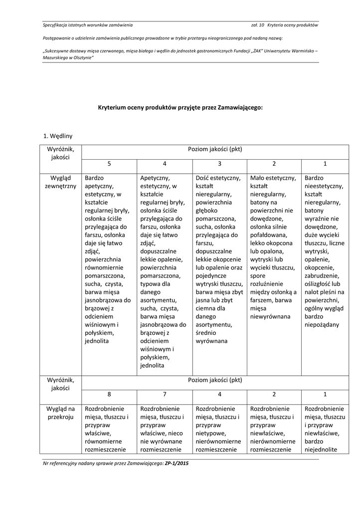 Specyfikacja istotnych warunków zamówienia zał. 10 Kryteria oceny produktów Postępowanie o udzielenie zamówienia publicznego prowadzone w trybie przetargu nieograniczonego pod nadaną nazwą: „Sukcesywne dostawy mięsa czerwonego, mięsa białego i wędlin do jednostek gastronomicznych Fundacji „ŻAK” Uniwersytetu Warmińsko – Mazurskiego w Olsztynie” Kryterium oceny produktów przyjęte przez Zamawiającego: 1. Wędliny Wyróżnik, jakości Wygląd zewnętrzny Wyróżnik, jakości Wygląd na przekroju Poziom jakości (pkt) 5 4 3 2 1 Bardzo apetyczny, estetyczny, w kształcie regularnej bryły, osłonka ściśle przylegająca do farszu, osłonka daje się łatwo zdjąć, powierzchnia równomiernie pomarszczona, sucha, czysta, barwa mięsa jasnobrązowa do brązowej z odcieniem wiśniowym i połyskiem, jednolita Apetyczny, estetyczny, w kształcie regularnej bryły, osłonka ściśle przylegająca do farszu, osłonka daje się łatwo zdjąć, dopuszczalne lekkie opalenie, powierzchnia pomarszczona, typowa dla danego asortymentu, sucha, czysta, barwa mięsa jasnobrązowa do brązowej z odcieniem wiśniowym i połyskiem, jednolita Dość estetyczny, kształt nieregularny, powierzchnia głęboko pomarszczona, sucha, osłonka przylegająca do farszu, dopuszczalne lekkie okopcenie lub opalenie oraz pojedyncze wytryski tłuszczu, barwa mięsa zbyt jasna lub zbyt ciemna dla danego asortymentu, średnio wyrównana Mało estetyczny, kształt nieregularny, batony na powierzchni nie dowędzone, osłonka silnie pofałdowana, lekko okopcona lub opalona, wytryski lub wycieki tłuszczu, spore rozluźnienie między osłonką a farszem, barwa mięsa niewyrównana Bardzo nieestetyczny, kształt nieregularny, batony wyraźnie nie dowędzone, duże wycieki tłuszczu, liczne wytryski, opalenie, okopcenie, zabrudzenie, oślizgłość lub nalot pleśni na powierzchni, ogólny wygląd bardzo niepożądany 4 2 1 Rozdrobnienie mięsa, tłuszczu i przypraw nietypowe, nierównomierne rozmieszczenie Rozdrobnienie mięsa, tłuszczu i przypraw niewłaściwe, nierównomierne rozmieszczenie Rozdrobnienie mięsa, tłuszczu i przypraw niewłaściwe, bardzo niejednolite Poziom jakości (pkt) 8 Rozdrobnienie mięsa, tłuszczu i przypraw właściwe, równomierne rozmieszczenie 7 Rozdrobnienie mięsa, tłuszczu i przypraw właściwe, nieco nie wyrównane rozmieszczenie Nr referencyjny nadany sprawie przez Zamawiającego: ZP-1/2015 Specyfikacja istotnych warunków zamówienia zał. 10 Kryteria oceny produktów Postępowanie o udzielenie zamówienia publicznego prowadzone w trybie przetargu nieograniczonego pod nadaną nazwą: „Sukcesywne dostawy mięsa czerwonego, mięsa białego i wędlin do jednostek gastronomicznych Fundacji „ŻAK” Uniwersytetu Warmińsko – Mazurskiego w Olsztynie” kawałków mięsa i tłuszczu na przekroju, związanie plastra bardzo dobre, ogólny wygląd bardzo pożądany, barwa czysta, bardzo wyrównana, intensywna różowa do ciemnowiśniowej, typowa dla danego asortymentu, barwa tłuszczu biała Wyróżnik, jakości Smak i zapach składników na przekroju, dopuszczalne otwory powietrzne, związanie plastra dostateczne, ogólny wygląd obojętny, barwa mało wyrównana, nietypowa dla danego asortymentu, niewielkie odbarwienie miejscowe kawałków mięsa, barwa tłuszczu biała z odcieniem kremowym składników na przekroju, otwory powietrzne, widoczne ścięgna oraz zacieki tłuszczu pod osłonką, związanie plastra dostateczne, ogólny wygląd niepożądany, barwa kawałków mięsa i farszu szarawa, barwa tłuszczu biała z odcieniem żółtawym rozmieszczenie składników na przekroju, liczne otwory powietrzne, widoczne ścięgna, związanie plastra złe, plastry rozpadają się, ogólny wygląd bardzo niepożądany, barwa kawałków mięsa i farszu szara lub szarozielona, barwa tłuszczu żółta 2 1 Poziom jakości (pkt) 10 Konsystencja Dość twarda lub bardzo ścisła, typowa dla danego asortymentu, plastry grubości 2 mm nie mogą się rozpadać Wyróżnik jakości składników na przekroju, dopuszczalne bardzo małe pojedyncze otwory powietrzne, związanie plastra dobre, ogólny wygląd pożądany, barwa czysta, wyrównana, różowa do ciemnowiśniowej, typowa dla danego asortymentu, barwa tłuszczu biała z odcieniem różowym 9 6 Ścisła do bardzo ścisłej, plastry grubości 2 mm nie mogą się rozpadać Mało ścisła lub zbyt twarda, nietypowa dla danego asortymentu Niejednolita, miękkawa, nietypowa dla danego asortymentu, nieco gąbczasta Luźna, gąbczasta Poziom jakości (pkt) 11 10 Smak charakterystyczny dla danego asortymentu, wyraźnie wyczuwalny i bardzo pożądany smak przypraw i wędzenia ogólnie smakowitość Smak charakterystyczny dla danego asortymentu, wyczuwalny i pożądany smak przypraw i wędzenia ogólnie smakowitość pożądana, zapach Nr referencyjny nadany sprawie przez Zamawiającego: ZP-1/2015 6 Smak nieco nietypowy, ogólnie smakowitość obojętna, zbyt słabo lub zbyt silnie wyczuwalny smak przypraw lub wędzenia, 2 1 Smakowitość niepożądana lub wyraźnie nietypowa dla danego asortymentu, zapach nie zharmonizowany, słabo wyczuwalny lub Smak nieprzyjemny, obcy, jełki, smakowitość bardzo niepożądana, zapach obcy, nieświeży, jełki Specyfikacja istotnych warunków zamówienia zał. 10 Kryteria oceny produktów Postępowanie o udzielenie zamówienia publicznego prowadzone w trybie przetargu nieograniczonego pod nadaną nazwą: „Sukcesywne dostawy mięsa czerwonego, mięsa białego i wędlin do jednostek gastronomicznych Fundacji „ŻAK” Uniwersytetu Warmińsko – Mazurskiego w Olsztynie” bardzo pożądana, zapach zharmonizowany, bardzo przyjemny, czysty z wyczuwalnym zapachem wędzenia i przypraw zharmonizowany, przyjemny, czysty z wyczuwalnym zapachem wędzenia zapach mało zbyt silny zharmonizowany, wędzarniczy dość przyjemny, nieco nietypowy dla danego asortymentu, zbyt mocno lub zbyt słabo wyczuwalny zapach węd