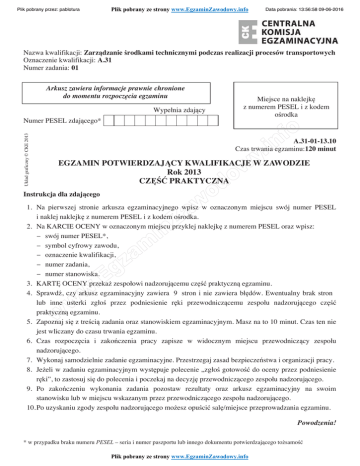 Plik pobrany przez: pablotura Plik pobrany ze strony www.EgzaminZawodowy.info Data pobrania: 13:56:58 09-06-2016 Nazwa kwalifikacji: Zarządzanie środkami technicznymi podczas realizacji procesów transportowych Oznaczenie kwalifikacji: A.31 Numer zadania: 01 Arkusz zawiera informacje prawnie chronione do momentu rozpoczęcia egzaminu Wypełnia zdający Układ graficzny © CKE 2013 Numer PESEL zdającego* Miejsce na naklejkę z numerem PESEL i z kodem ośrodka A.31-01-13.10 Czas trwania egzaminu:120 minut EGZAMIN POTWIERDZAJĄCY KWALIFIKACJE W ZAWODZIE Rok 2013 CZĘŚĆ PRAKTYCZNA Instrukcja dla zdającego 1. Na pierwszej stronie arkusza egzaminacyjnego wpisz w oznaczonym miejscu swój numer PESEL i naklej naklejkę z numerem PESEL i z kodem ośrodka. 2. Na KARCIE OCENY w oznaczonym miejscu przyklej naklejkę z numerem PESEL oraz wpisz: – swój numer PESEL*, – symbol cyfrowy zawodu, – oznaczenie kwalifikacji, – numer zadania, – numer stanowiska. 3. KARTĘ OCENY przekaż zespołowi nadzorującemu część praktyczną egzaminu. 4. Sprawdź, czy arkusz egzaminacyjny zawiera 9 stron i nie zawiera błędów. Ewentualny brak stron lub inne usterki zgłoś przez podniesienie ręki przewodniczącemu zespołu nadzorującego część praktyczną egzaminu. 5. Zapoznaj się z treścią zadania oraz stanowiskiem egzaminacyjnym. Masz na to 10 minut. Czas ten nie jest wliczany do czasu trwania egzaminu. 6. Czas rozpoczęcia i zakończenia pracy zapisze w widocznym miejscu przewodniczący zespołu nadzorującego. 7. Wykonaj samodzielnie zadanie egzaminacyjne. Przestrzegaj zasad bezpieczeństwa i organizacji pracy. 8. Jeżeli w zadaniu egzaminacyjnym występuje polecenie „zgłoś gotowość do oceny przez podniesienie ręki”, to zastosuj się do polecenia i poczekaj na decyzję przewodniczącego zespołu nadzorującego. 9. Po zakończeniu wykonania zadania pozostaw rezultaty oraz arkusz egzaminacyjny na swoim stanowisku lub w miejscu wskazanym przez przewodniczącego zespołu nadzorującego. 10. Po uzyskaniu zgody zespołu nadzorującego możesz opuścić salę/miejsce przeprowadzania egzaminu. Powodzenia! * w przypadku braku numeru PESEL – seria i numer paszportu lub innego dokumentu potwierdzającego tożsamość Plik pobrany ze strony www.EgzaminZawodowy.info Plik pobrany przez: pablotura Plik pobrany ze strony www.EgzaminZawodowy.info Data pobrania: 13:56:58 09-06-2016 Zadanie egzaminacyjne Opracuj plan przewozu uwzględniając najkrótszą trasę zgodnie z podanymi odległościami, harmonogram realizacji usługi transportowej od załadunku do miejsca rozładunku u ostatniego odbiorcy z uwzględnieniem czasu pracy kierowcy oraz kosztorys za realizację usługi przewozu zgodnie z podanym cennikiem. Uzupełnij brakujące dane w umowie przewozu oraz międzynarodowym liście przewozowym CMR nr 199 dla odbiorcy Supermarket Planet. Informacje dotyczące usługi transportowej Zleceniobiorca usługi Firma "TUP-TRANS" z Poznania otrzymała zlecenie transportowe Nr 22 od zleceniodawcy Fresh Polska na przewóz lodówek do odbiorców Planet, Mars i Saturn. Czas rozładunku towaru u każdego odbiorcy wynosi po 30 minut, a średnia prędkość przejazdu to 70 km/h. Obsadę środka transportu stanowi jeden kierowca rozpoczynający pracę podczas załadunku i kończący ją u ostatniego odbiorcy. Do przewozu należy użyć naczepę o najwyższym współczynniku wypełnienia będącą w dyspozycji firmy „TUP-TRANS” oraz przyjąć najniższy koszt przewozu z uwzględnieniem cennika przewozu. Stawka podatku VAT za usługi transportowe wynosi 23%. Cennik należy zastosować z uwzględnieniem łącznej liczby kilometrów. Strona 2 z 9 Plik pobrany ze strony www.EgzaminZawodowy.info Plik pobrany przez: pablotura Plik pobrany ze strony www.EgzaminZawodowy.info Data pobrania: 13:56:58 09-06-2016 Zlecenie transportowe na przewóz lodówek ZLECENIE TRANSPORTOWE Nr 22 1. Zleceniobiorca: 2. Zleceniodawca (nazwa i adres firmy, NIP): Firma "TUP-TRANS" ul. Słoneczna 12 60-635 Poznań NIP 878 -561-29-15 PKO BP I/ O Poznań Nr: 58 1020 4563 0000 1973 3821 3179 Fresh Polska ul. Bydgoska 7 60-886 Poznań NIP 871-016-92-51 PKO BP II/O Poznań Nr : 11 1020 0000 4311 1973 2238 2221 3. Środek transportu: 4. Osoba prowadząca u Zleceniodawcy (imię i nazwisko, tel./fax, e-mail): Jan Kowalski tel./fax. ( 61) 8556988, [email protected] Ciągnik siodłowy z naczepą 5. Miejsce załadunku (adres, nazwa firmy, tel./fax.): Fresh Polska ul. Bydgoska 7 60-886 Poznań tel./fax. ( 61) 8556988 7. Godzina wyjazdu środka transportu od nadawcy: 8.00 6. Miejsce rozładunku/odbiorca (adres, nazwa firmy) i ilość dostarczanego towaru: Supermarket Planet Alexanderplatz 9 10719 Berlin 12 szt. Supermarket Mars Friedrich Platz 2 01069 Dresden 10 szt. Supermarket Saturn Schonebecker Str. 27 39104 Magdeburg 11 szt. 8. Opis ładunku (nazwa, rodzaj opakowania, ilość, objętość, wymiary, oznakowanie, grupa pakowania): lodówka (długość x szerokość x wysokość) 1100 x 750 x 1770 mm, karton, - 33 szt., waga brutto jednej paletowej jednostki ładunkowej- 84 kg (wraz z paletą EUR o wymiarach 1200 x 800 x 144 mm). 9. Uwagi: Towar musi być przewożony wyłącznie w pionie, nie piętrzyć ładunku. Jedna lodówka - jedna paleta. Fresh Polska Jan Kowalski ……………………….. pieczątka i podpis zleceniodawcy Strona 3 z 9 Plik pobrany ze strony www.EgzaminZawodowy.info Plik pobrany ze strony www.EgzaminZawodowy.info Plik pobrany przez: pablotura Data pobrania: 13:56:58 09-06-2016 Naczepy w dyspozycji firmy "TUP-TRANS" Wymiary wewnętrzne Naczepa nr Długość [mm] 1 4200 1900 1600 1,5 2 4200 2100 2000 2 3 7200 2450 2500 7 4 13060 2460 2650 20 5 13690 2320 2600 24 6 13690 2450 2600 24 Ładowność [t] Szerokość [mm] Wysokość [mm] Odległości między miastami Wyjazd z Przyjazd do odległość Poznań Berlin 273 km Poznań Magdeburg 400 km Poznań Drezno 412 km Berlin Magdeburg 140 km Berlin Drezno 194 km Magdeburg Drezno 209