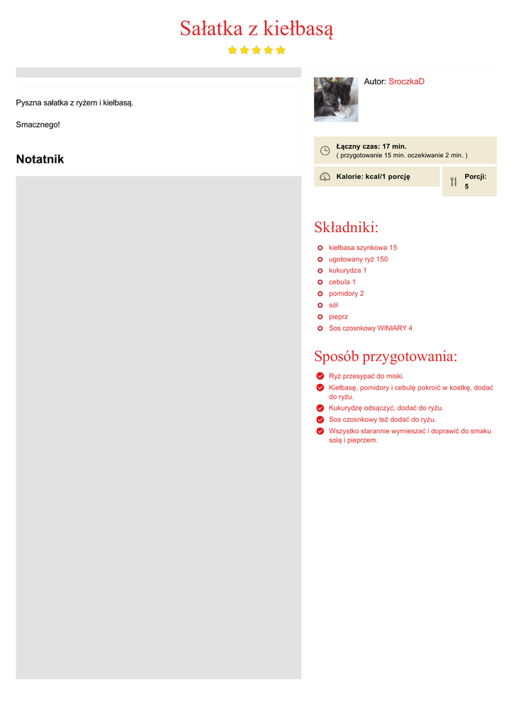 Sałatka z kiełbasą Autor: SroczkaD Pyszna sałatka z ryżem i kiełbasą. Smacznego! Łączny czas: 17 min. Notatnik ( przygotowanie 15 min. oczekiwanie 2 min. ) Kalorie: kcal/1 porcję Porcji: 5 Składniki: kiełbasa szynkowa 15 ugotowany ryż 150 kukurydza 1 cebula 1 pomidory 2 sól pieprz Sos czosnkowy WINIARY 4 Sposób przygotowania: Ryż przesypać do miski. Kiełbasę, pomidory i cebulę pokroić w kostkę, dodać do ryżu. Kukurydzę odsączyć, dodać do ryżu. Sos czosnkowy też dodać do ryżu. Wszystko starannie wymieszać i doprawić do smaku solą i pieprzem.