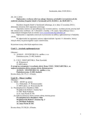 Serokomla, dnia 19.09.2016 r. ZS. 241.2.2016 Ogłoszenie o wyborze ofert na zakup i dostawę artykułów żywnościowych do stołówki szkolnej Zespołu Szkół w Serokomli od 01.10.2016 r. do 30.09.2017 r. Dyrektor Zespołu Szkół w Serokomli informuje, że w dniu 12 września 2016 r. dokonano otwarcia ofert zapytania cenowego. Zapytania cenowe ze specyfikacją oraz wzorem umowy wysłano pocztą, pocztą mail lub dostarczono osobiście do 3 oferentów z każdej z IX części. Specyfikacja wraz z załącznikami dostępna była na stronie www.zsserokomla.bip.lubelskie.pl . Ogłoszenie o zapytaniu cenowym wywieszono na tablicy ogłoszeniowej w budynku szkoły. W odpowiedzi na zapytanie cenowe odpowiedziało łącznie 11 oferentów, którzy złożyli oferty na poszczególne części zamówienia. Kryterium oceny ofert była najniższa cena. Część I – Artykuły ogólnospożywcze Oferenci : 1) ALMAX – DYSTRYBUCJA spółka z. o.o. Panieńszczyzna, 21-002 Jastków 2) F.H.U. NEKTARYNKA Piotr Sowiński ul. Wiśniowa 8 21-400 Łuków Z uwagi na rezygnacje i wycofanie oferty firmy F.H.U. NEKTARYNKA za najkorzystniejszą ofertę uznano ofertę złożoną przez: ALMAX – DYSTRYBUCJA spółka z. o.o. Panieńszczyzna, 21-002 Jastków Kwota oferty 26.173,11 zł brutto Część II - Mięso i wędliny Oferenci : 1) MIĘS – HURT sp. jawna Cz. Oleksiński , P. Wereszczyński 21-400 Łuków, ul. Warszawska 88 2) Przedsiębiorstwo Handlowe Milo Wojdakowski Robert i Joanna Sp.J 21-500 Biała Podlaska ul.Al. Jana Pawła II 194 Za najkorzystniejszą ofertę uznano ofertę złożoną przez Przedsiębiorstwo Handlowe Milo Wojdakowski Robert i Joanna Sp. J 21-150 Biała Podlaska Al. Jana Pawła II 194 Kwota oferty 35.530,26 zł brutto 1 Część III – Mrożonki warzywne i ryby Oferenci : 1) Lodex PPHU Mirosław Piskorski 21-200 Parczew ul. Kolejowa 131 2) Iglotex – Łukasz sp. z o. o. Porosły 99, 21-070 Choroszcz Filia Lublin ul. Wł. Grabskiego 23, 20 -330 Lublin 3) MIĘS – HURT sp. jawna Cz. Oleksiński , P. Wereszczyński 21-400 Łuków, ul. Warszawska 88 Za najkorzystniejszą ofertę uznano ofertę złożoną przez : Iglotex – Łukasz sp. z o. o. Porosły 99, 21-070 Choroszcz Filia Lublin ul. Wł. Grabskiego 23, 20 -330 Lublin Kwota oferty 12.638,42 zł brutto Część IV- Pieczywo Oferenci : 1) Zakład Piekarniczy s.c. „Szczepaniak” ul. 3 Maja 34, 21-150 Kock 2) Ciastkarnia Maria Jolanta Mitura, Stanisław Mitura ul. B. Joselewicza 104 a 21-150 Kock Za najkorzystniejszą ofertę uznano ofertę : Ciastkarnia Maria Jolanta Mitura, Stanisław Mitura ul. B. Joselewicza 104 a 21-150 Kock Kwota oferty brutto 5.816,60 zł brutto Część V – ziemniaki Oferenci : 1) F.H.U. NEKTARYNKA Piotr Sowiński ul. Wiśniowa 8 21-400 Łuków 2) LOBO s. c Hurtownia Owoców i Warzyw ul. Fabryczna 2, 08-500 Ryki 2 Z uwagi na rezygnacje i wycofanie oferty firmy F.H.U. NEKTARYNKA za najkorzystniejszą ofertę uznano ofertę złożoną przez: LOBO s. c Hurtownia Owoców i Warzyw ul. Fabryczna 2 08- 500 Ryki Kwota oferty brutto 4440,00 zł brutto Część VI – Owoce i warzywa Oferenci : 1) LOBO s. c Hurtownia Owoców i Warzyw ul. Fabryczna 2 08- 500 Ryki 2) F.H.U. NEKTARYNKA Piotr Sowiński ul. Wiśniowa 8 21-400 Łuków Z uwagi na rezygnacje i wycofanie oferty firmy F.H.U. NEKTARYNKA za najkorzystniejszą ofertę uznano ofertę złożoną przez: LOBO s. c Hurtownia Owoców i Warzyw ul. Fabryczna 2 08- 500 Ryki Część VII – Mleko i jego przetwory Oferenci: 1) F.H.U. NEKTARYNKA Piotr Sowiński ul. Wiśniowa 8 21-400 Łuków 2)MIĘS – HURT sp. jawna Cz. Oleksiński , P. Wereszczyński 21-400 Łuków, ul. Warszawska 88 3) Przedsiębiorstwo Handlowe Milo Wojdakowski Robert i Joanna Sp.J 21-500 Biała Podlaska ul.Al. Jana Pawła II 194 Z uwagi na rezygnacje i wycofanie oferty firmy F.H.U. NEKTARYNKA za najkorzystniejszą ofertę uznano ofertę złożoną przez: Przedsiębiorstwo Handlowe Milo Wojdakowski Robert i Joanna Sp.J 21-500 Biała Podlaska ul. Al. Jana Pawła II 194 Kwota oferty brutto- 9.758,08 zł brutto Część VIII – Jaja 3 Oferenci: 1) LOBO s. c Hurtownia Owoców i Warzyw ul. Fabryczna 2 08- 500 Ryki 2)MIĘS – HURT sp. jawna Cz. Oleksiński , P. Wereszczyński 21-400 Łuków, ul. Warszawska 88 3) Przedsiębiorstwo Handlowe Milo Wojdakowski Robert i Joanna Sp.J 21-150 Biała Podlaska ul .A. Jana Pawła II 194 4) F.H.U. NEKTARYNKA Piotr Sowiński ul. Wiśniowa 8 21-400 Łuków Za najkorzystniejszą ofertę uznano ofertę złożoną przez : LOBO s. c Hurtownia Owoców i Warzyw ul. Fabryczna 2 08- 500 Ryki Kwota oferty – 928,00 zł brutto Część IX – wyroby garmażeryjne Oferenci: 1) P.P. H.U GAMA BIS J. Kopeć, J. Rzepko ul. Żelechowska 67 21-400 Łuków 2) P.P.H Lucyna Gołębiowska Ul. Radzyńska 5, 20-850 Lublin Za najkorzystniejszą ofertę uznano ofertę : P.P.H Lucyna Gołębiowska Ul. Radzyńska 5, 20-850 Lublin Kwota oferty 13.641,60 zł brutto Dziękujemy wszystkim firmom za złożenie ofert na nasze zapytanie cenowe. Dyrektor Zespołu Szkół w Serokomli mgr Hanna Niedziółka 4