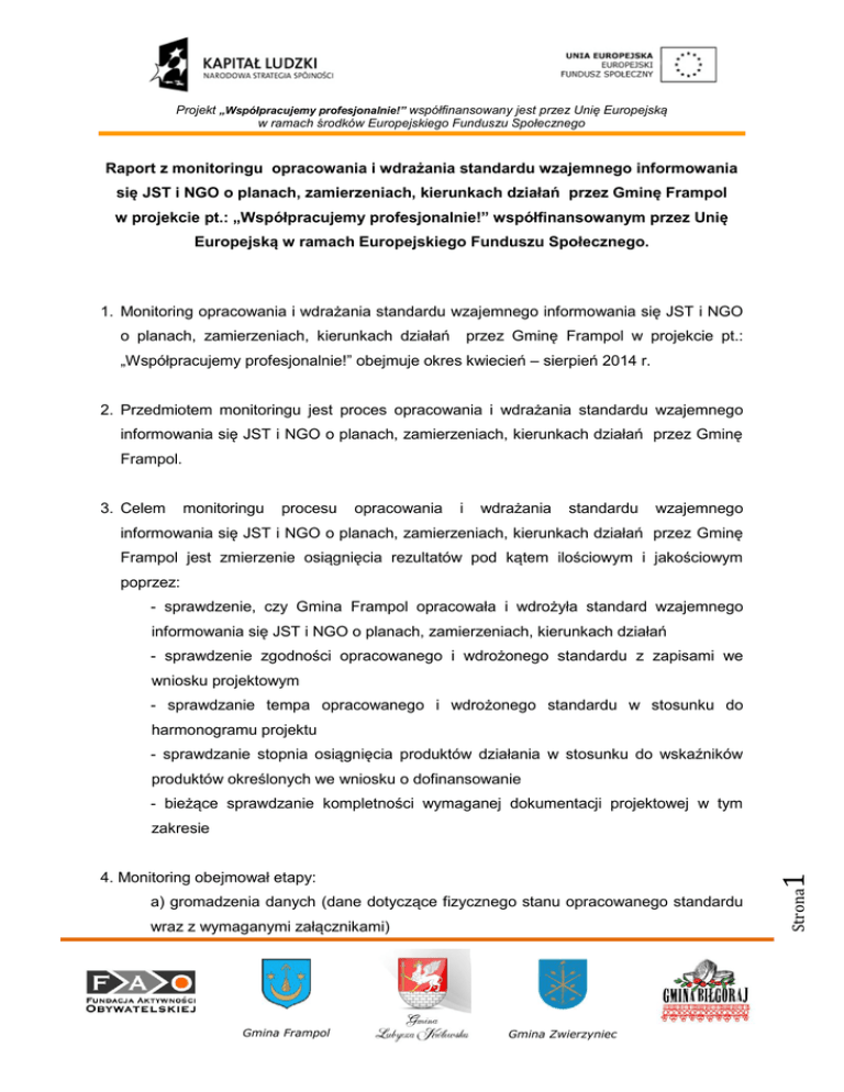 Projekt „Współpracujemy profesjonalnie!” współfinansowany jest przez Unię Europejską w ramach środków Europejskiego Funduszu Społecznego Raport z monitoringu opracowania i wdrażania standardu wzajemnego informowania się JST i NGO o planach, zamierzeniach, kierunkach działań przez Gminę Frampol w projekcie pt.: „Współpracujemy profesjonalnie!” współfinansowanym przez Unię Europejską w ramach Europejskiego Funduszu Społecznego. 1. Monitoring opracowania i wdrażania standardu wzajemnego informowania się JST i NGO o planach, zamierzeniach, kierunkach działań przez Gminę Frampol w projekcie pt.: „Współpracujemy profesjonalnie!” obejmuje okres kwiecień – sierpień 2014 r. 2. Przedmiotem monitoringu jest proces opracowania i wdrażania standardu wzajemnego informowania się JST i NGO o planach, zamierzeniach, kierunkach działań przez Gminę Frampol. 3. Celem monitoringu procesu opracowania i wdrażania standardu wzajemnego informowania się JST i NGO o planach, zamierzeniach, kierunkach działań przez Gminę Frampol jest zmierzenie osiągnięcia rezultatów pod kątem ilościowym i jakościowym poprzez: - sprawdzenie, czy Gmina Frampol opracowała i wdrożyła standard wzajemnego informowania się JST i NGO o planach, zamierzeniach, kierunkach działań - sprawdzenie zgodności opracowanego i wdrożonego standardu z zapisami we wniosku projektowym - sprawdzanie tempa opracowanego i wdrożonego standardu w stosunku do harmonogramu projektu - sprawdzanie stopnia osiągnięcia produktów działania w stosunku do wskaźników produktów określonych we wniosku o dofinansowanie - bieżące sprawdzanie kompletności wymaganej dokumentacji projektowej w tym zakresie a) gromadzenia danych (dane dotyczące fizycznego stanu opracowanego standardu wraz z wymaganymi załącznikami) Gmina Frampol Gmina Zwierzyniec Strona 1 4. Monitoring obejmował etapy: Projekt „Współpracujemy profesjonalnie!” współfinansowany jest przez Unię Europejską w ramach środków Europejskiego Funduszu Społecznego b) analizowanie danych (porównywanie danych ze wskaźnikami określonymi we wniosku projektowym i innymi dokumentami, analizowanie danych według kryterium płci) c) raportowania danych (sporządzanie 1 raportu z monitoringu opracowania i wdrażania standardu wzajemnego informowania się JST i NGO o planach, zamierzeniach, kierunkach działań przez Gminę Frampol w formie pisemnej drukowanej i elektronicznej dostarczanej koordynatorce projektu) 5. Źródła danych: - Desk Research - analiza dokumentów: wniosek projektowy, opracowany standard wraz z załącznikami, tj. uchwałą/ami jego wdrożenia, Poradnik Modelowej Współpracy Administracji Publicznej i Organizacji Pozarządowych, Model Współpracy - 1 kwestionariusz ankiety badający opnie uczestników na początku i na końcu warsztatu w zakresie opracowania i wdrożenia standardu wzajemnego informowania się JST i NGO o planach, zamierzeniach, kierunkach działań. 6. Podstawowe zasady monitoringu i gromadzenia danych: - zaangażowanie i odpowiedzialność partnerów procesu monitorowania w celu zapewnienia efektywności i skuteczności tych działań oraz obiektywnej oceny ich wyników; - niezależność osądu jako konieczność bezstronnego, pozbawionego uprzedzeń podejścia przy analizie i ocenie wyników w celu uzyskania przydatnych do zarządzania projektem wskaźników rezultatów; - otwartość i przejrzystość, czyli stworzenie atmosfery wzajemnego zaufania poprzez udostępnienie sprawozdań, dokumentów i informacji koniecznych do monitorowania; - triangulacja; o planach, zamierzeniach, kierunkach działań Gmina Frampol Gmina Zwierzyniec Strona - liczba gmin, które opracowały standard wzajemnego informowania się JST i NGO 2 7. W procesie monitoringu wdrażania standardów będą gromadzone następujące wskaźniki: Projekt „Współpracujemy profesjonalnie!” współfinansowany jest przez Unię Europejską w ramach środków Europejskiego Funduszu Społecznego - liczba uchwał o wdrożeniu standardu wzajemnego informowania się JST i NGO o planach, zamierzeniach, kierunkach działań - liczba przedstawicieli JST i NGO u których nastąpi wzrost wiedzy na warsztacie z opracowania i wdrażania standardu wzajemnego informowania się JST i NGO o planach, zamierzeniach, kierunkach działań. Wyniki monitoringu: 1) Pytanie: Czy Gmina Frampol opracowała standard wzajemnego informowania się JST i NGO o planach, zamierzeniach, kierunkach? Odpowiedź: tak. Gmina Frampol opracowała dokument o nazwie: „Standard wzajemnego informowania się Gminy Frampol i organizacji pozarządowych działających na terenie gminy Frampol o planach, zamierzeniach i kierunkach działań” Uzasadnienie: Standard wzajemnego informowania się JST i NGO o planach, zamierzeniach, 1. kierunkach działań został opracowany w oparciu o dokument: „Poradnik Modelowej Współpracy Administracji Publicznej i Organizacji Pozarządowych” (Poradnik modelowej współpracy jest dostępny na stronie internetowej: http://www.pokl541.pozytek.gov.pl/Produkty,38.html) Informacja o Modelu współpracy Model współpracy jest wskazaniem ogólnej metody budowania właściwych relacji między sektorem publicznym i organizacjami pozarządowymi przede wszystkim w oparciu o zapisy Ustawy o działalności pożytku publicznego i o wolontariacie. Model wyszczególnia trzy płaszczyzny współpracy: Współpracy organizacji jednostek samorządu terytorialnego i organizacji 3 pozarządowych w zakresie tworzenia polityk publicznych, w tym: a. Wzajemnego informowania się; b. Współtworzenia strategii i programów polityk publicznych; Gmina Frampol Gmina Zwierzyniec Strona 1. Projekt „Współpracujemy profesjonalnie!” współfinansowany jest przez Unię Europejską w ramach środków Europejskiego Funduszu Społecznego c. Konsultowania projektów aktów prawa lokalnego; d. Współpracy przy wdrażaniu polityk publicznych; e. Uczestnictwa
