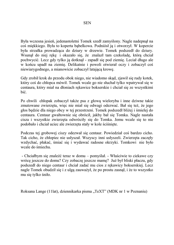 SEN Była wczesna jesień, jedenastoletni Tomek szedł zamyślony. Nagle nadepnął na coś miękkiego. Była to koperta bąbelkowa. Podniósł ją i otworzył. W kopercie była strzałka prowadząca do dziury w drzewie. Tomek podszedł do dziury. Wsunął do niej rękę i okazało się, że znalazł tam czekoladę, którą chciał pochwycić. Lecz gdy tylko ją dotknął - zapadł się pod ziemię. Leciał długo ale w końcu upadł na ziemię. Delikatnie i powoli otwierał oczy i zobaczył coś niewiarygodnego, a mianowicie zobaczył latającą krowę. Gdy zrobił krok do przodu obok niego, nie wiadomo skąd, zjawił się rudy kotek, który coś do chłopca mówił. Tomek wcale go nie słuchał tylko wpatrywał się w centaura, który miał na dłoniach rękawice bokserskie i chciał się ze wszystkimi bić. Po chwili chłopak zobaczył także psa z głową wieloryba i inne dziwne takie zmutowane zwierzęta, więc nie miał się odwagi odezwać. Bał się też, że jego głos będzie dla niego obcy w tej przestrzeni. Tomek podszedł bliżej i śmielej do centaura. Centaur gwałtownie się obrócił, jakby bał się Tomka. Nagle nastała cisza i wszystkie zwierzęta odwróciły się do Tomka. Jemu wcale się to nie podobało i chciał uciec ale zwierzęta stały w kole ściśnięte. Podczas tej grobowej ciszy odezwał się centaur. Powiedział coś bardzo cicho. Tak cicho, że chłopiec nie usłyszał. Wszyscy inni usłyszeli. Zwierzęta zaczęły wzdychać, płakać, śmiać się i wydawać radosne okrzyki. Tomkowi nie było wcale do śmiechu. - Chciałbym się znaleźć teraz w domu – pomyślał. - Właściwie to ciekawe czy wrócę jeszcze do domu? Czy zobaczę jeszcze mamę? Już był bliski płaczu, gdy podszedł do niego centaur i chciał zadać mu cios z rękawicy bokserskiej. Lecz nagle Tomek obudził się i z ulgą zauważył, że po prostu zasnął, i że to wszystko mu się tylko śniło. Roksana Lange (11lat), dziennikarka pisma „TeXT” (MDK nr 1 w Poznaniu)