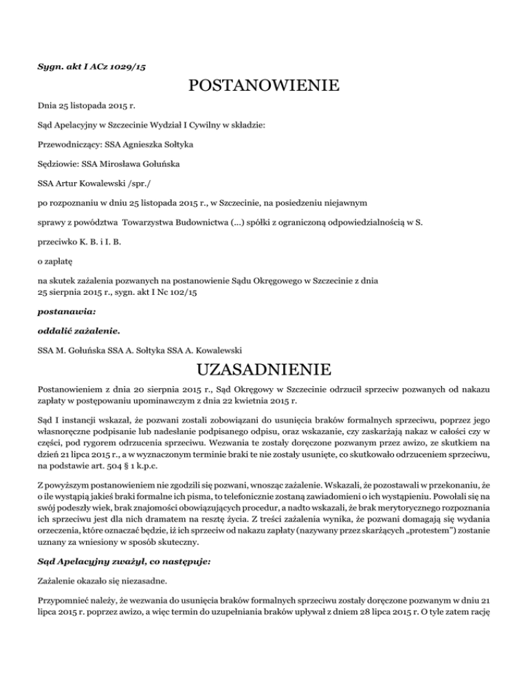 Sygn. akt I ACz 1029/15 POSTANOWIENIE Dnia 25 listopada 2015 r. Sąd Apelacyjny w Szczecinie Wydział I Cywilny w składzie: Przewodniczący: SSA Agnieszka Sołtyka Sędziowie: SSA Mirosława Gołuńska SSA Artur Kowalewski /spr./ po rozpoznaniu w dniu 25 listopada 2015 r., w Szczecinie, na posiedzeniu niejawnym sprawy z powództwa Towarzystwa Budownictwa (...) spółki z ograniczoną odpowiedzialnością w S. przeciwko K. B. i I. B. o zapłatę na skutek zażalenia pozwanych na postanowienie Sądu Okręgowego w Szczecinie z dnia 25 sierpnia 2015 r., sygn. akt I Nc 102/15 postanawia: oddalić zażalenie. SSA M. Gołuńska SSA A. Sołtyka SSA A. Kowalewski UZASADNIENIE Postanowieniem z dnia 20 sierpnia 2015 r., Sąd Okręgowy w Szczecinie odrzucił sprzeciw pozwanych od nakazu zapłaty w postępowaniu upominawczym z dnia 22 kwietnia 2015 r. Sąd I instancji wskazał, że pozwani zostali zobowiązani do usunięcia braków formalnych sprzeciwu, poprzez jego własnoręczne podpisanie lub nadesłanie podpisanego odpisu, oraz wskazanie, czy zaskarżają nakaz w całości czy w części, pod rygorem odrzucenia sprzeciwu. Wezwania te zostały doręczone pozwanym przez awizo, ze skutkiem na dzień 21 lipca 2015 r., a w wyznaczonym terminie braki te nie zostały usunięte, co skutkowało odrzuceniem sprzeciwu, na podstawie art. 504 § 1 k.p.c. Z powyższym postanowieniem nie zgodzili się pozwani, wnosząc zażalenie. Wskazali, że pozostawali w przekonaniu, że o ile wystąpią jakieś braki formalne ich pisma, to telefonicznie zostaną zawiadomieni o ich wystąpieniu. Powołali się na swój podeszły wiek, brak znajomości obowiązujących procedur, a nadto wskazali, że brak merytorycznego rozpoznania ich sprzeciwu jest dla nich dramatem na resztę życia. Z treści zażalenia wynika, że pozwani domagają się wydania orzeczenia, które oznaczać będzie, iż ich sprzeciw od nakazu zapłaty (nazywany przez skarżących „protestem”) zostanie uznany za wniesiony w sposób skuteczny. Sąd Apelacyjny zważył, co następuje: Zażalenie okazało się niezasadne. Przypomnieć należy, że wezwania do usunięcia braków formalnych sprzeciwu zostały doręczone pozwanym w dniu 21 lipca 2015 r. poprzez awizo, a więc termin do uzupełniania braków upływał z dniem 28 lipca 2015 r. O tyle zatem rację mają skarżący twierdząc w zażaleniu, że wezwania te nie zostały im fizycznie doręczone. Nie oznacza to jednak, że doręczeni zastępcze nie wywołało skutku w postaci początku biegu terminu do dokonania przez powodów czynności, do której w tym wezwaniu zostali zobowiązani. Przepis art. 139 § 1 k.p.c., przewiduje uznanie przesyłki za doręczoną, po jej uprzednim awizowaniu w trybie przepisów rozporządzenia Ministra Sprawiedliwości z dnia 123 października 2010 r. w sprawie szczegółowego trybu doręczania pism sądowych przez pocztę w postępowaniu cywilnym (Dz.U.2015.1222 tekst jednolity) Doręczenie przewidziane w art. 139 § 1 k.p.c. oparte jest na domniemaniu, że pismo sądowe dotarło do rąk adresata i że w ten sposób doręczenie zostało dokonane prawidłowo (tak min. Sąd Najwyższy w wyroku z dnia 4 lipca 2002 r., I CKN 861/00, LEX nr 56892. Domniemanie to ma charakter domniemania prawnego (vide: wyrok Sądu Najwyższego z dnia 26 września 2001 r., I PKN 656/00, OSNP 2003/20/483), a zatem - stosownie do dyspozycji art. 234 k.p.c. - może być obalone wyłącznie w drodze przeprowadzenia dowodu przeciwnego. Specyfika doręczenia dokonywanego w trybie art. 139 § 1 k.p.c. przejawia się między innymi w tym, że Przewodniczący oceniając skuteczność tzw. awizowania, przyjmuje - przy braku odmiennych adnotacji doręczyciela - że adresat w okresie tym przebywa w miejscu zamieszkania, a nieodebranie przesyłki jest wynikiem jego suwerennej decyzji. Stronie nie można zatem odmówić uprawnienia do wykazania, że tego rodzaju założenie odbiegało od rzeczywistego stanu rzeczy, o ile jej zachowanie nie uchybiało obowiązkom określonym w przepisach kpc., zwłaszcza jeśli zważyć na doniosłość konsekwencji, jakie dla jej sytuacji procesowej wywołuje zarządzenie oparte na w/w podstawach. Tymczasem jednak w zażaleniu na tego rodzaju okoliczności pozwani w ogóle się nie powoływali, skutkiem czego brak było podstaw do zakwestionowania skuteczności doręczenia im – w sposób zastępczy – wezwań do usunięcia braków formalnych sprzeciwu. Analiza akt sprawy wskazuje, że słusznie Sąd Okręgowy uznał, iż w sprawie pozwani nie usunęli braku formalnego sprzeciwu, szczegółowo opisanych w uzasadnieniu zaskarżonego postanowienia. Sami skarżący tego faktu nie kwestionują. Nie istniała zatem jakakolwiek podstawa faktyczna i prawna do zakwestionowania skuteczności tego orzeczenia. Zgodnie z art. 504 § 1 k.p.c. sąd odrzuca sprzeciw, którego braków strona nie uzupełniła w terminie. Oznacza to, że odrzucenie sprzeciwu jest obowiązkiem sądu, w każdym takim przypadku, przy czym bez znaczenia pozostaje to, z jakich przyczyn strona braków sprzeciwu nie uzupełniła. Dołączenie egzemplarza podpisanego przez pozwanych sprzeciwu do zażalenia, jako czynność dokonana po upływie terminu, jest bezskuteczna (art. 167 k.p.c.). Nie mają zatem z tego punktu widzenia znaczenia wskazywane w zażaleniu okoliczności, dotyczące braku znajomości procedury cywilnej, w której nie istnieje możliwość dokonywania czynności procesowych drogą telefoniczną. Stanowić one bowiem mogą (podobnie jak odwołanie się do nieporadności, czy podeszłego wieku) co najwyżej uzasadnienie twierdzenia, że pozwani nie ponoszą winy za uchybienie terminu do wniesienia sprzeciwu, na którym może zostać z kolei oparty wniosek przywrócenie terminu do wniesienia takiego sprzeciwu. O ile intencją skarżących jest złożenie tego rodzaju wniosku, winni to uczynić – bezpośrednio w Sądzie Okręgowym - w terminie 7 dni, od daty otrzymania odpisu niniejszego posta